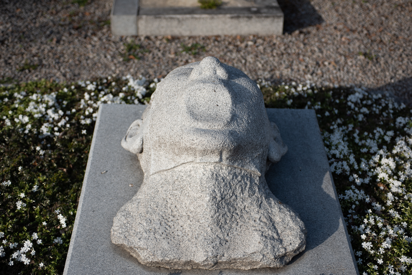얼굴에 백지를 여려겹 입혀 질식사 한 모습의 조형물