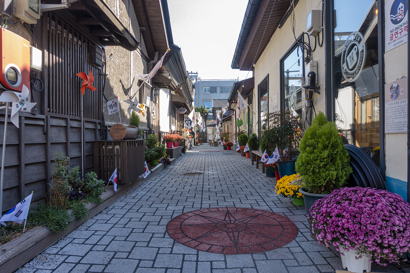 화단에 꽂혀있는 태극기와 국화꽃들이 조화롭게 어울리며 아름다움을 연출한다.