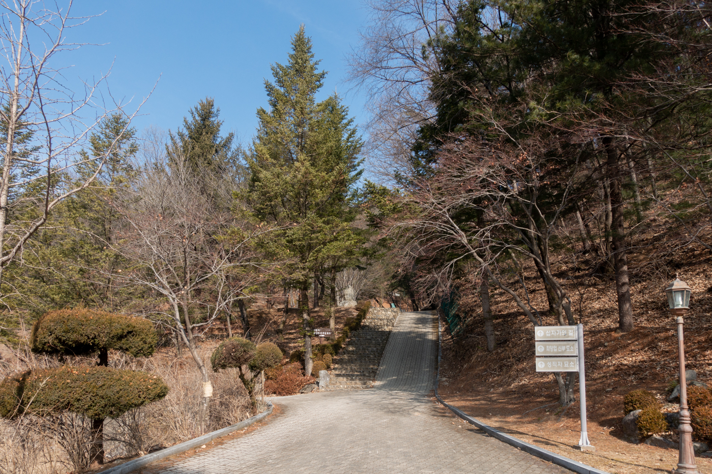 성모상을 지나면 십자가의 길, 최양업신부 묘소, 성직자 묘소로 올라가는 표지판이 보인다.
