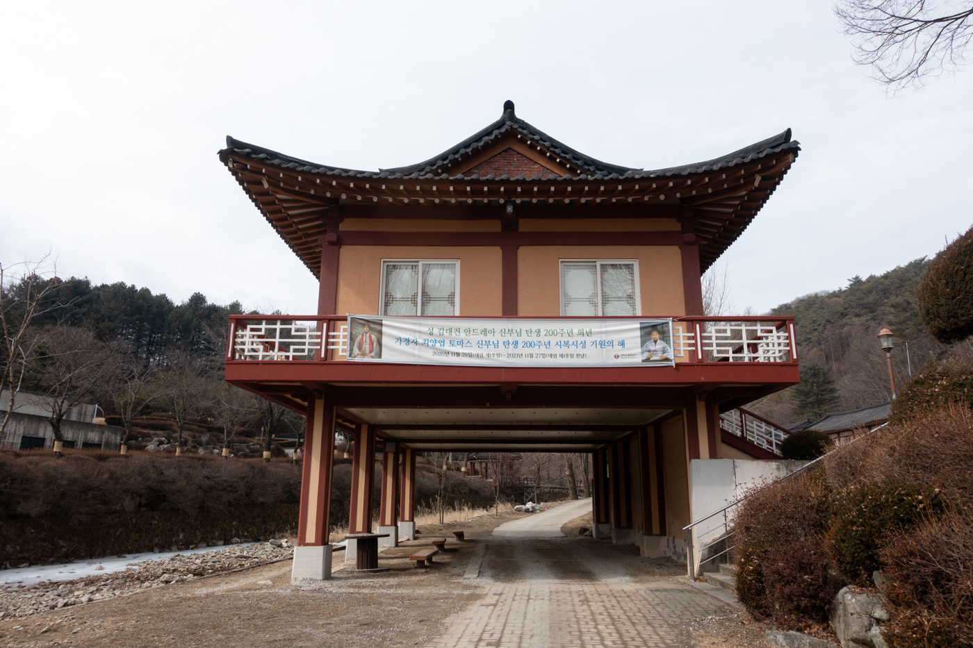 배론성지 중앙을 가로지르는 개울가 옆으로는 누각형태로 지어진 한옥성당이 있다.