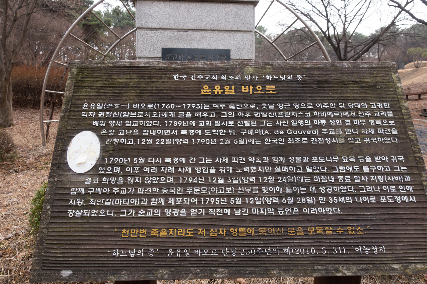 초입에 '순교자 파평 윤유일 바오로 순국 이백주년 현양 기념비'가 세워져 있다.