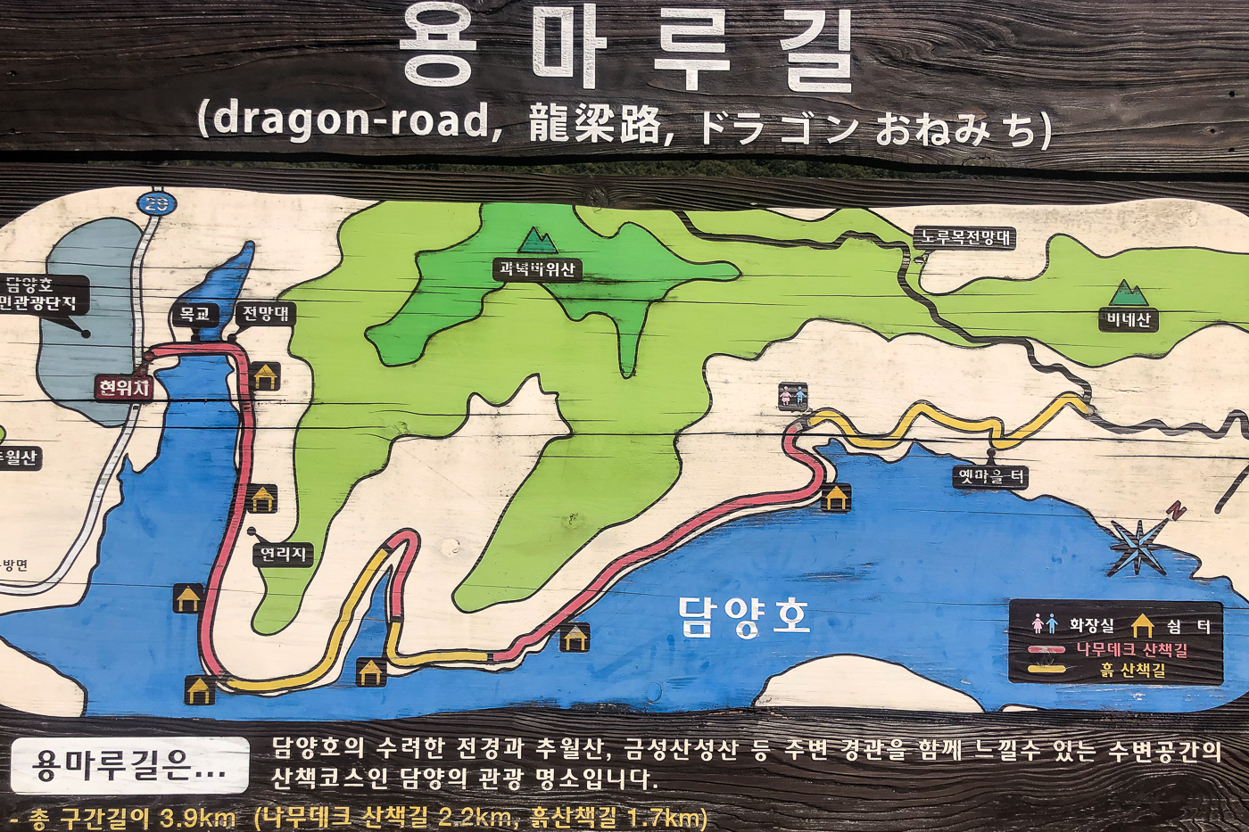 총 구간 길이는 3.9Km (나무데크 산책길 2.2km, 흙산책길 1.7km)인데
