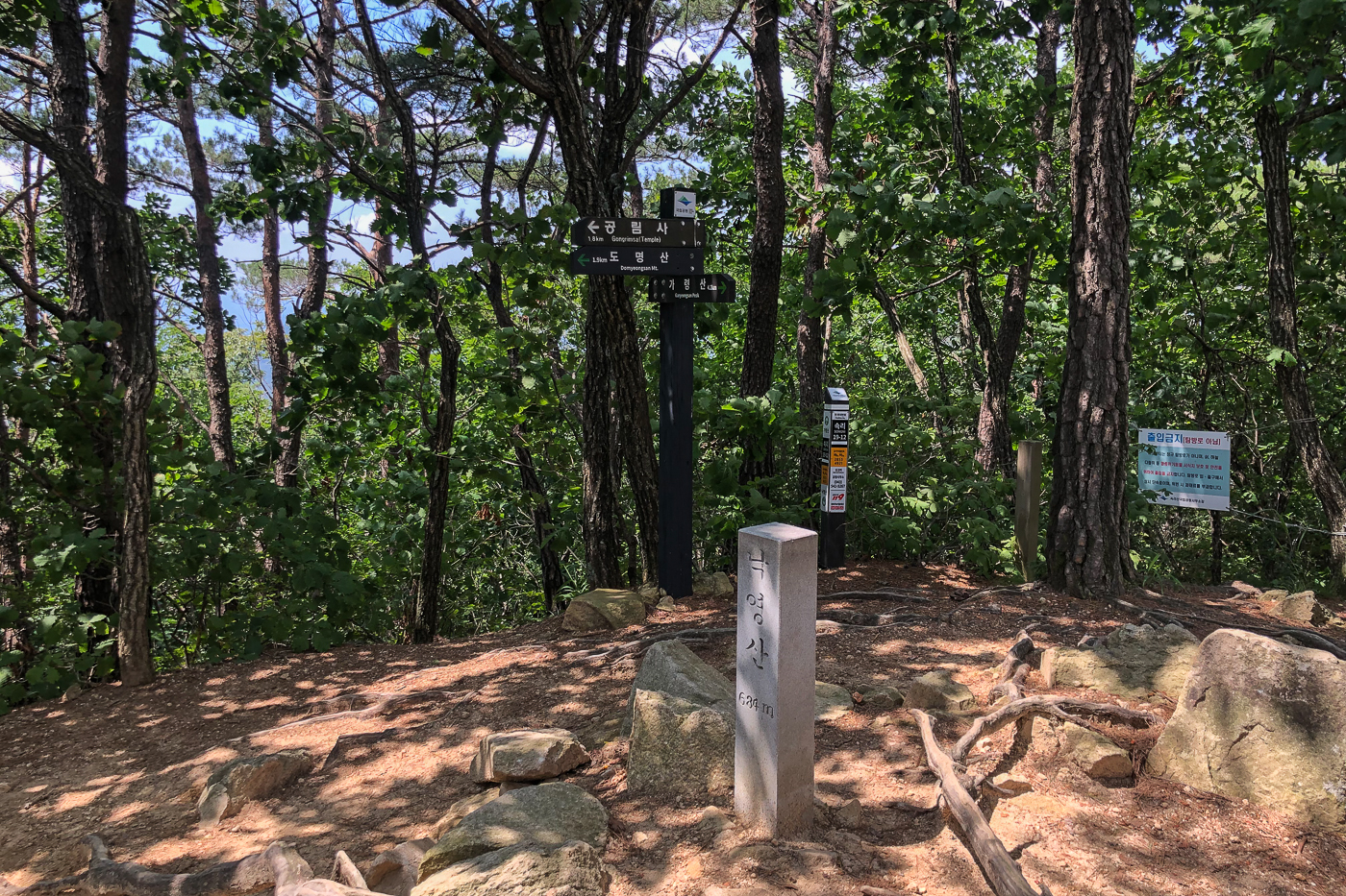 미륵산성 안내표시판 뒤 우리가 내려온 길에 출입금지 팻말이 보인다.