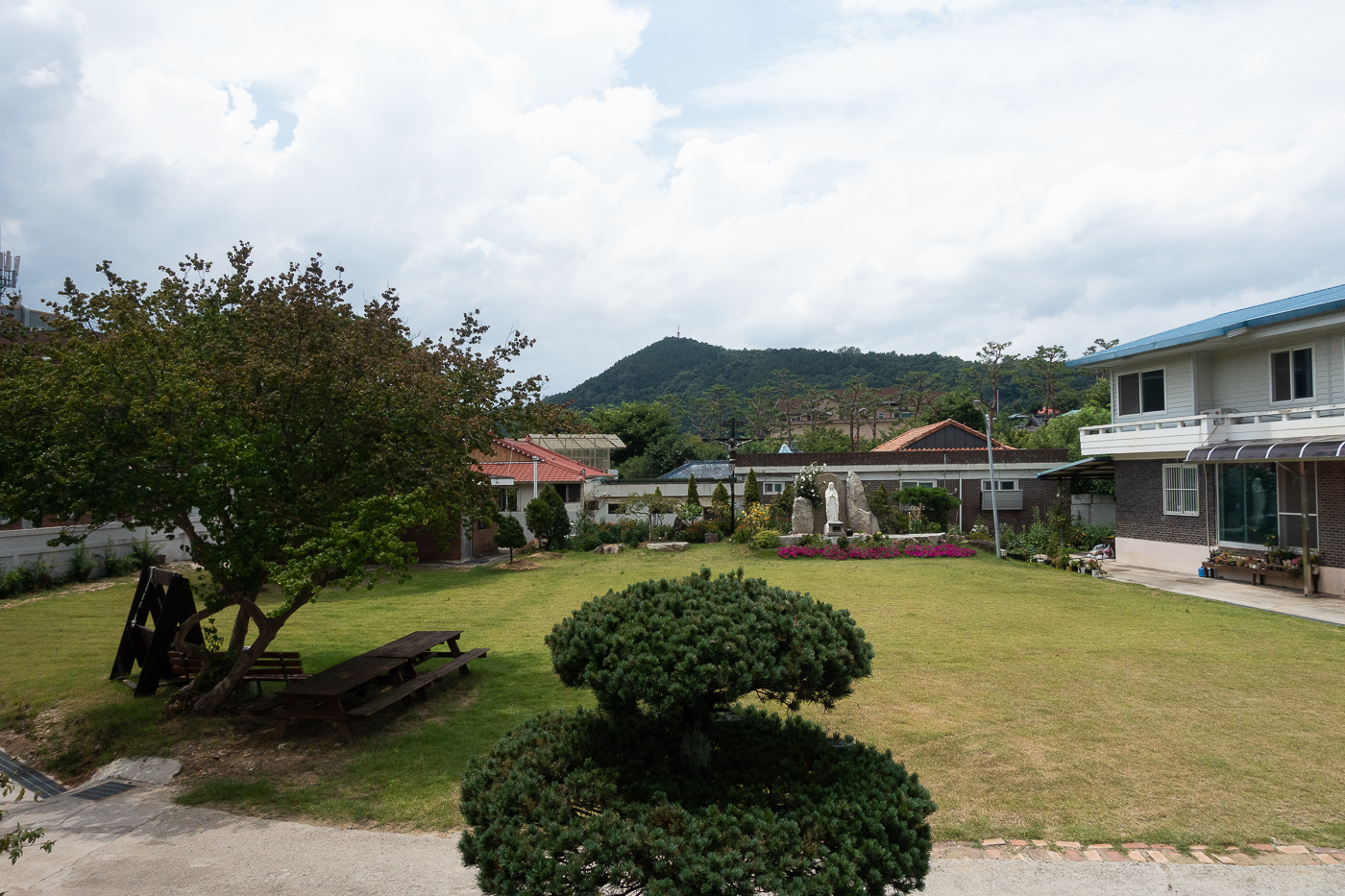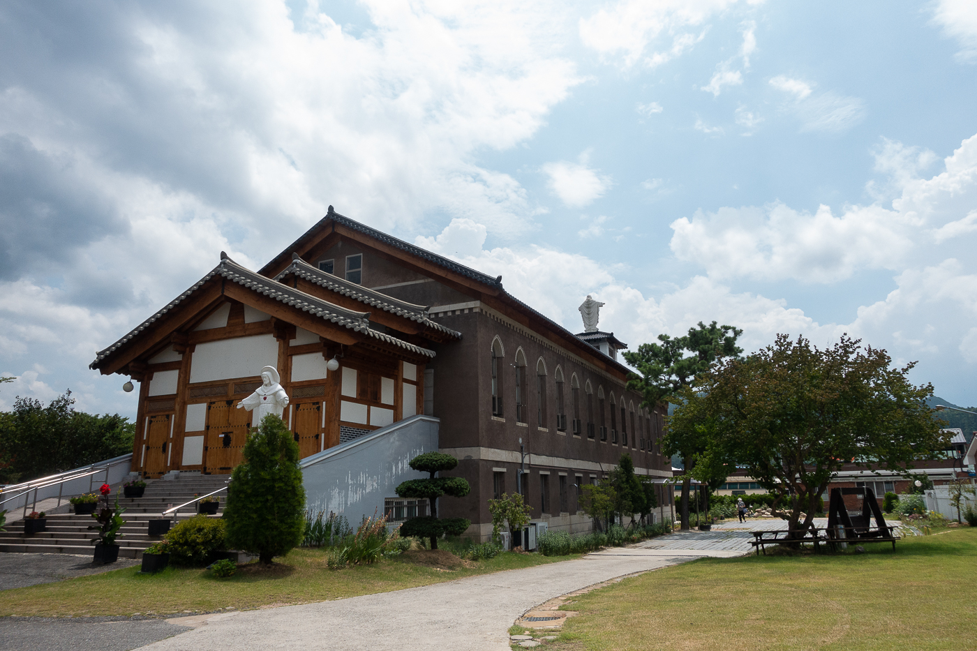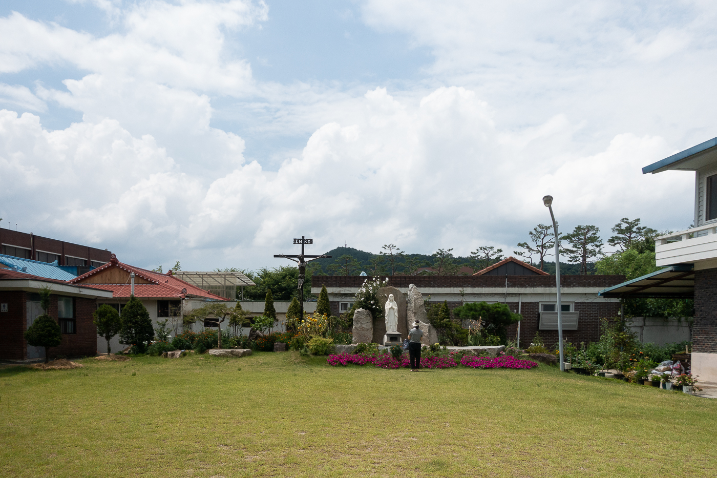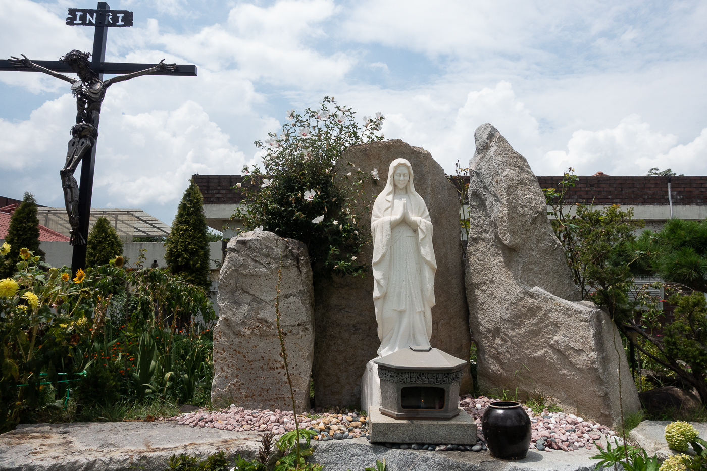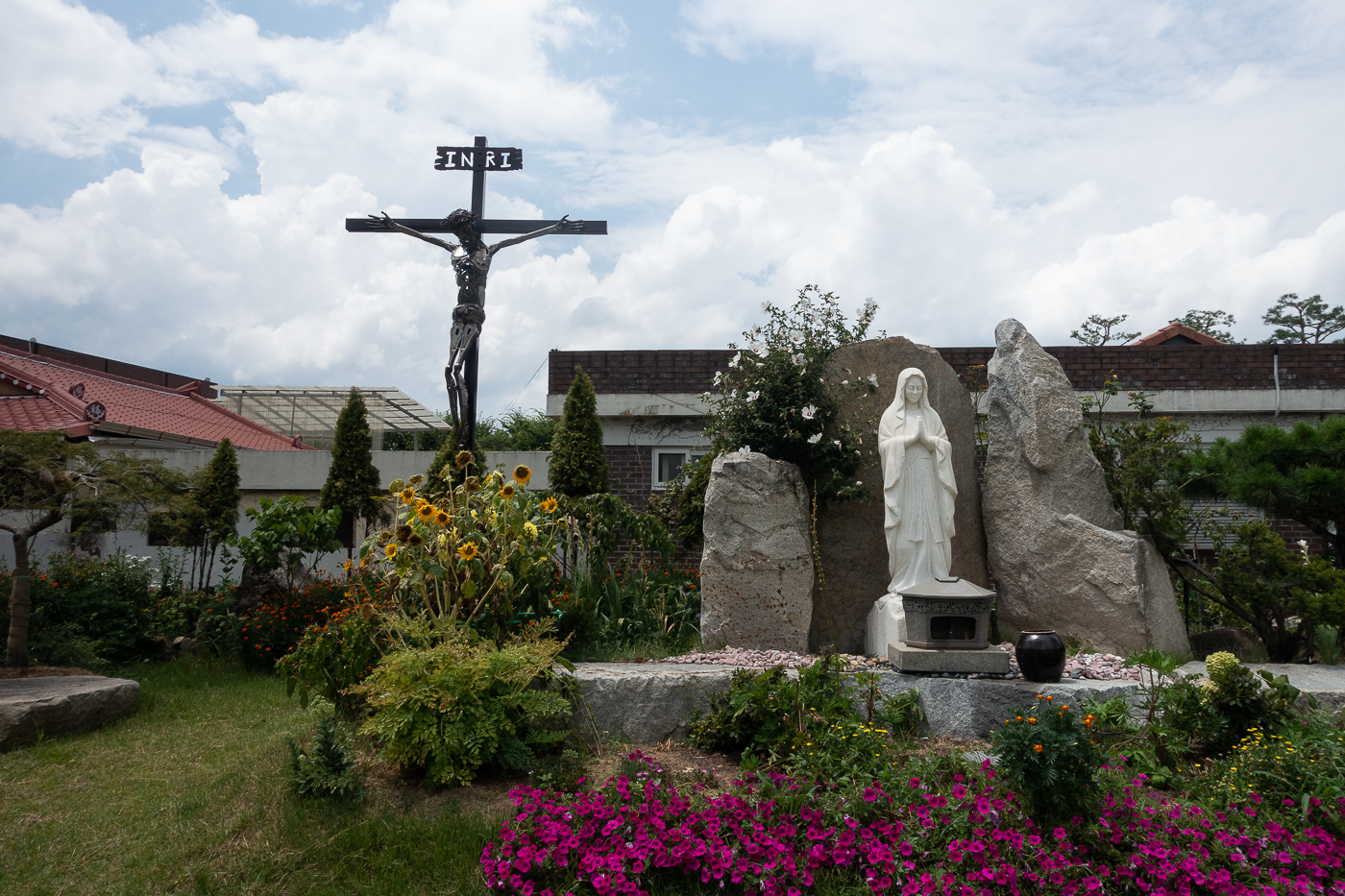 성당 우측으로 확 트인 잔디밭에는 성모님과 십자고상이 모셔져 있다.