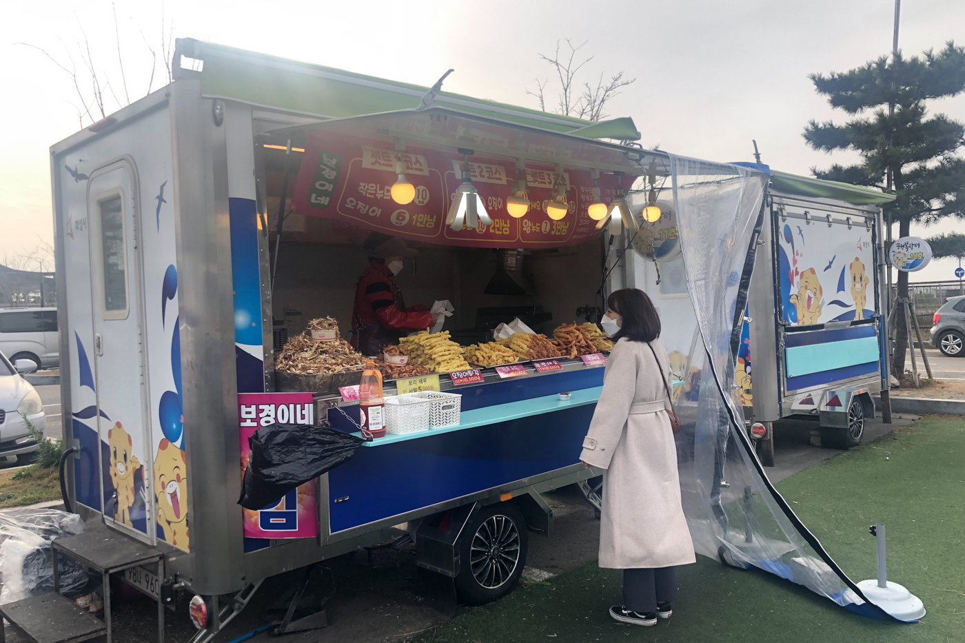 튀김을 파는 포장마차들이 늘어서 있는데 오픈한 가게는 절반이 안된다.