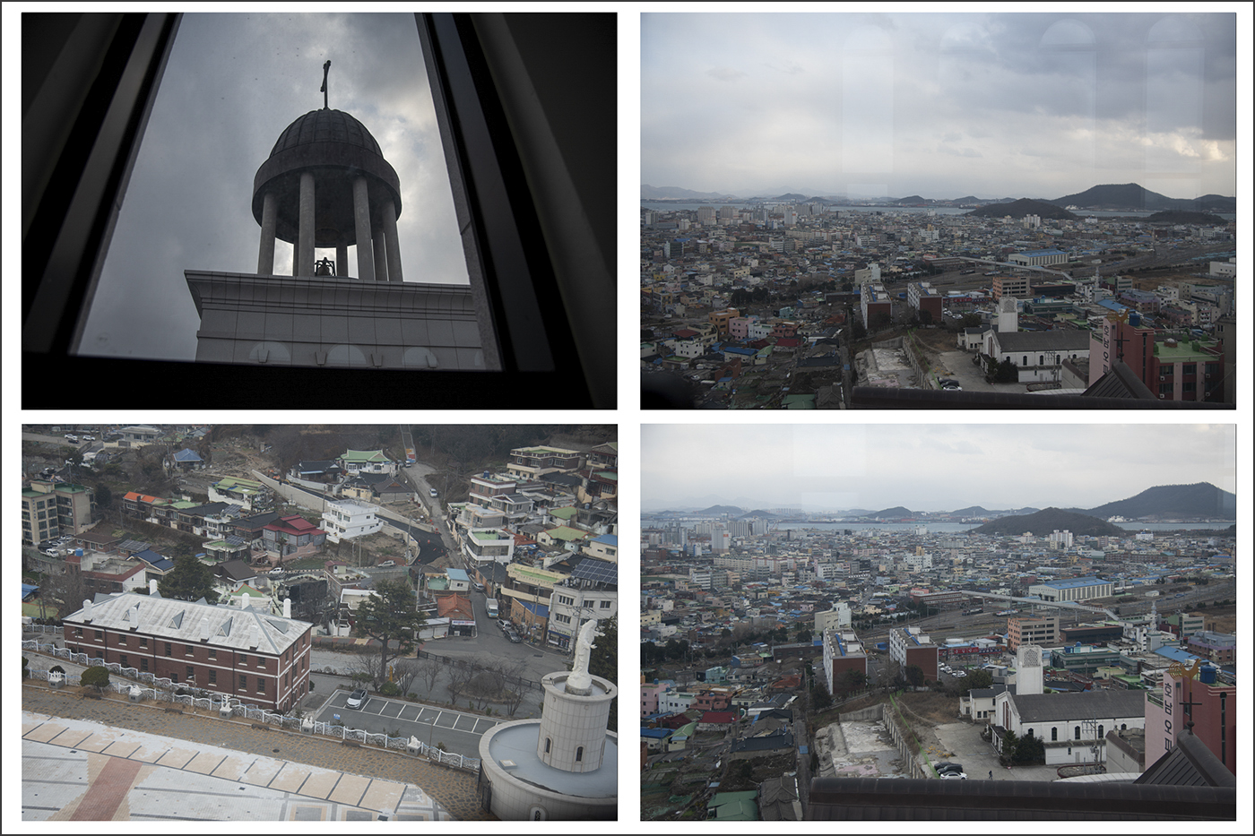 엘리베이터를 이용해 5층 옥상전망대로 올라갔다. 종탑과 목포시내, 옛 산정동성당도 보인다.(하단 우측)