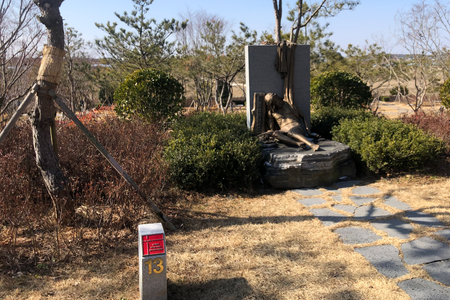 교리당 아래로 조성되어 있는 십자가의 길 조형물들이 예슬작품이다. 14처 표시도 특이하다.