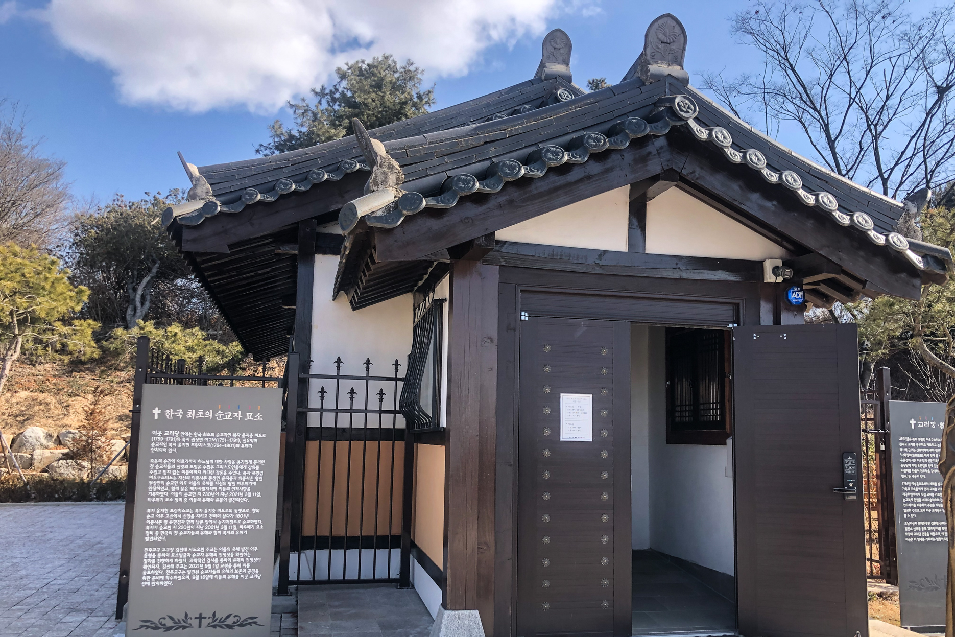 좌측에 '조선천주교 최초 교리당'이라는 표지석이 세워져 있다.