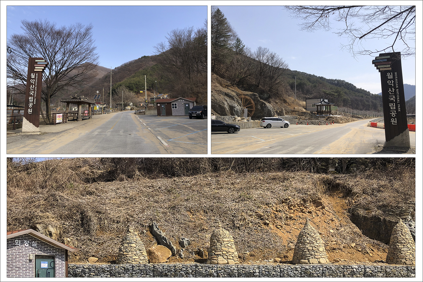 안생달 공영주차장의 모습 -돌탑, 물레방아도 설치해 놓았고 화장실도 있다-