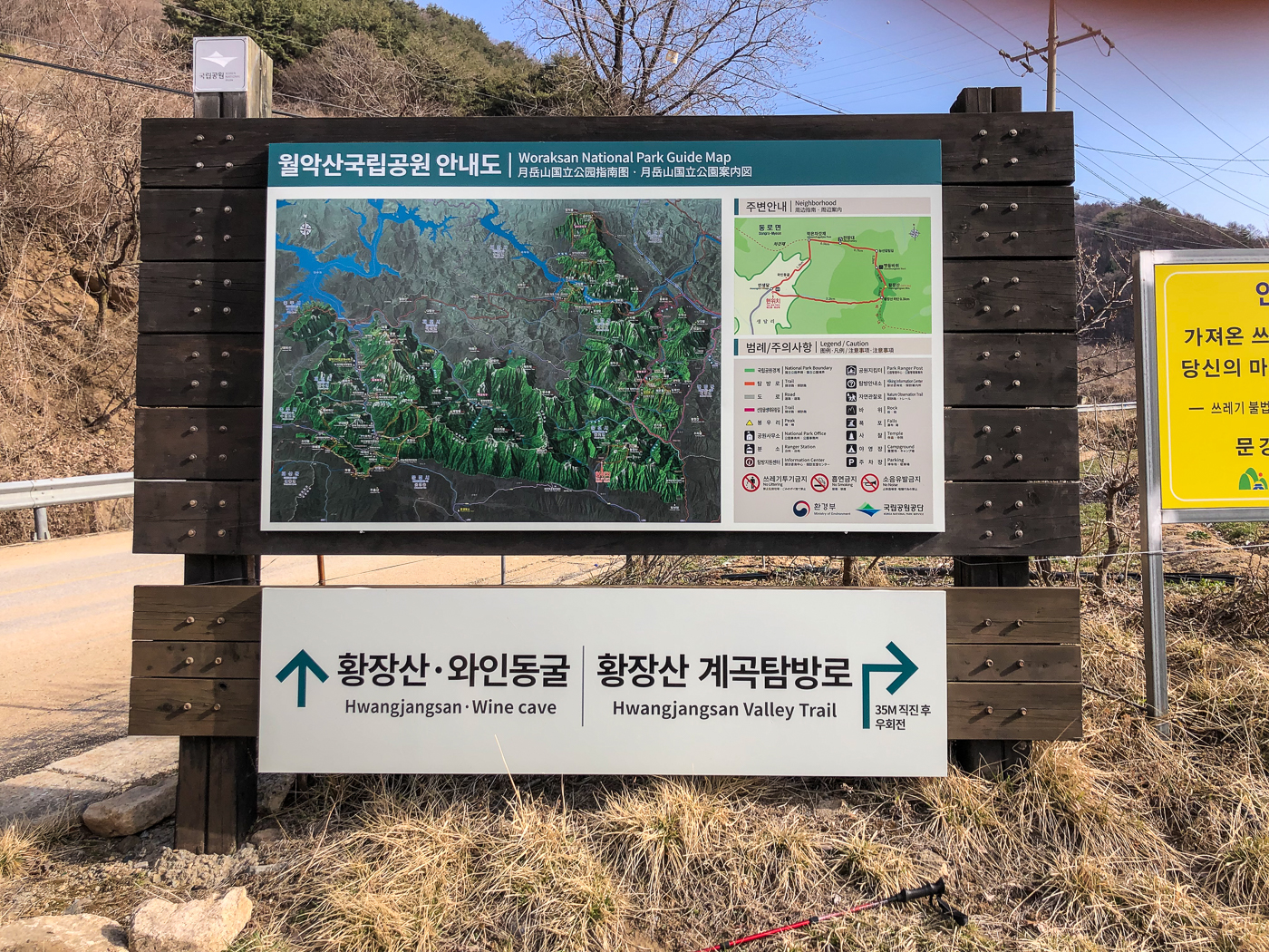 계곡탐방로로 우회전 하는 장소에 세워져 있는 '월악산국립공원 안내도'