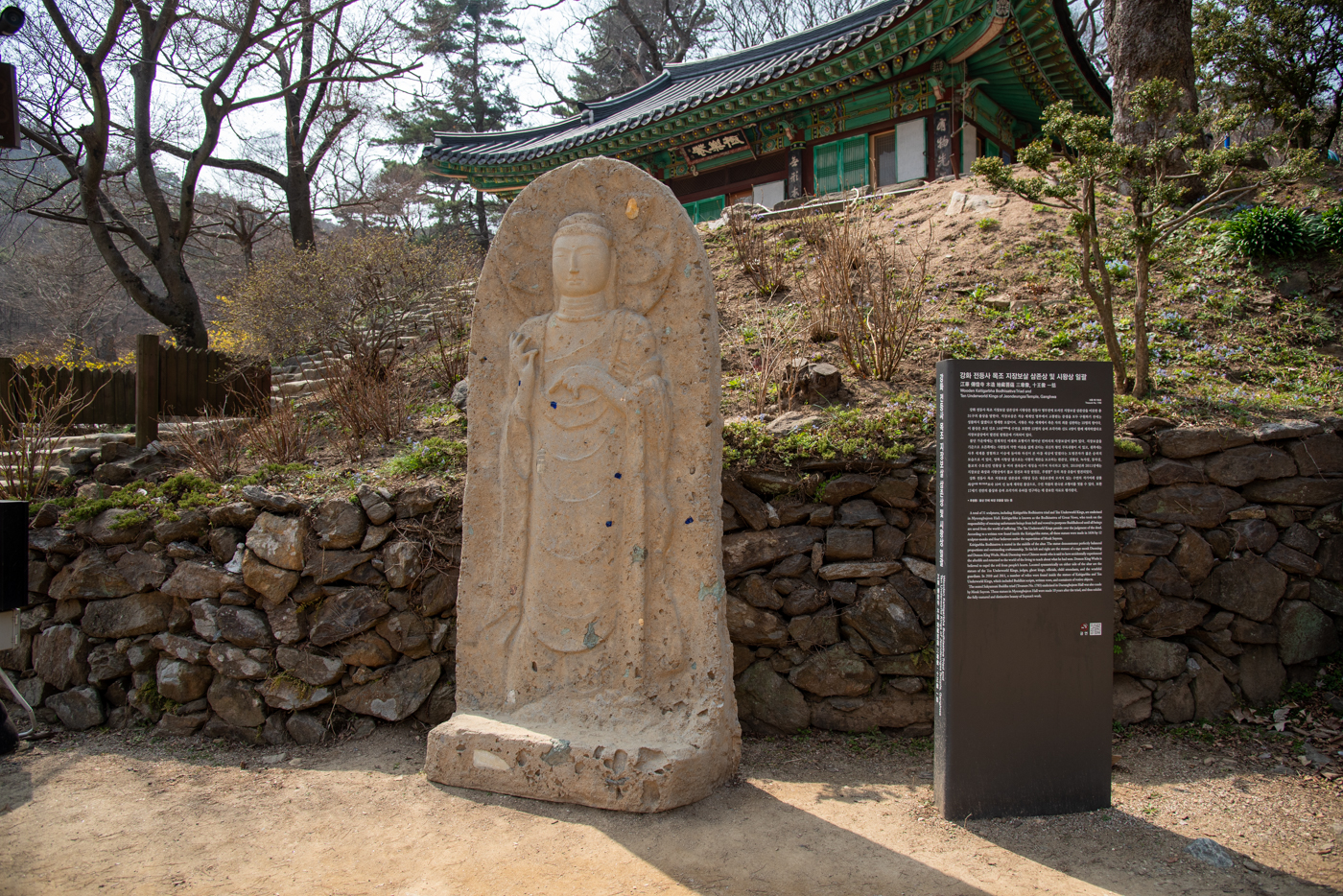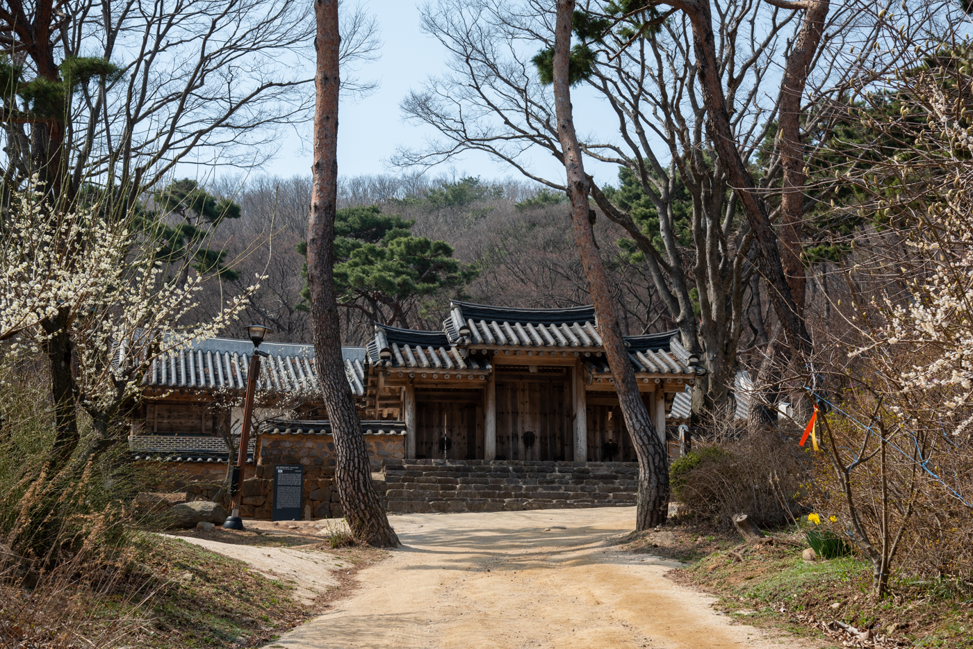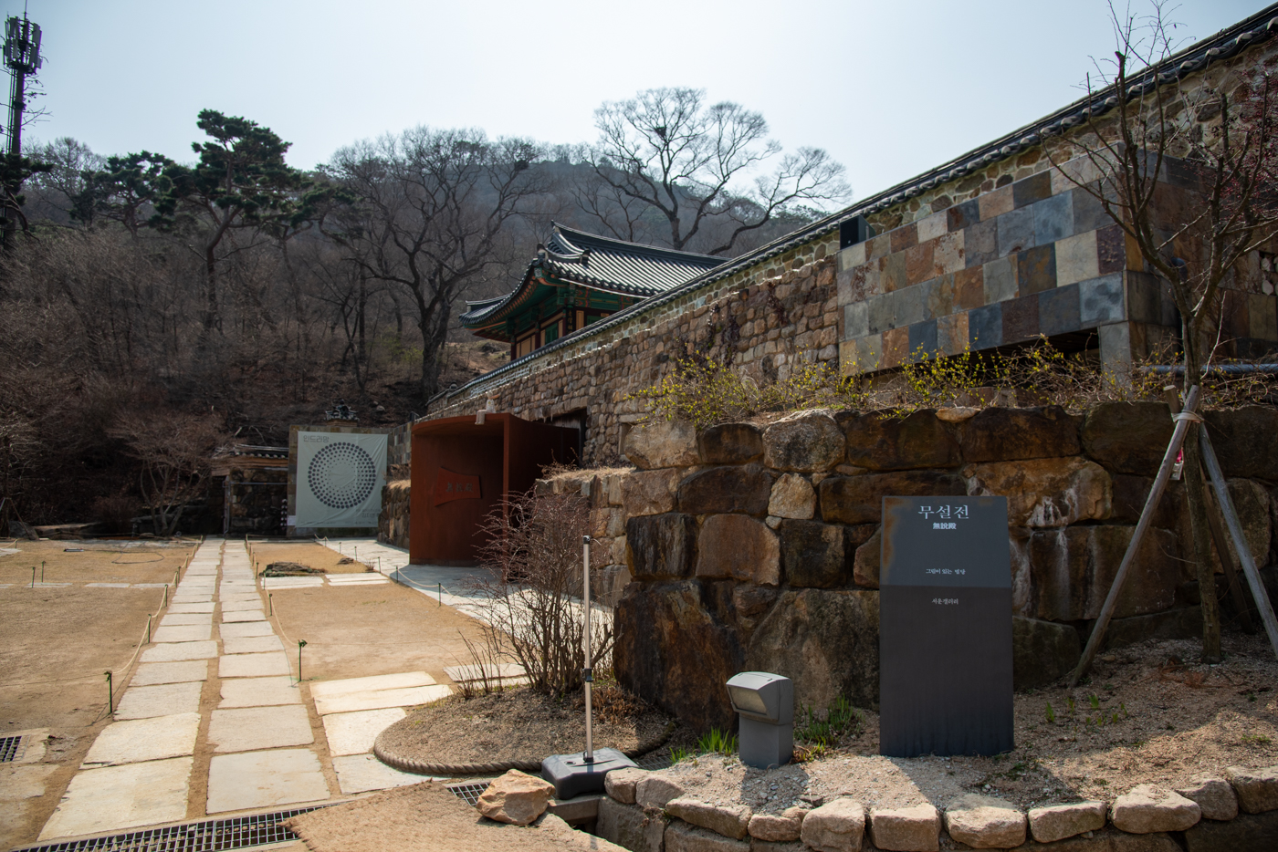 전등사 동문의 모습, 우측에는 사적 제130호인 강화 삼랑성에 대한 안내표지판이 보인다.