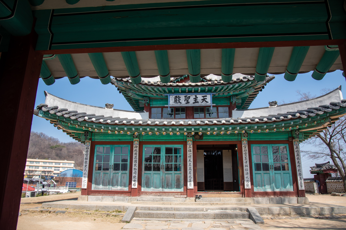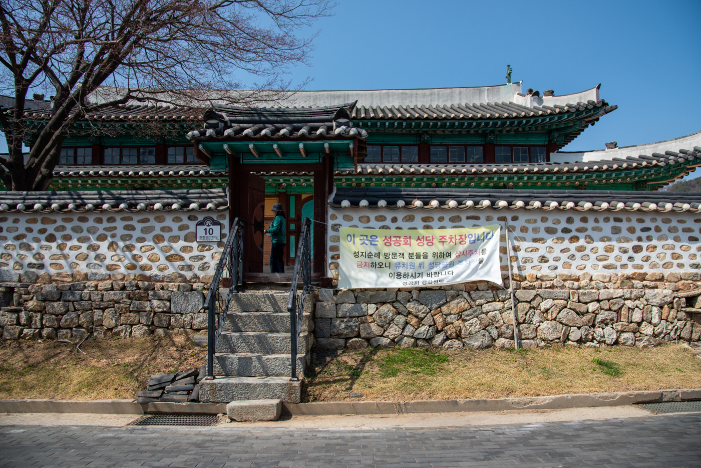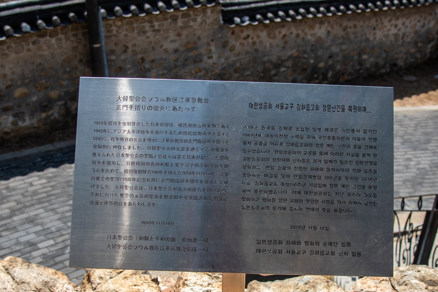 가파른 계단 위로 한옥식 대문이 활짝 열려 있고 현판은 '聖公會江華聖堂'이라고 씌어 있다.