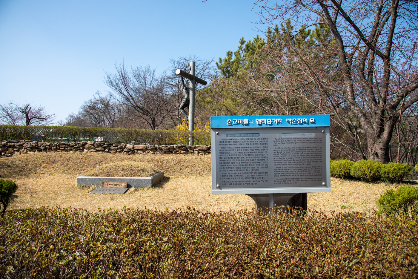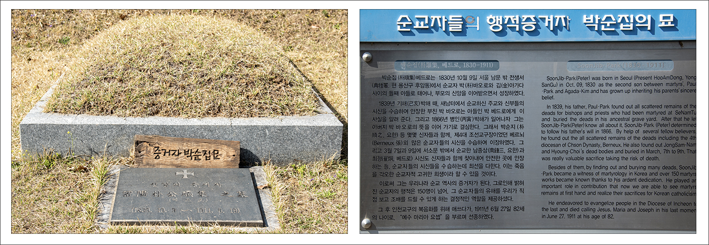 십자가상 뒤편으로 순교자들의 행적증거자 '박순집 베드로'의 묘가 있다.