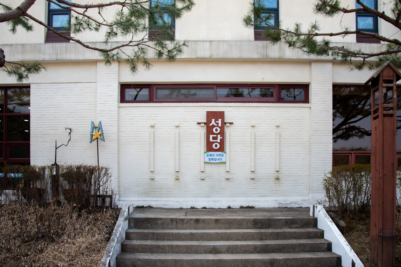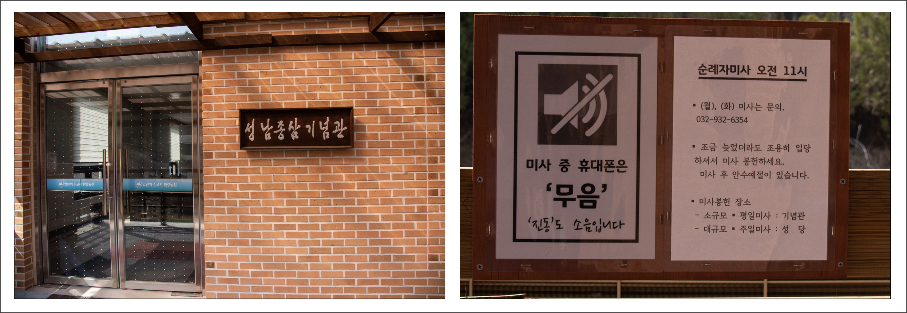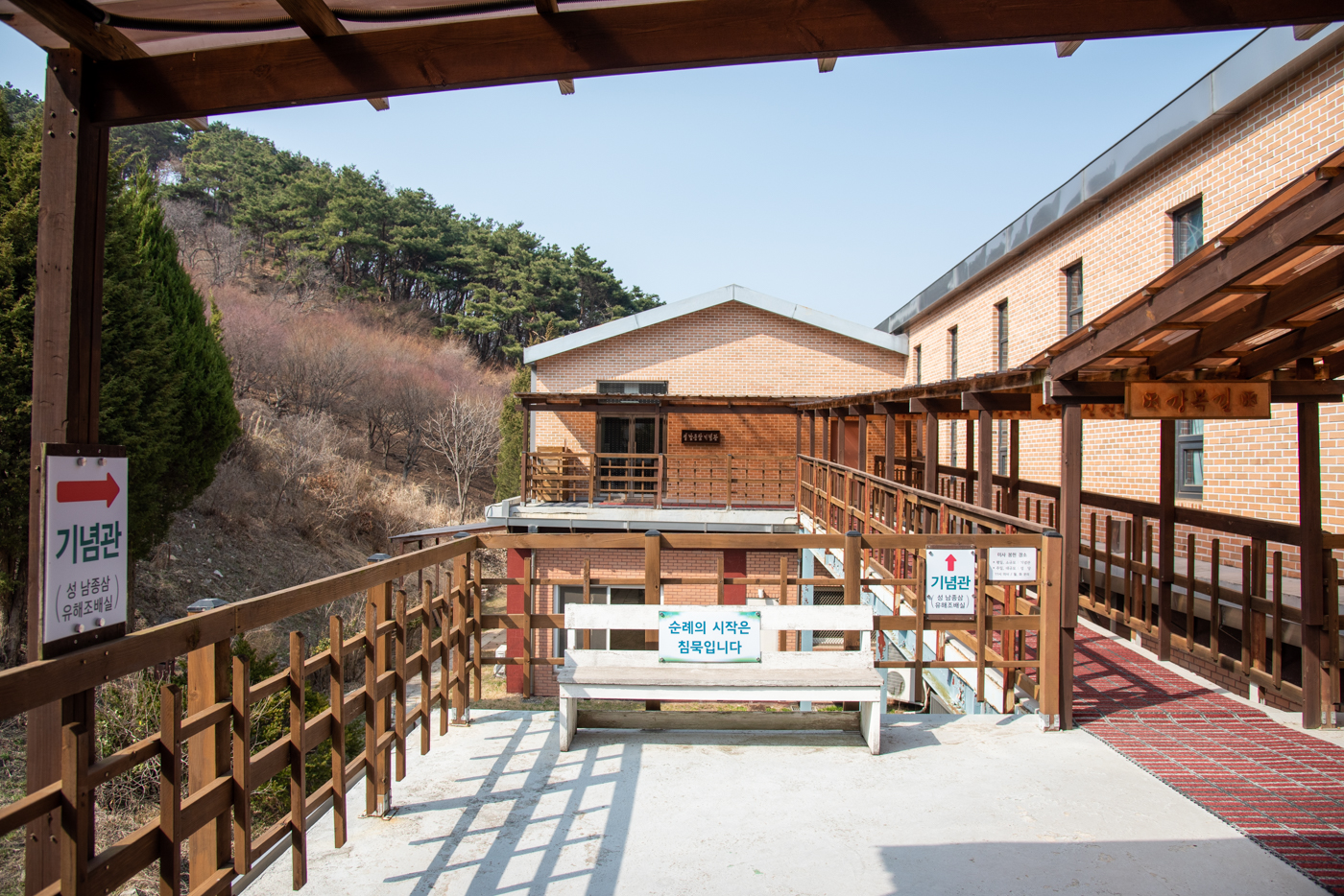 차를 주차하고 계단을 올라가면 성당 표시와 함께 '순례의 시작은 침묵입니다'라는 문구가 눈에 들어온다.