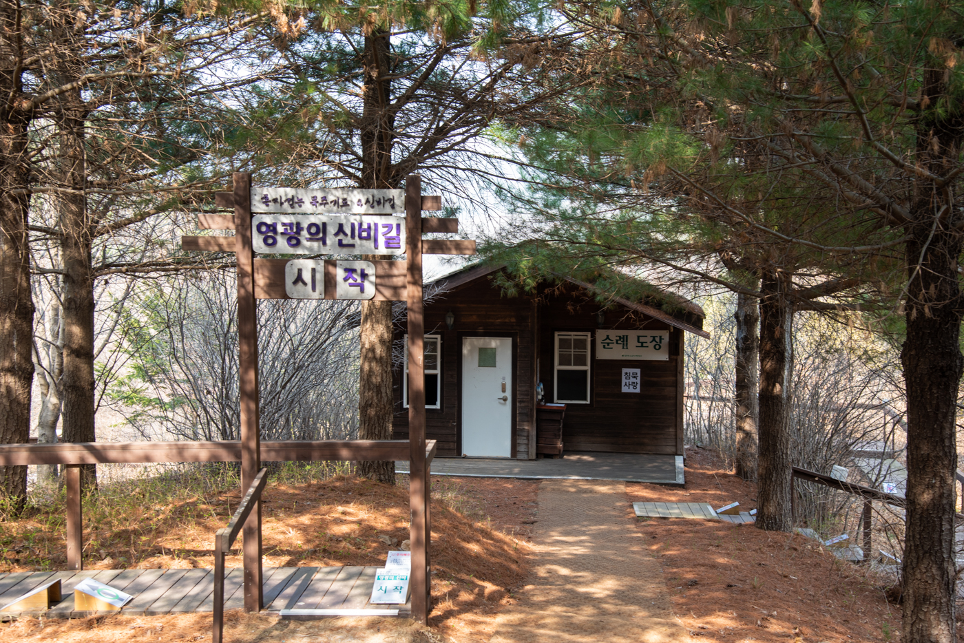 '순교자현양당' 에도 '순례의 시작은 침묵입니다' 라는 현수막이 걸려 있다.