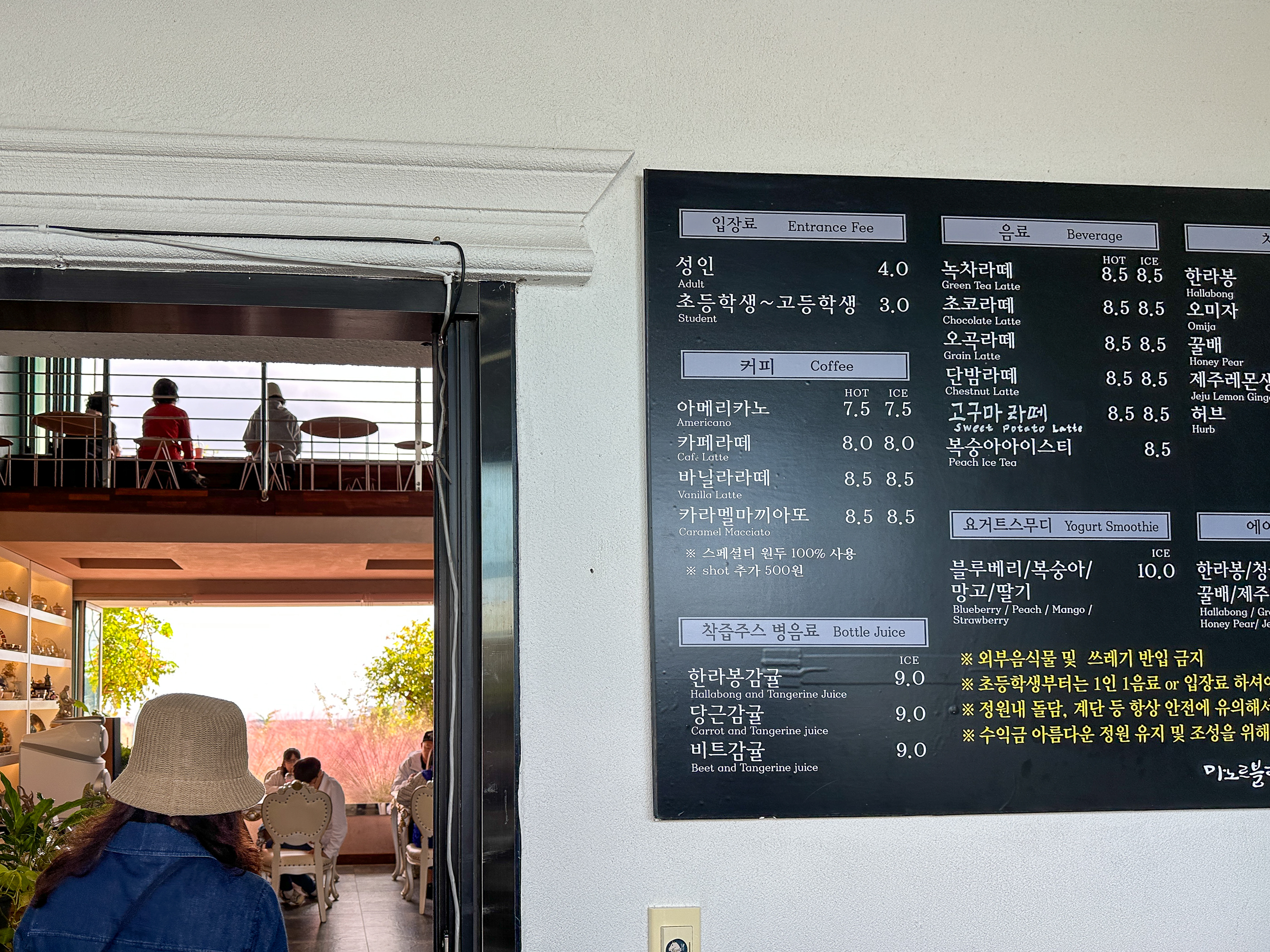 가든 카페 '마노르블랑'에 입장하려면 카페를 통과해야 하는데 입장료를 내거나 또는 1인1음료를 주문하면 된다.