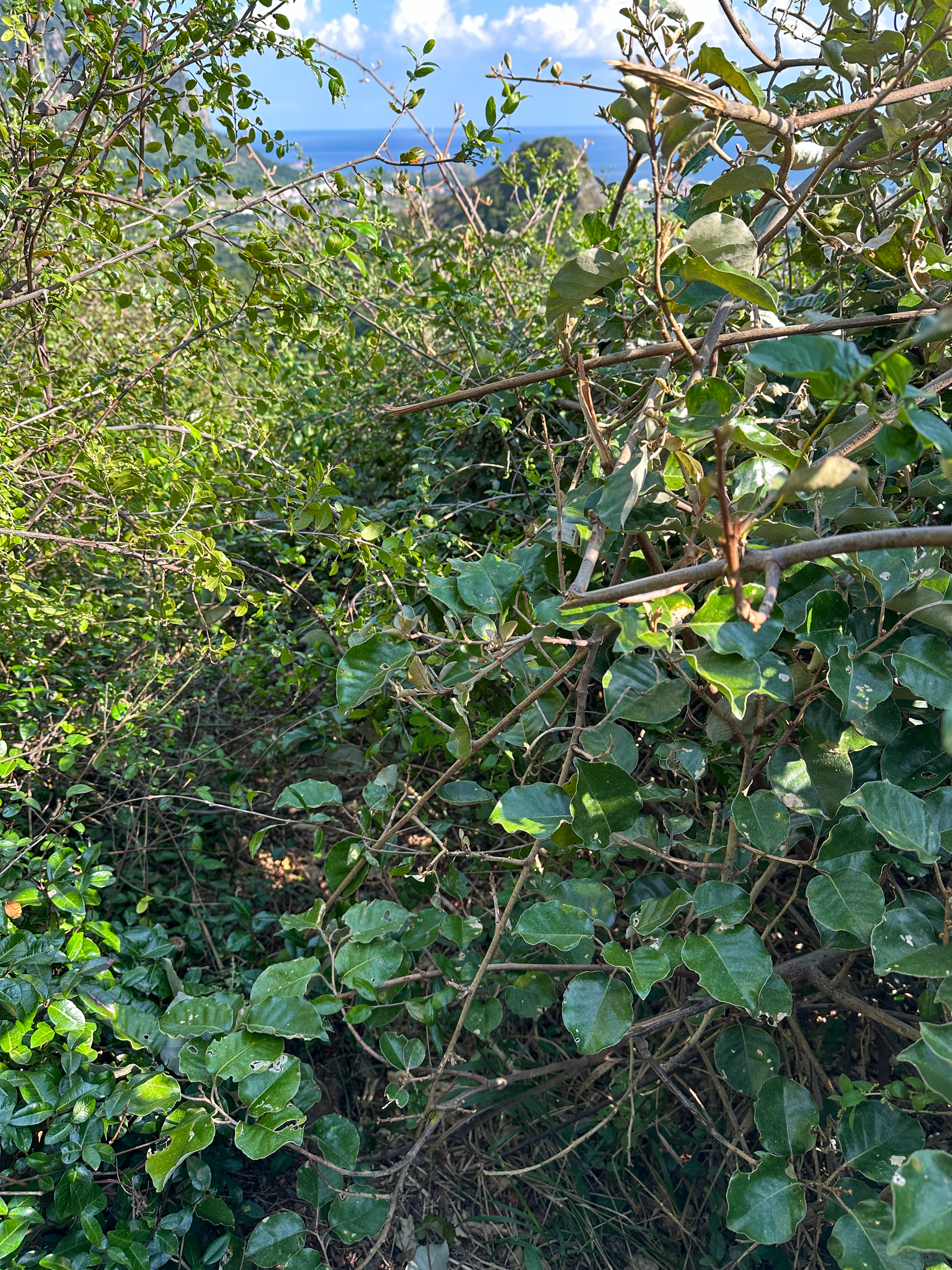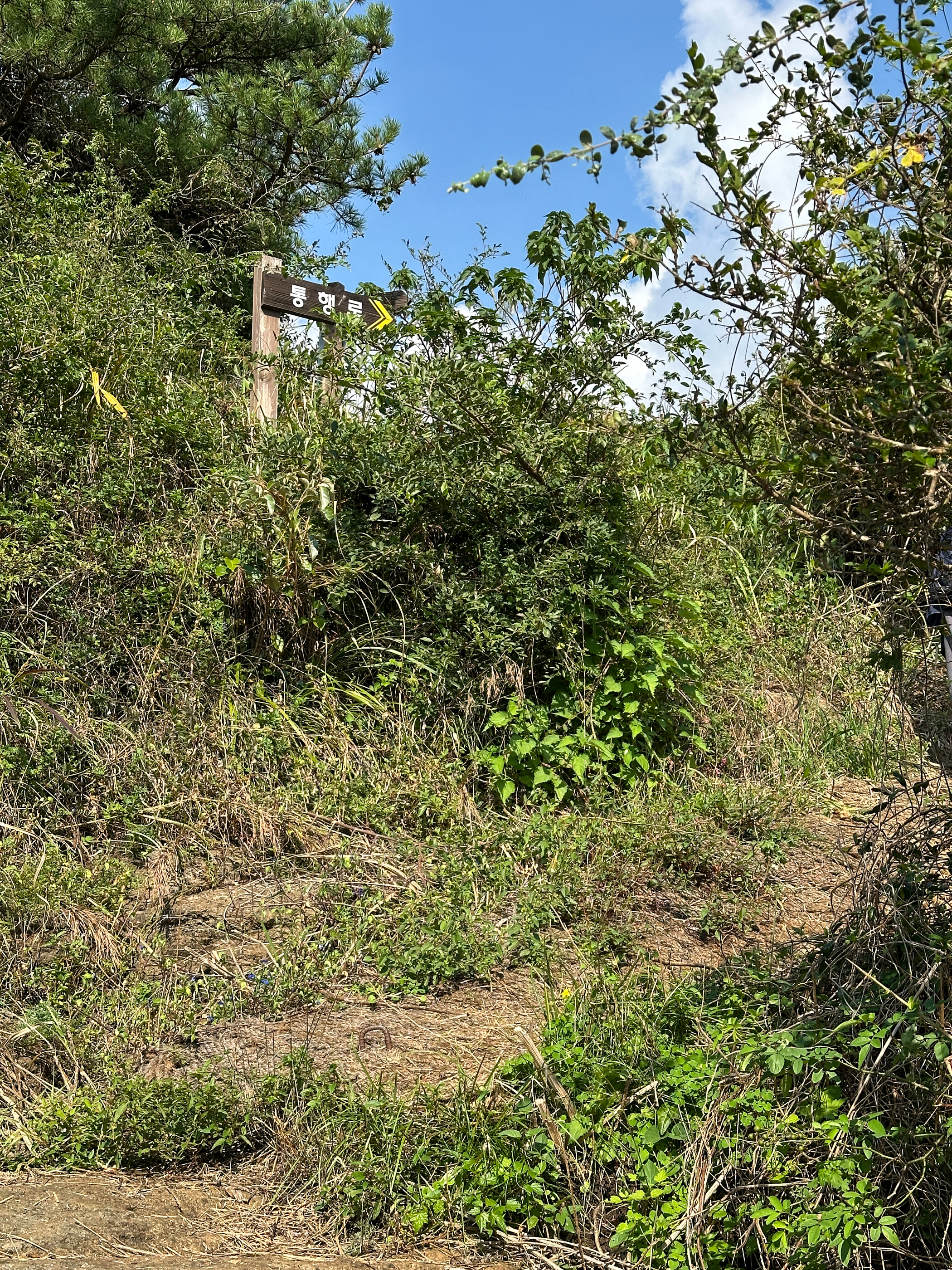 휴식을 취한 후 다시 북쪽 봉우리 방향으로 향했는데 내려가는 갈림길과 만났다. 북쪽으로 조금 더 가보려 했지만 가시가 있는 나무등으로 엉켜 있는 숲 길을 스틱으로 헤치며 진행하다가 결국은 포기하고 되돌아섰다.