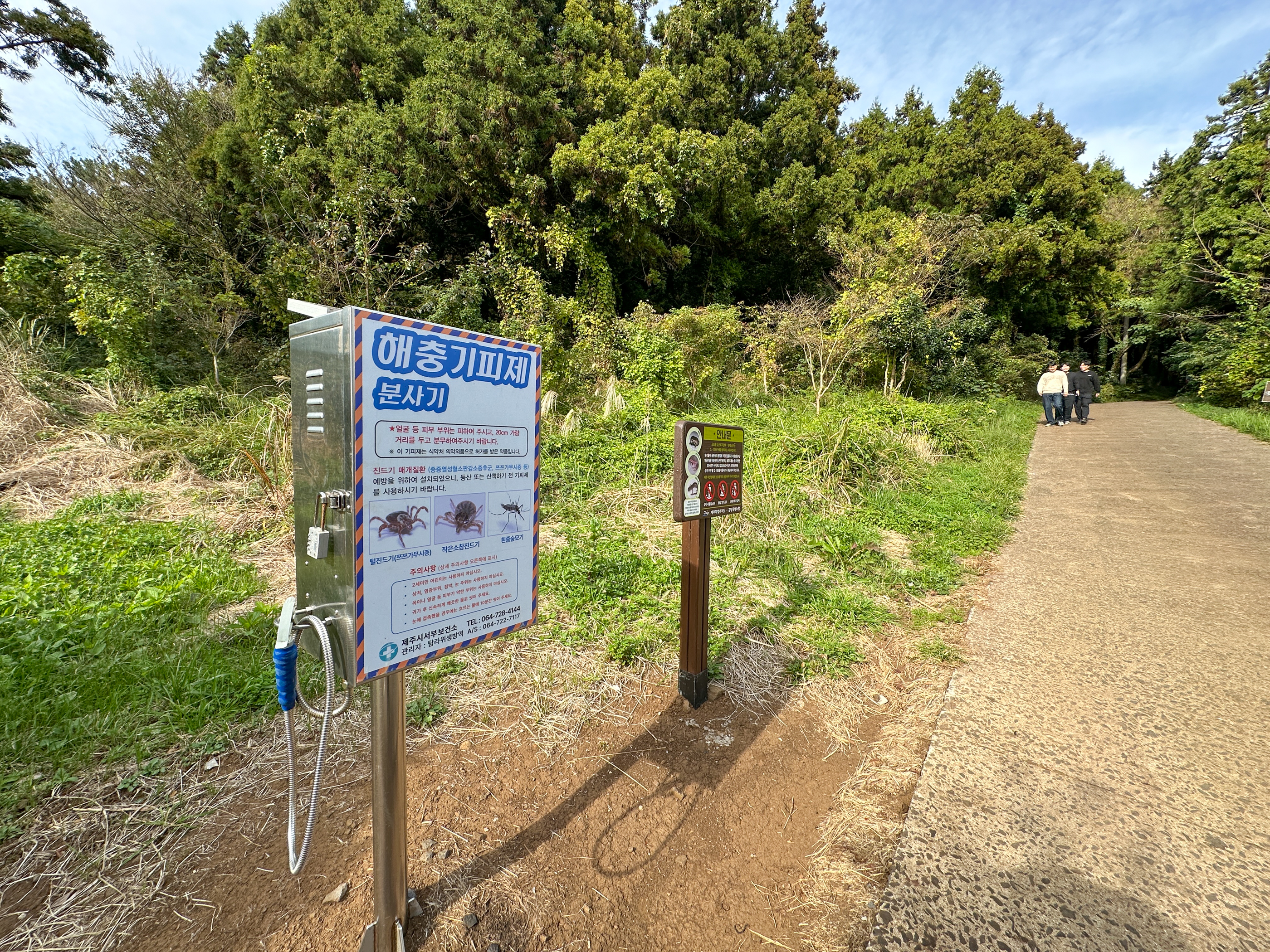 입구에 있는 안내판과 해풍기피제 분사기