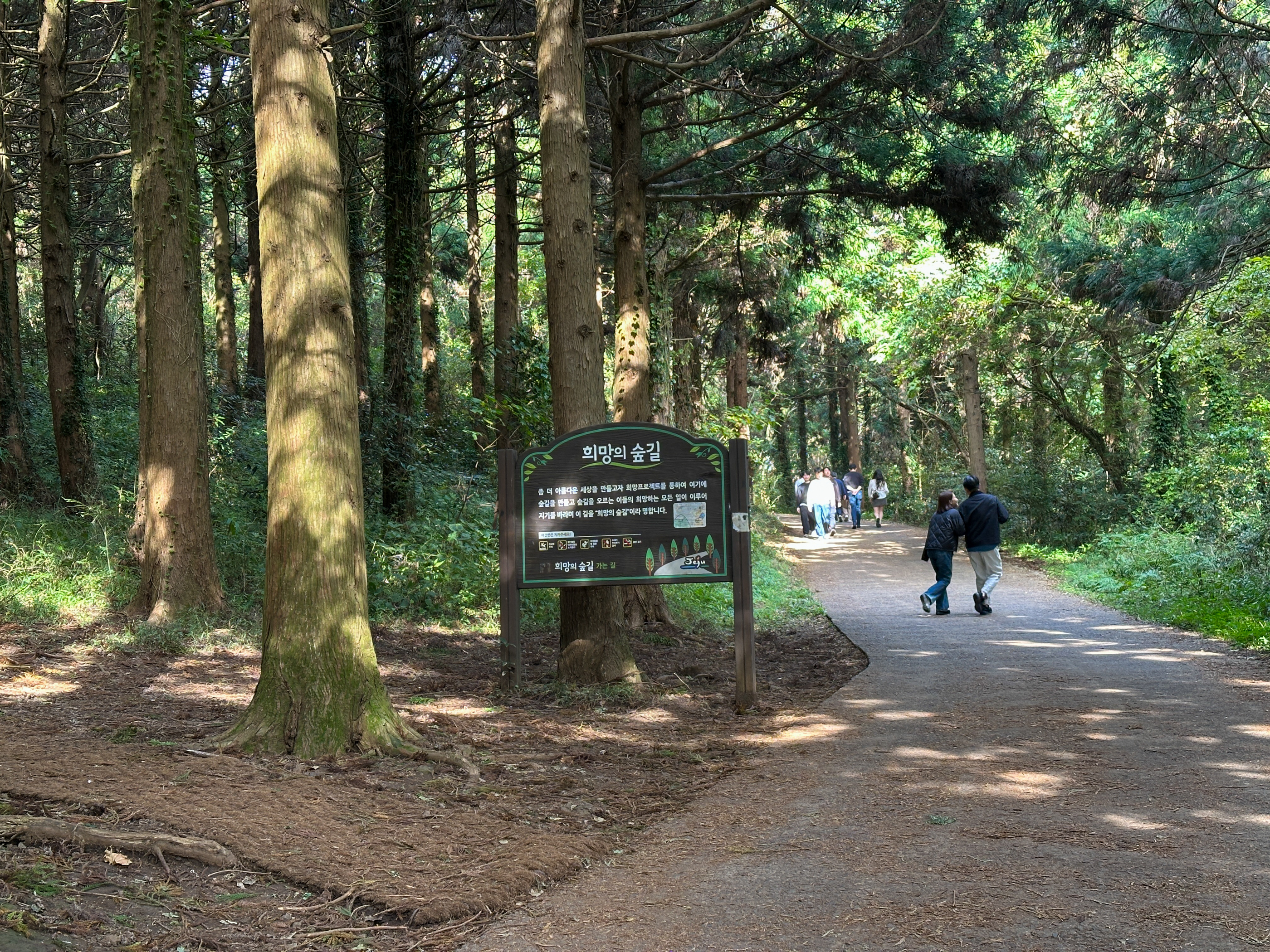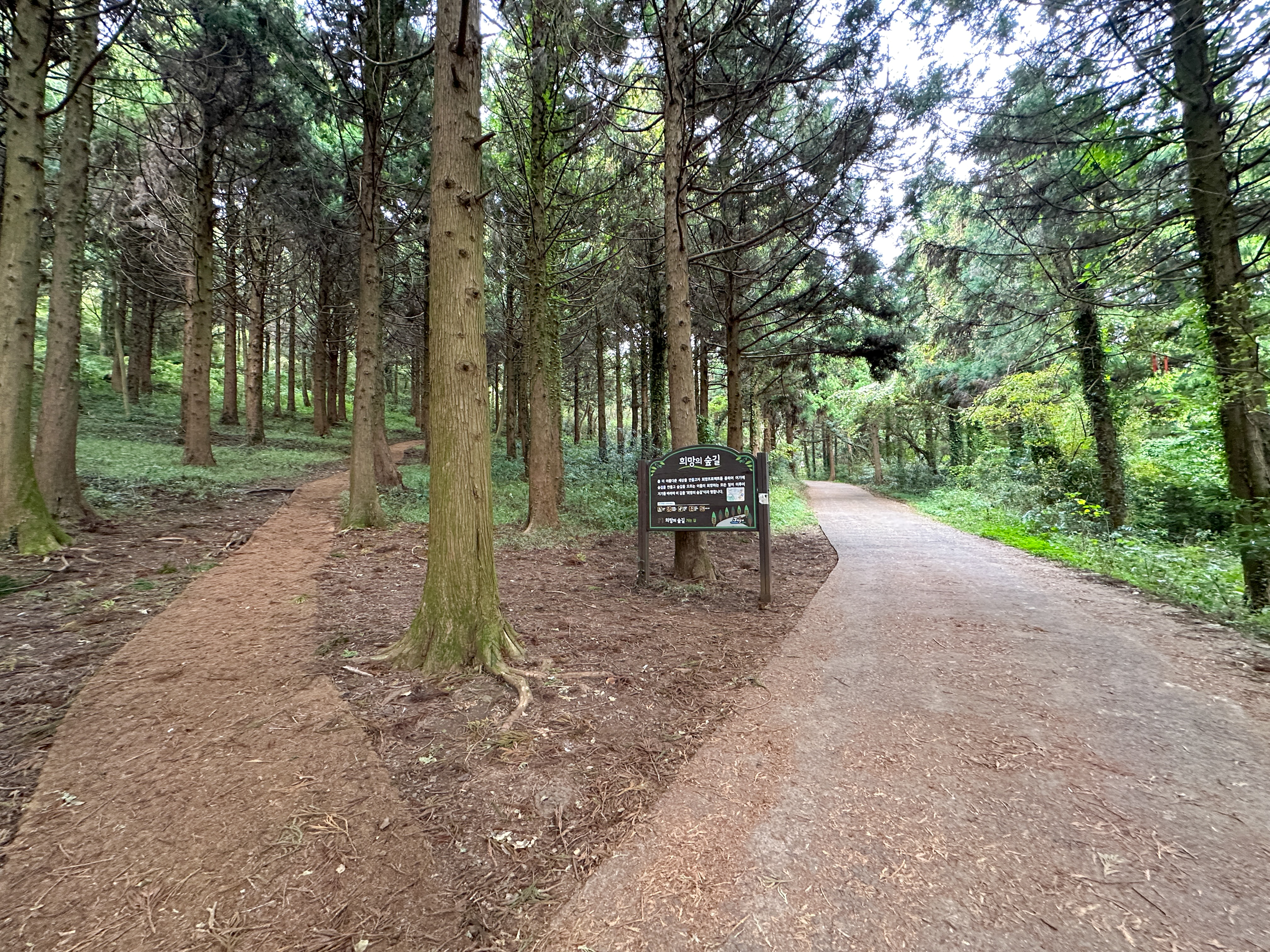 안내판이 있는 곳에 갈림길이 있는데 대부분 오른쪽 시멘트길로 분화구까지 올라간다. 우리는 왼쪽 숲길을 택했다.