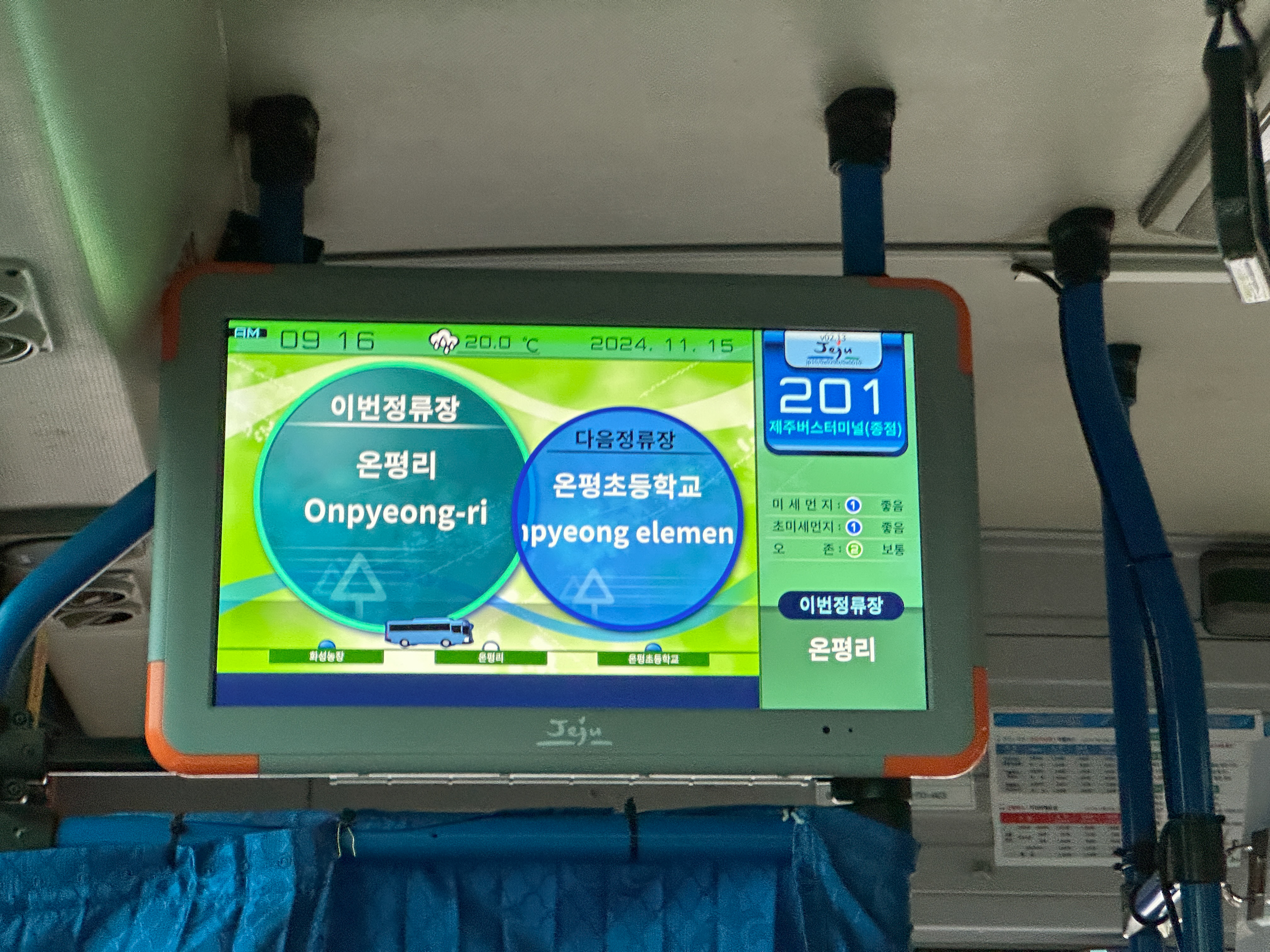 내릴 곳 '온평리'를 알려주는 운전석 뒤 버스 전광판