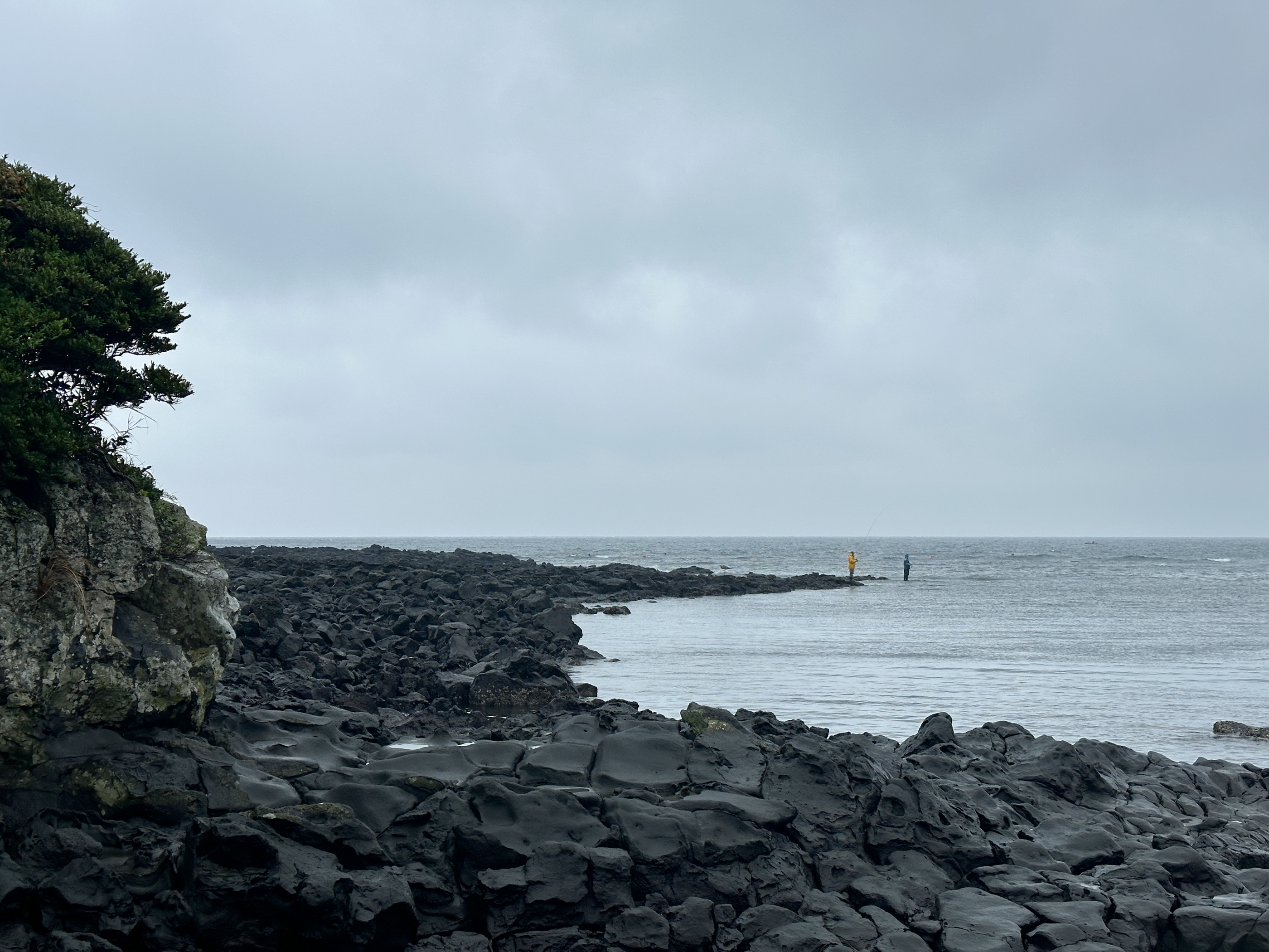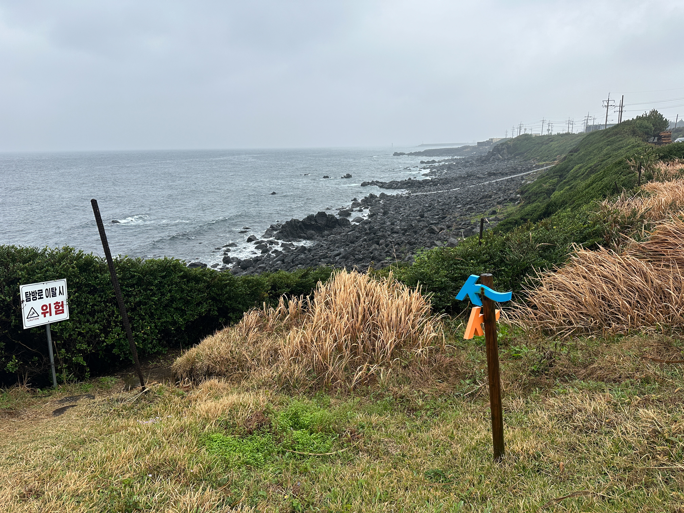 제주 바당길 표시가 있다 . '바당'은 바다의 제주 사투리다. 갯바위에서 낚시하는 사람들