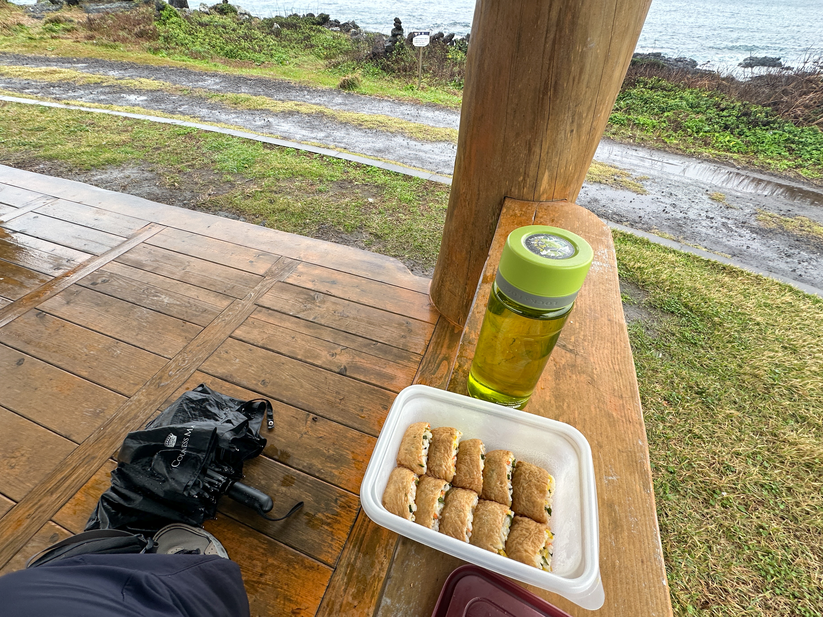 신기하게도 비에 젖지 않은 정자 안쪽 난간에 걸터 앉아 '마르타'가 만들어 준 유부초밥을 먹었다.