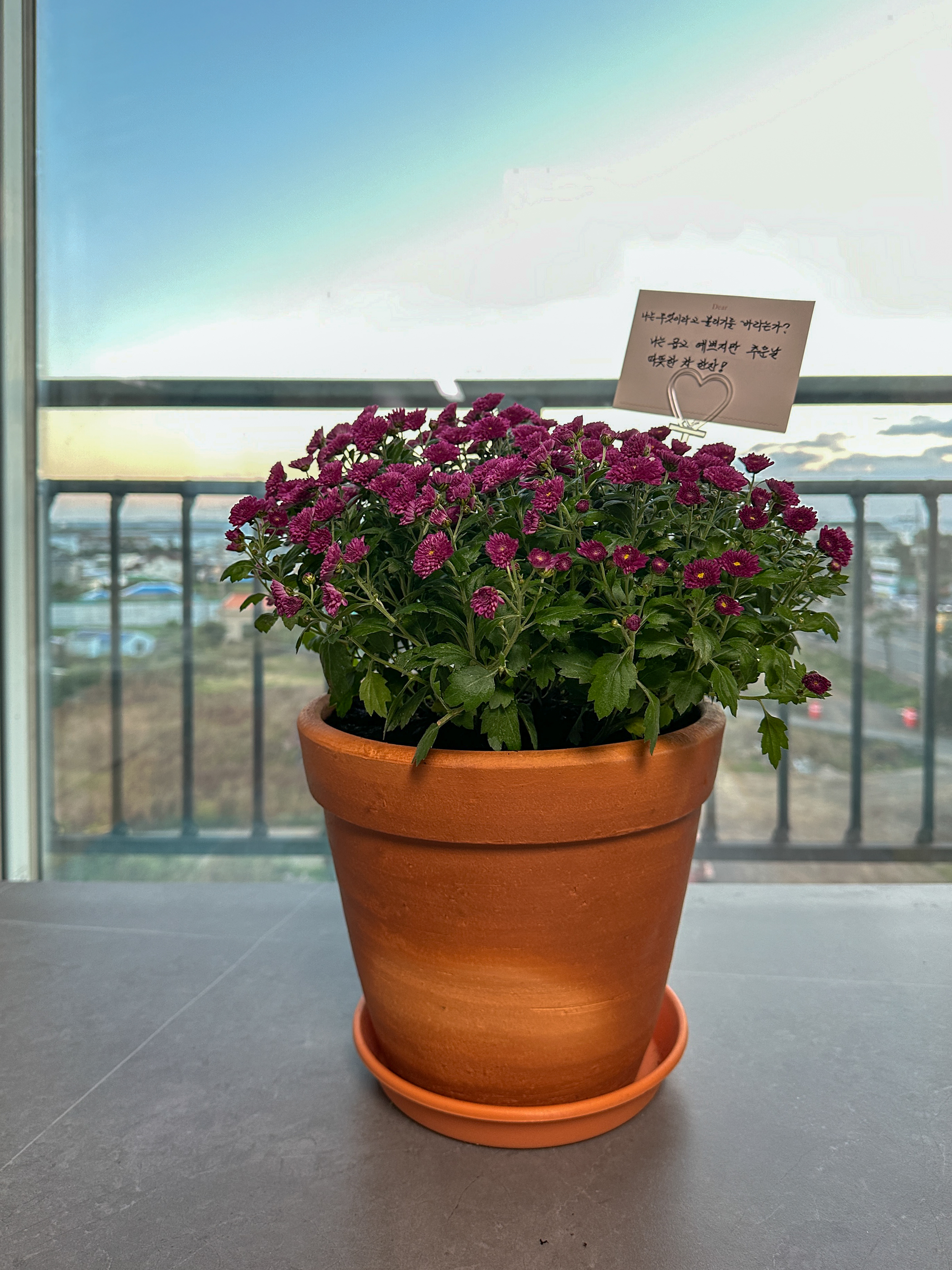 거실에 화분을 놓으니 국화향이 디퓨저 보다 더 강하게 실내를 향기롭게 한다.