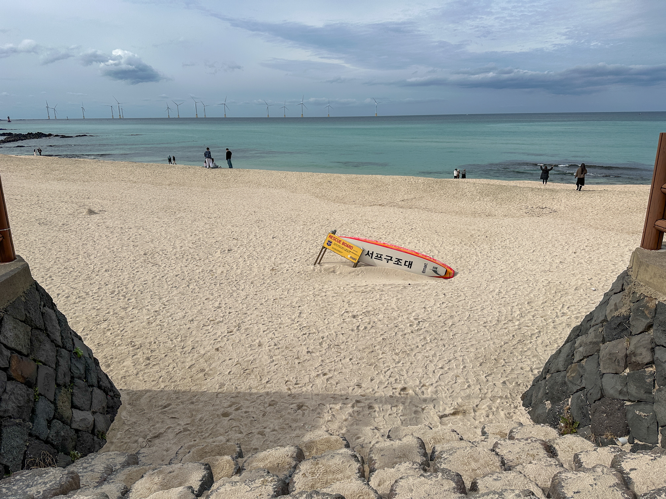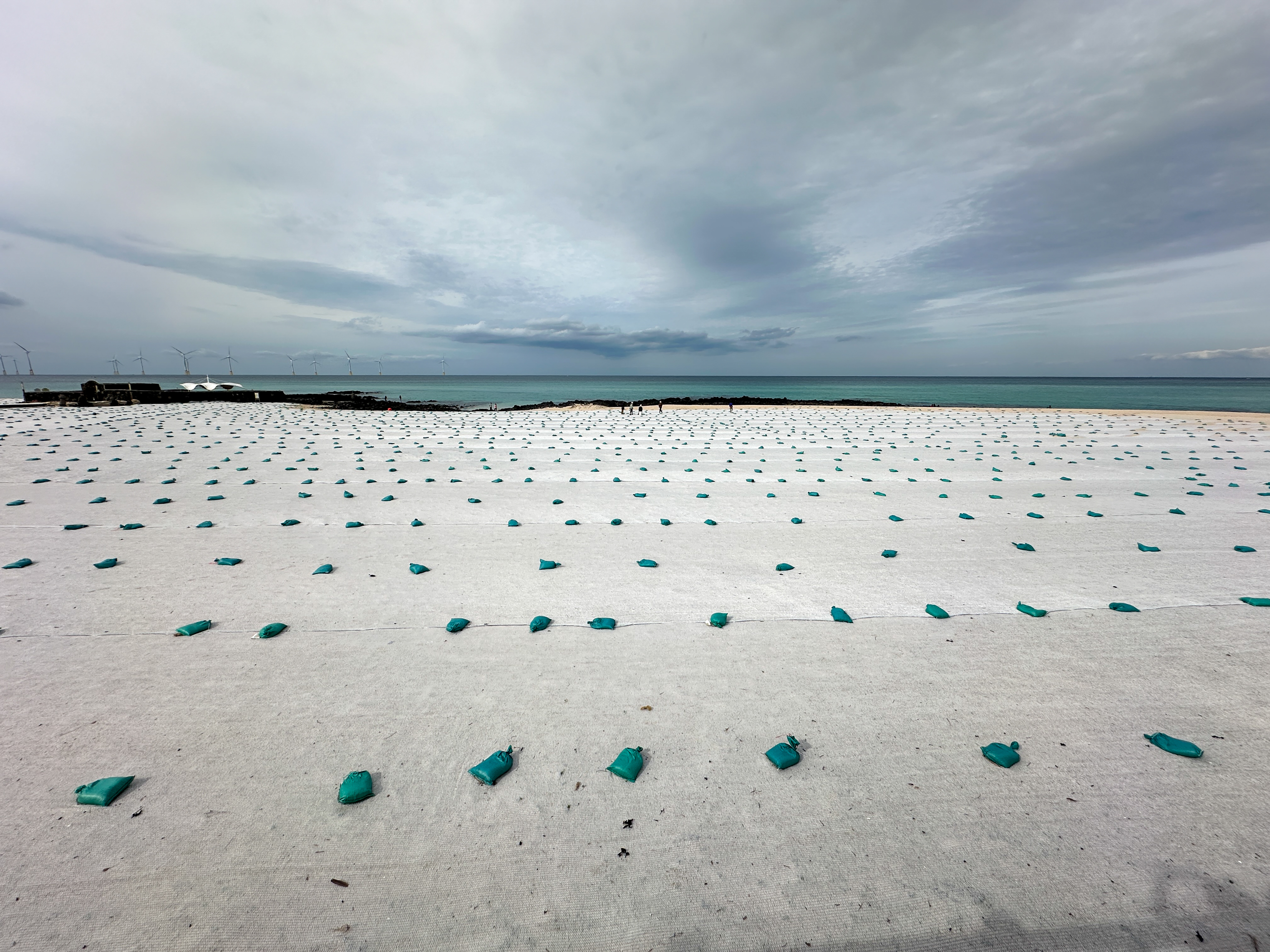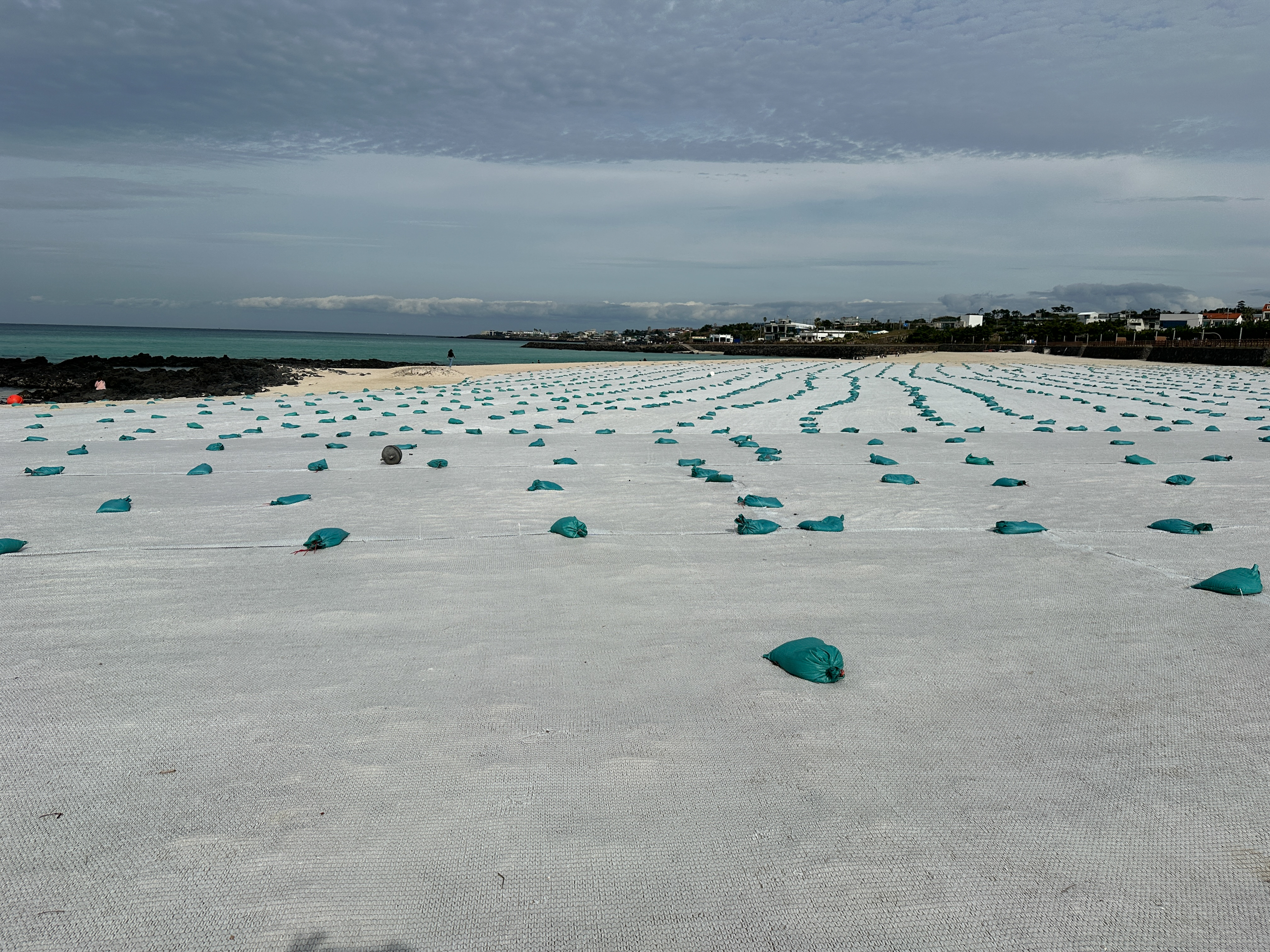 곽지해수욕장에는 모래가 유실되는 것을 방지하기 위해 모래사장에 덮개를 씌워났다.