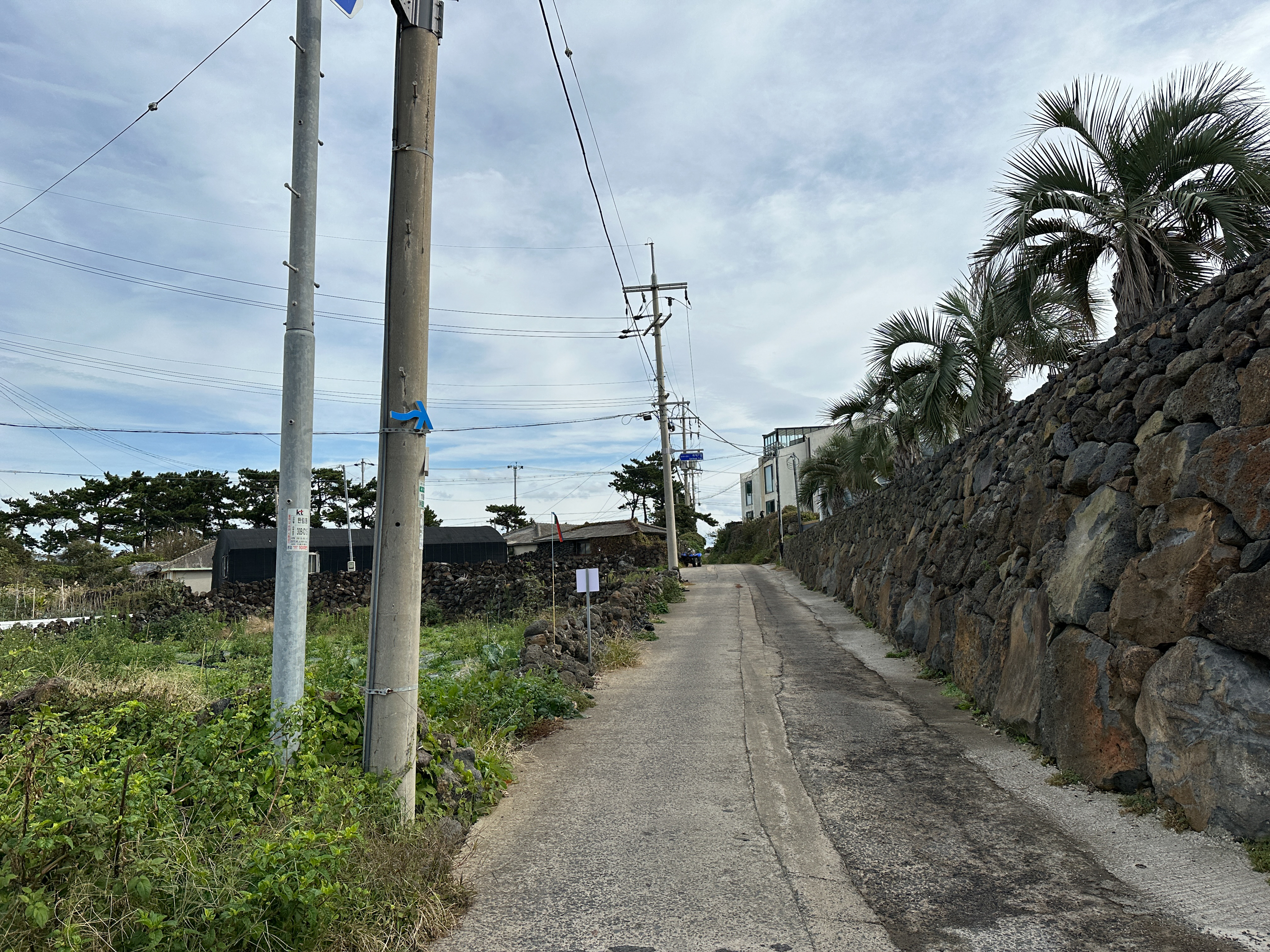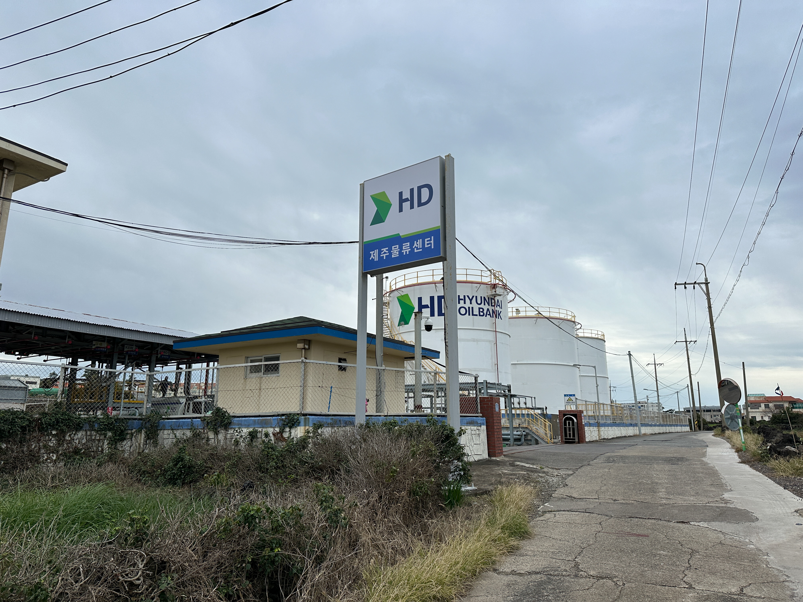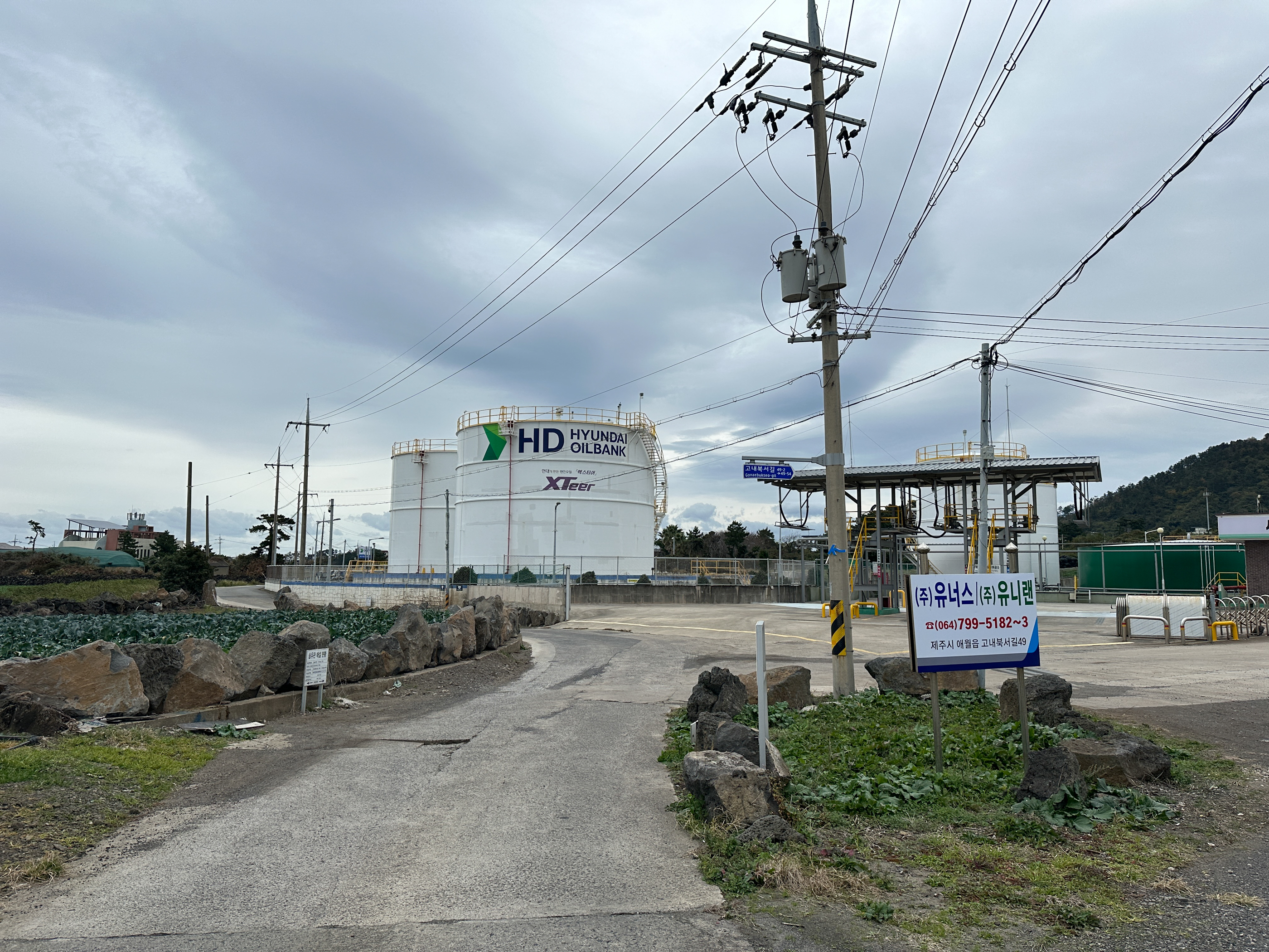 애월항을 지난 후 해안도로를 벗어 나 마을 길로 접어들어 현대오일뱅크 물류센터도 지나간다.