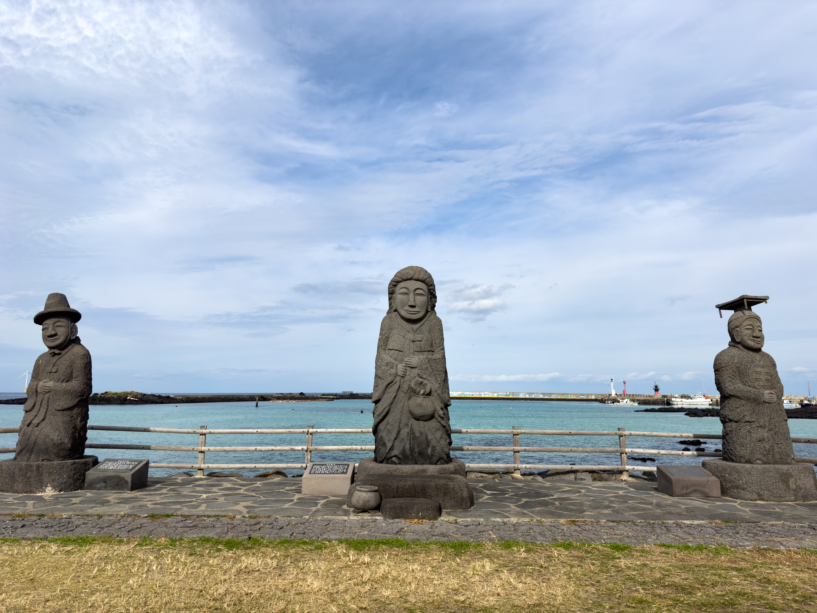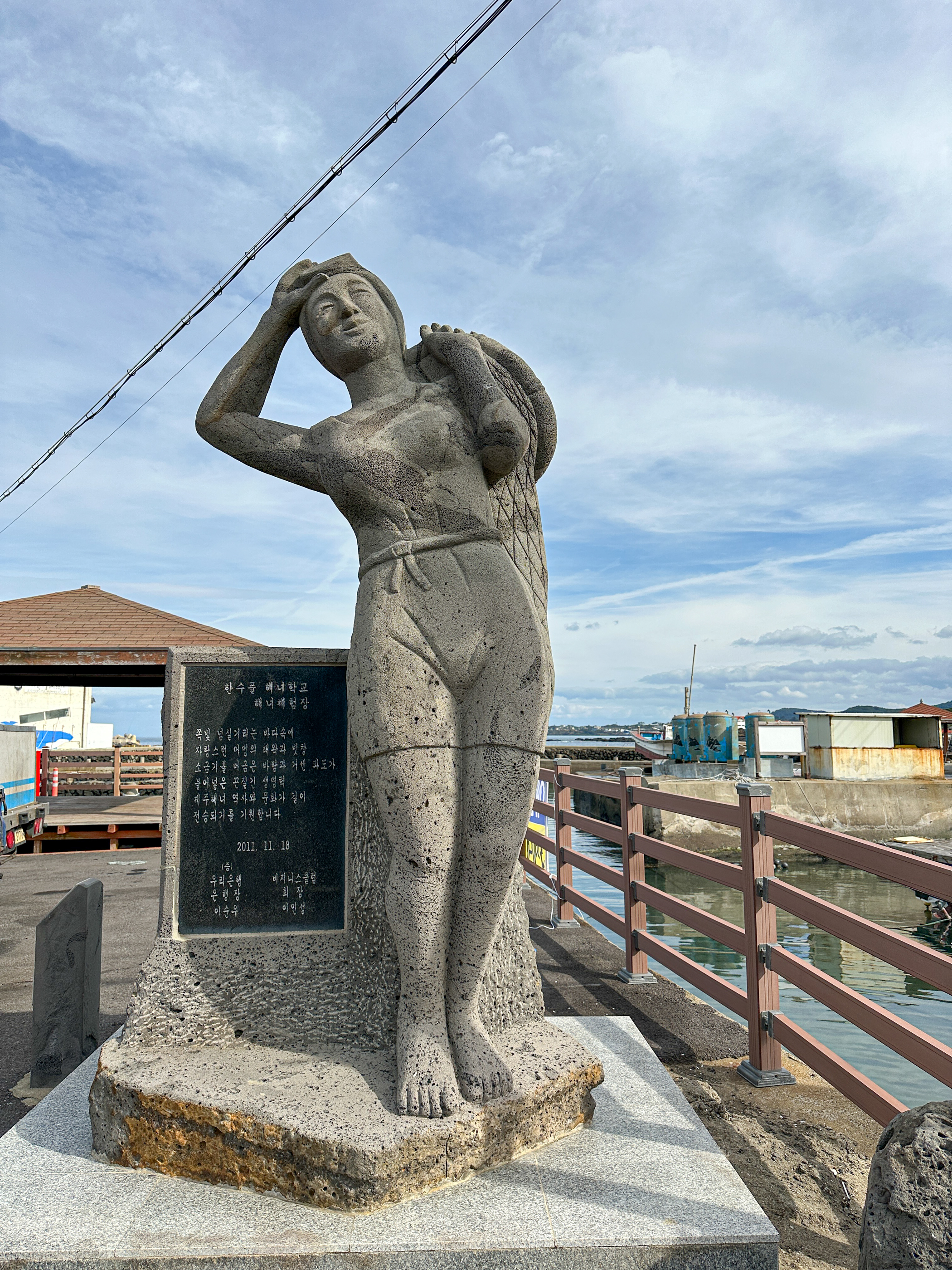 한수풀 해녀학교 해녀체험장에 있는 해녀 동상, 물질하는 해녀들도 보인다.