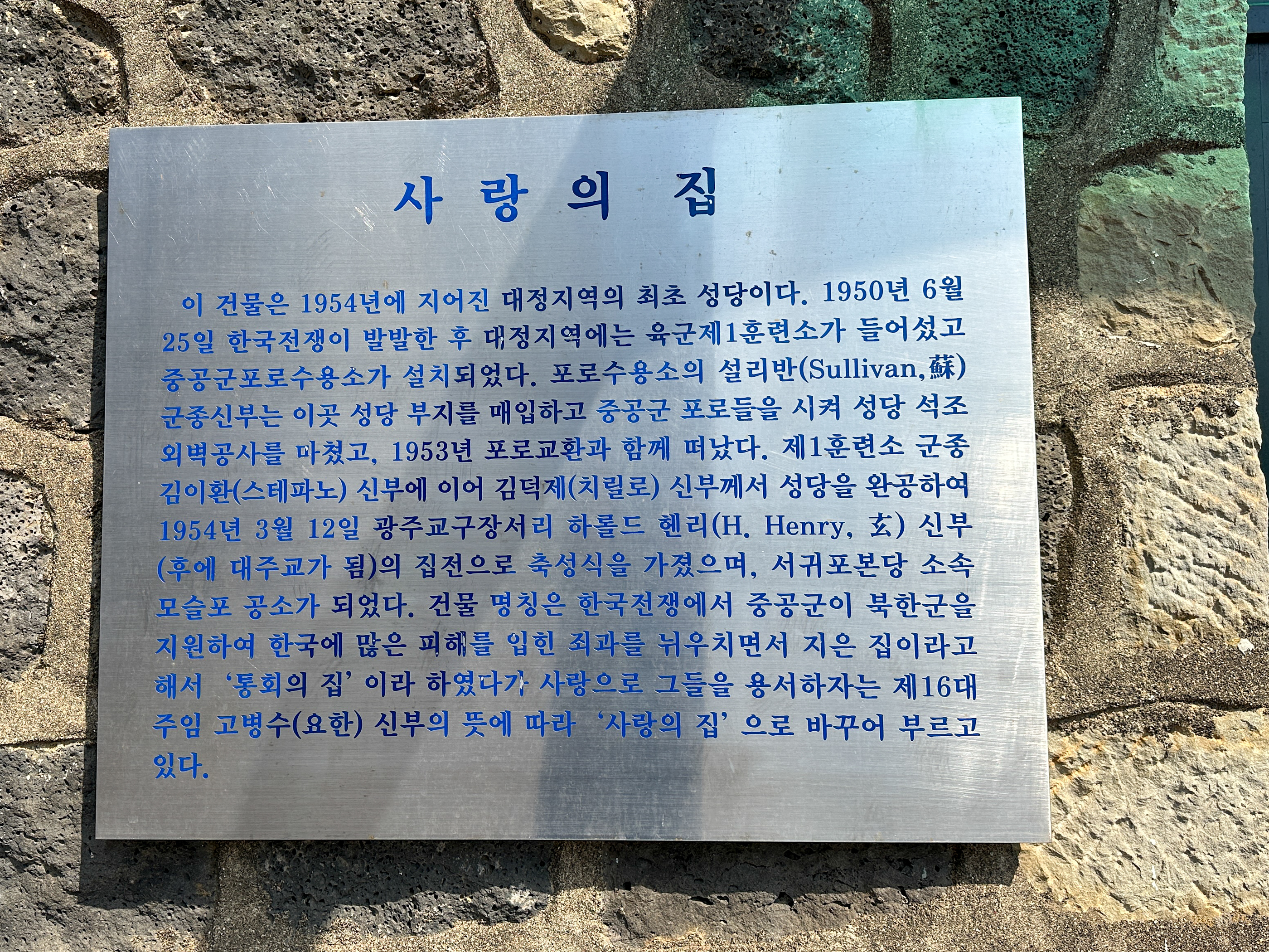 한국전쟁시 대정지역에 있던 중공군포로수용소 포로들을 시켜 석조 외벽공사를 마쳤고 1953년 포로 교환으로 떠나간 후에 1954년 김덕제 치릴로 신부에 의해 성당 완공을 했다 (1954년3월12일 축성식)