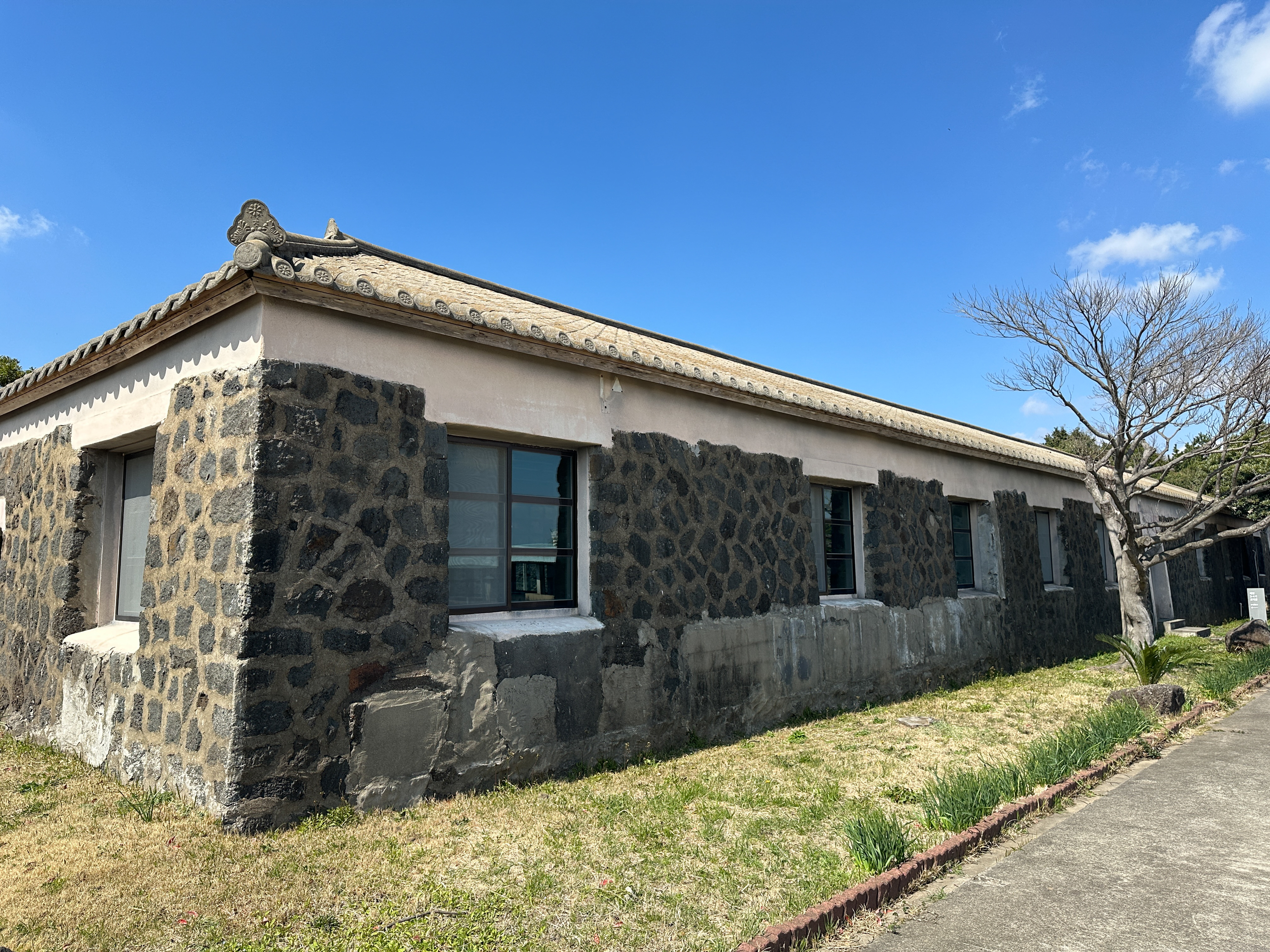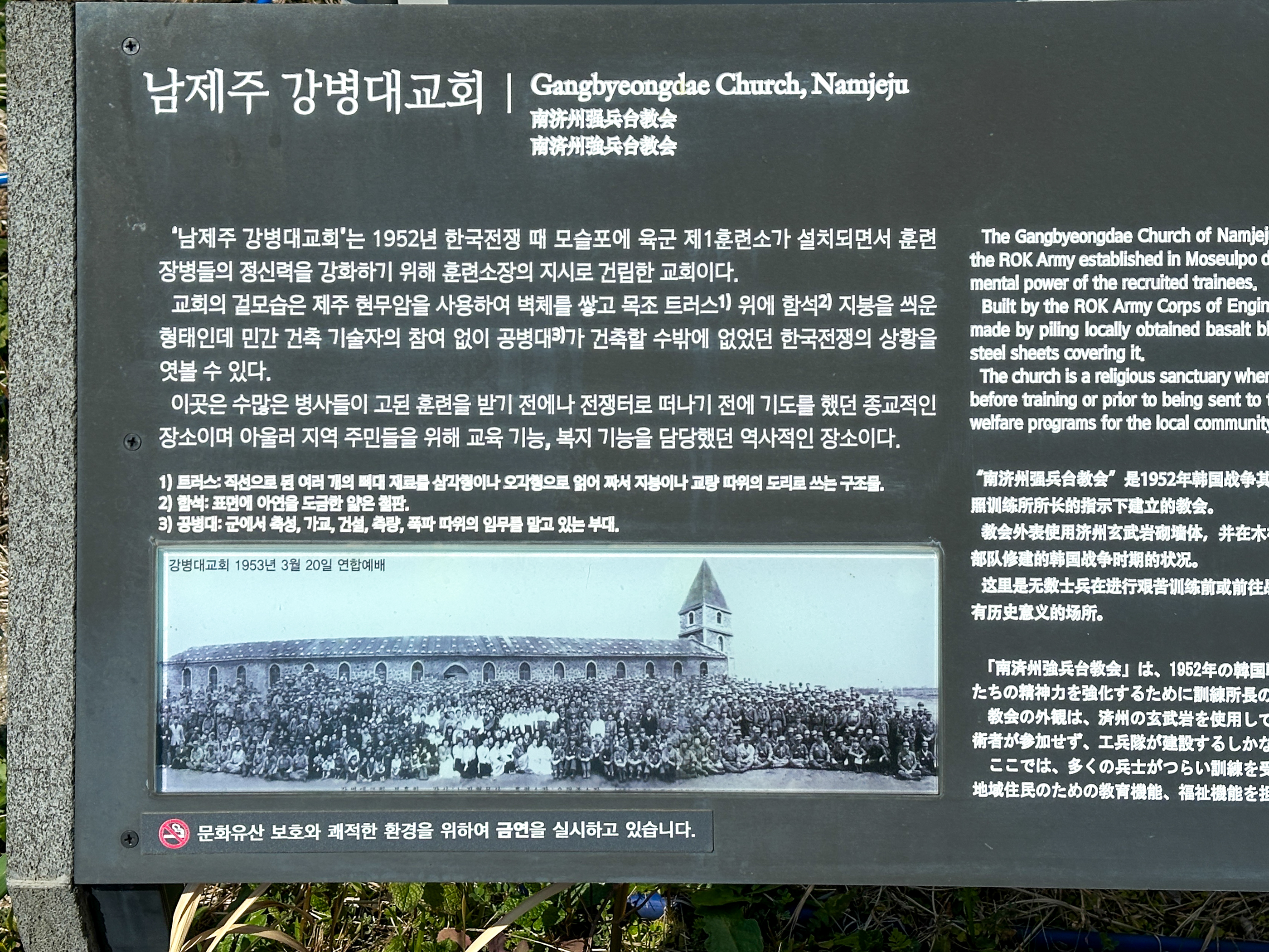 제주도산 현무암을 사용하여 벽체를 쌓고 목조 트러스트 위에 함석 지붕을 씌운 형태로 민간 건축 기술자 참여 없이 공병대에 의해 건축되었다.