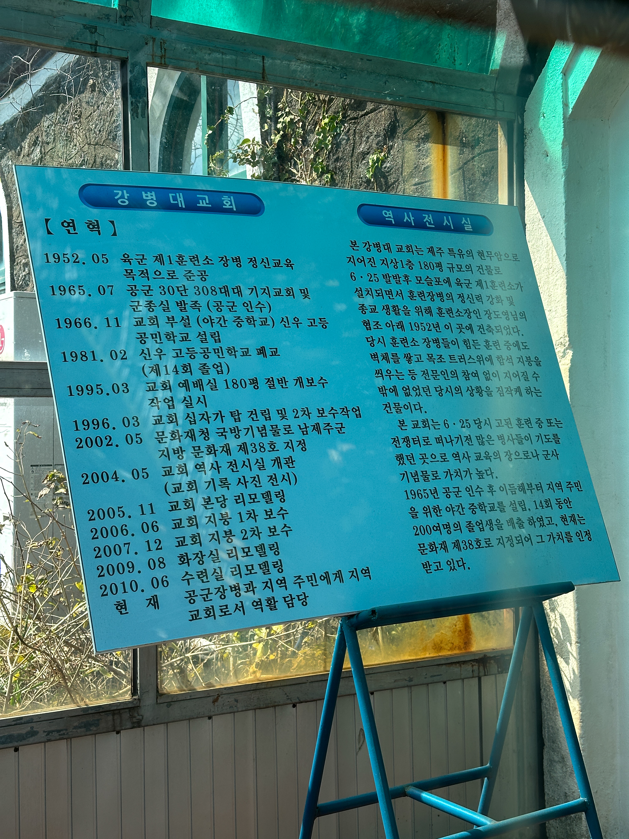 이 건물은 한국전쟁 당시 모슬포에 육군 제1훈련소가 정식으로 설치되면서 훈련 장병들의 정신력을 강화하기 위해 훈련소장인 장도영 장군의 지시로 건립된 교회다.