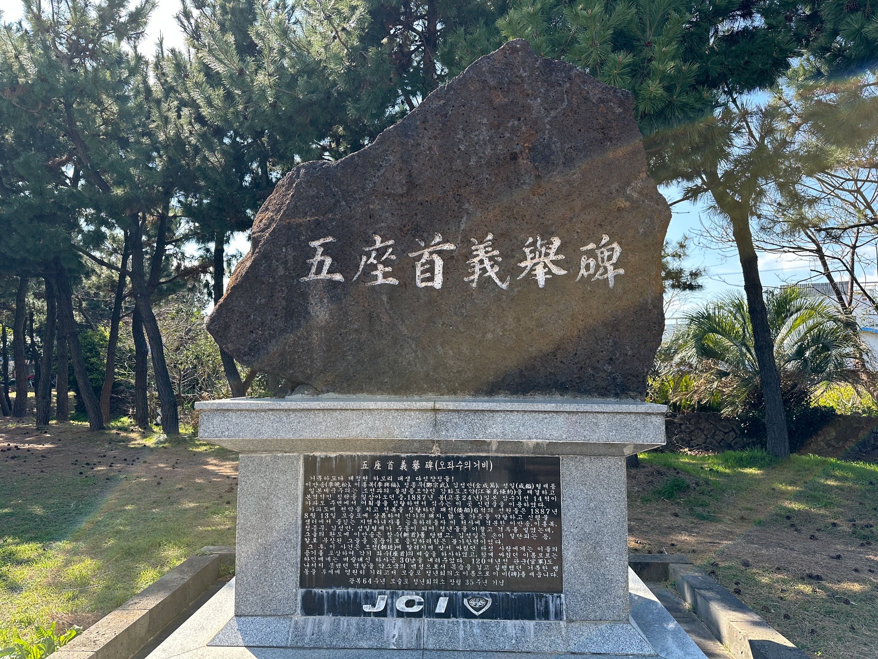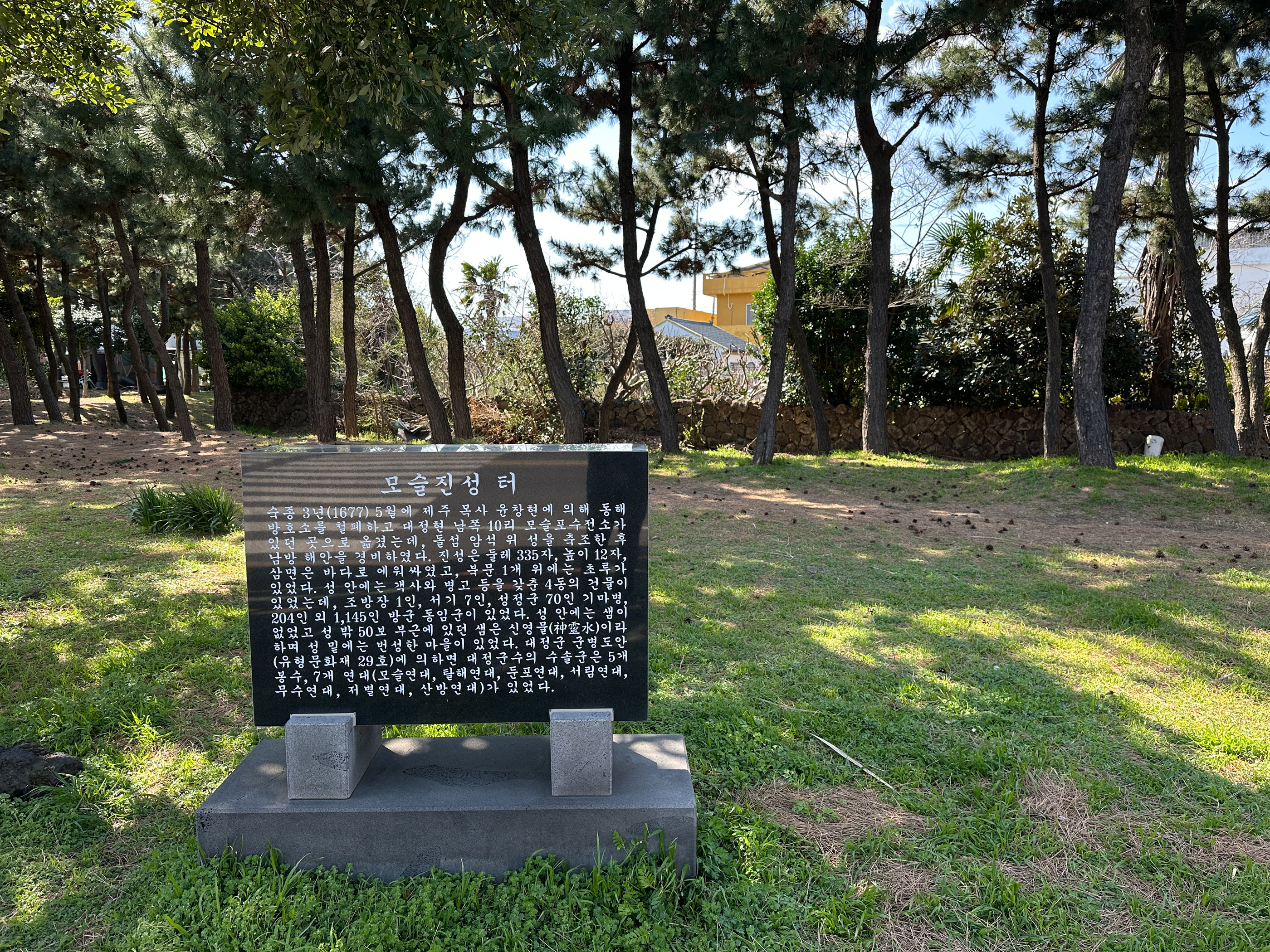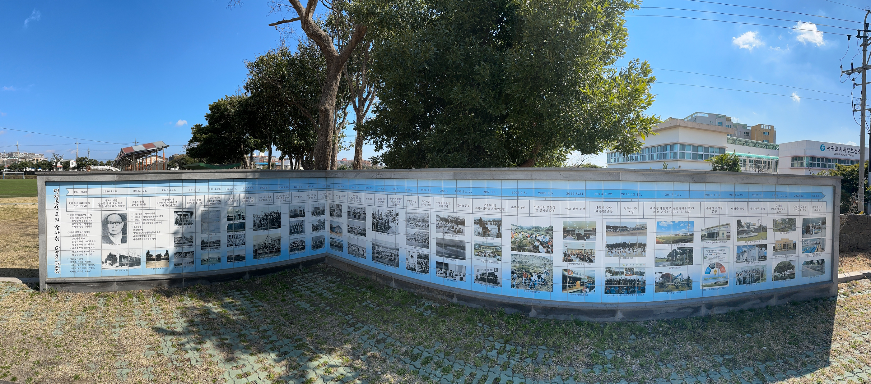 1. '평화의 터'- 뒷편 건물은 대정고등하교, 그 뒤로 모슬봉 위에는 공군기지가 보인다.-