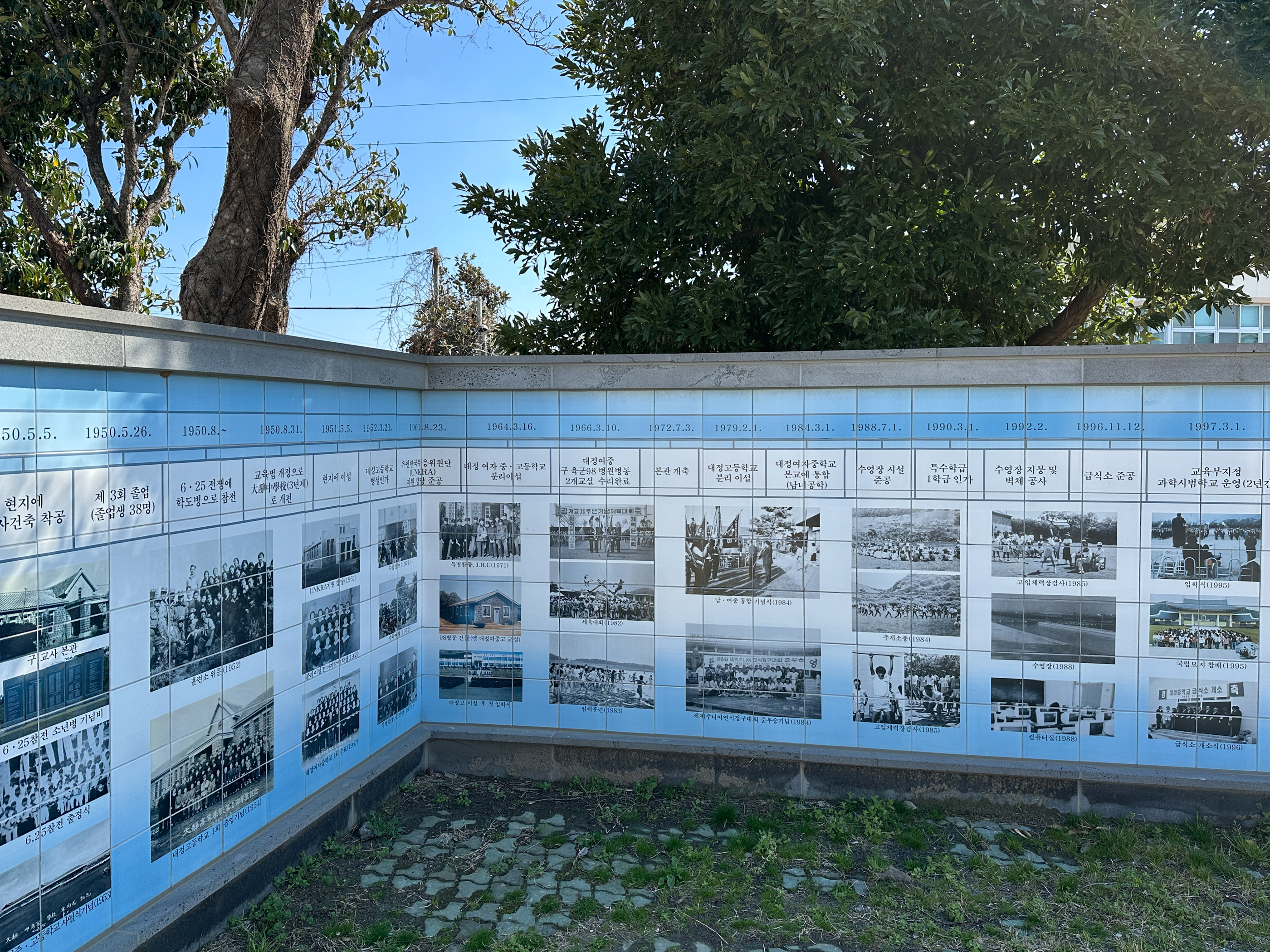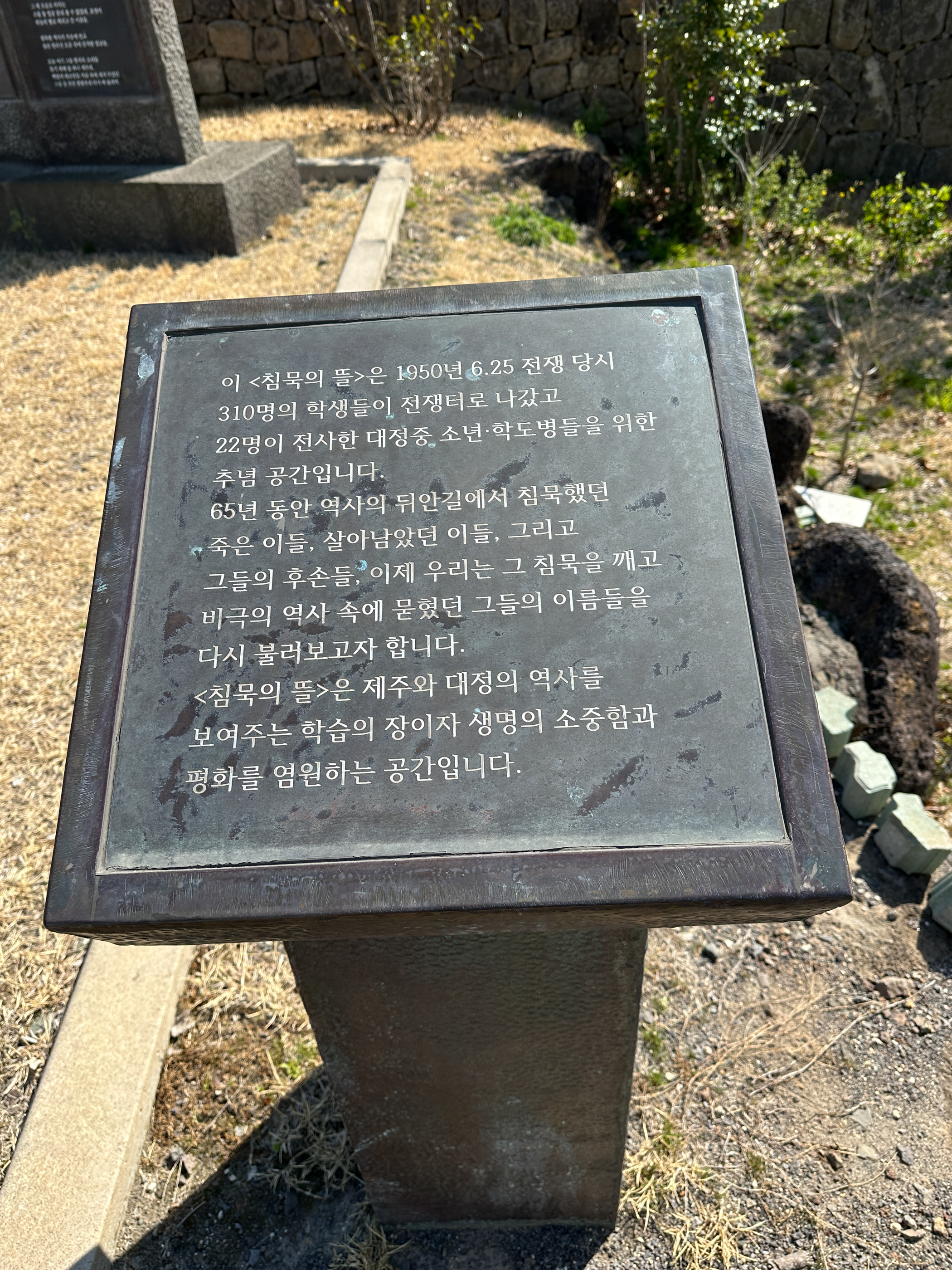 '침묵의 뜰'은 6.25전쟁 당시 310명의 학생들이 전쟁터로 나갔고 22명이 전사한 대정중학교 출신 소년(학도병)들을 위한 추념공간이다. 대정중학교 후문인데 학교안에는 내가 다니는 '수애기 수영장'이 있다.