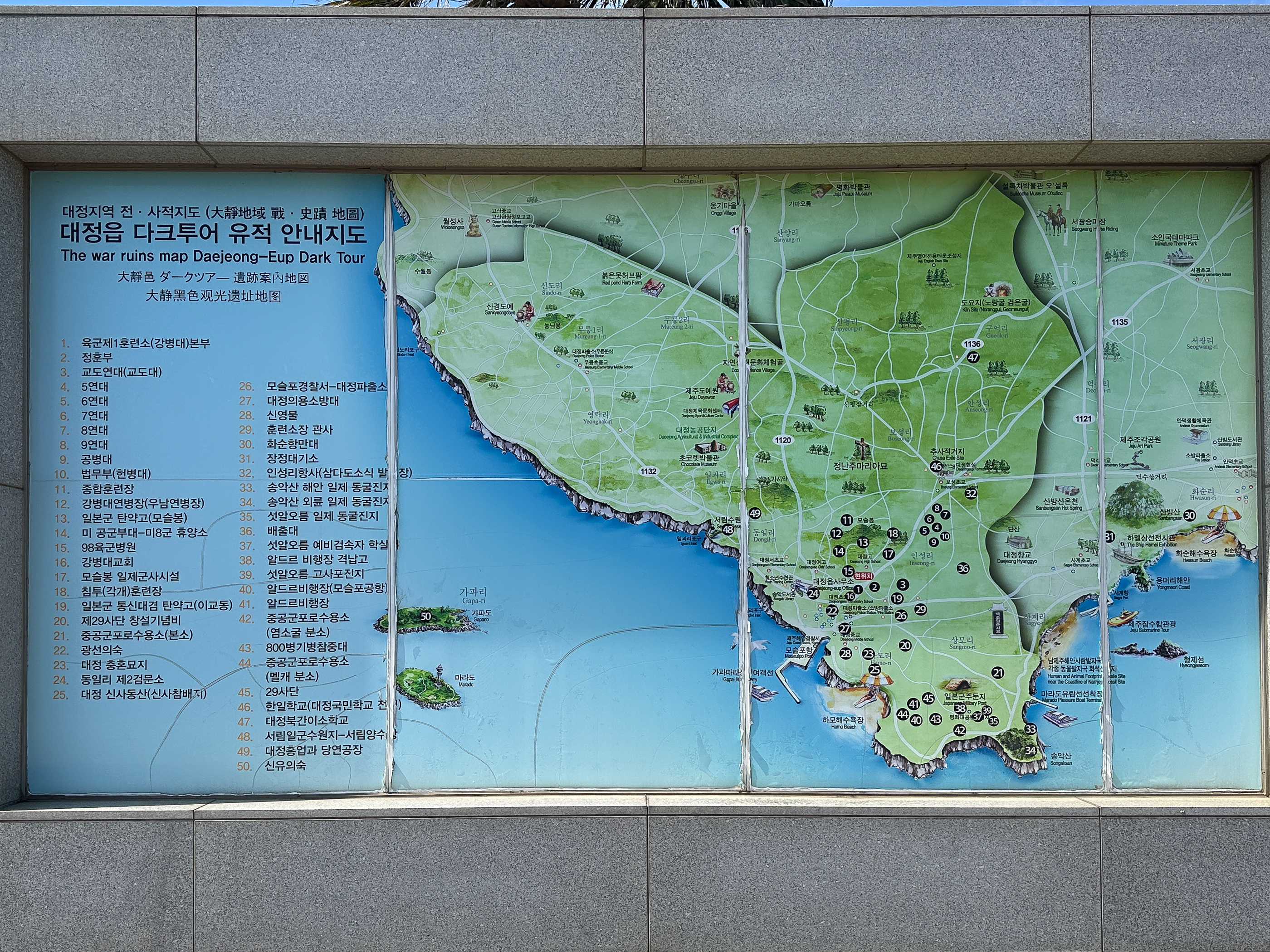 1코스는 ▷평화의 터(모슬포 워커 운동장) ▷육군 제1훈련소 정문 ▷해병 3·4기 호국관 ▷강병대 교회▷구)대정면 사무소 ▷모슬포 천주교회(사랑의집) ▷대승사 ▷대정중 6.25참전 소년병 추모공간(침묵의 뜰)▷신영물 순으로 되어있고 소요시간은 1~2시간 정도 걸린다고 안내하고 있다.