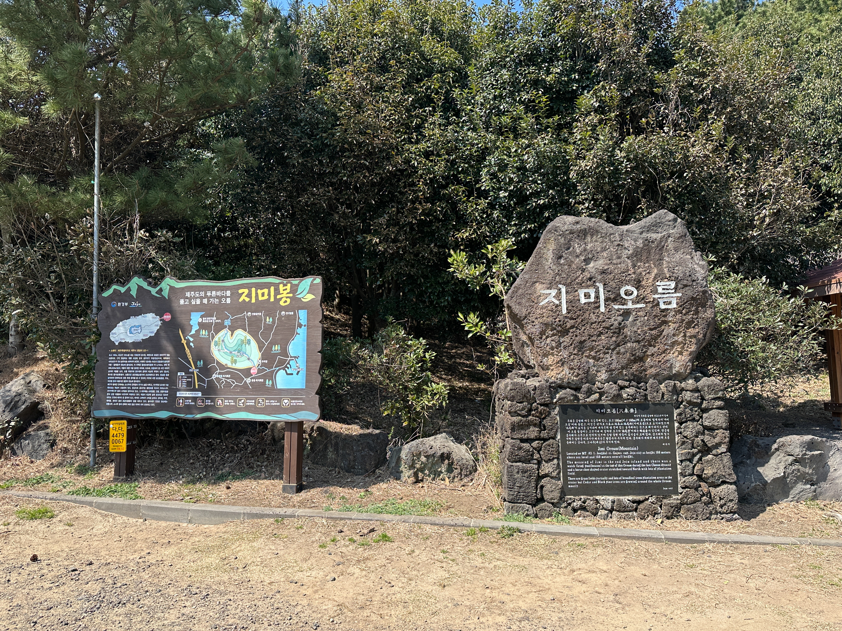 지미오름 표지석과 올레지팡이 보관함도 보인다.
