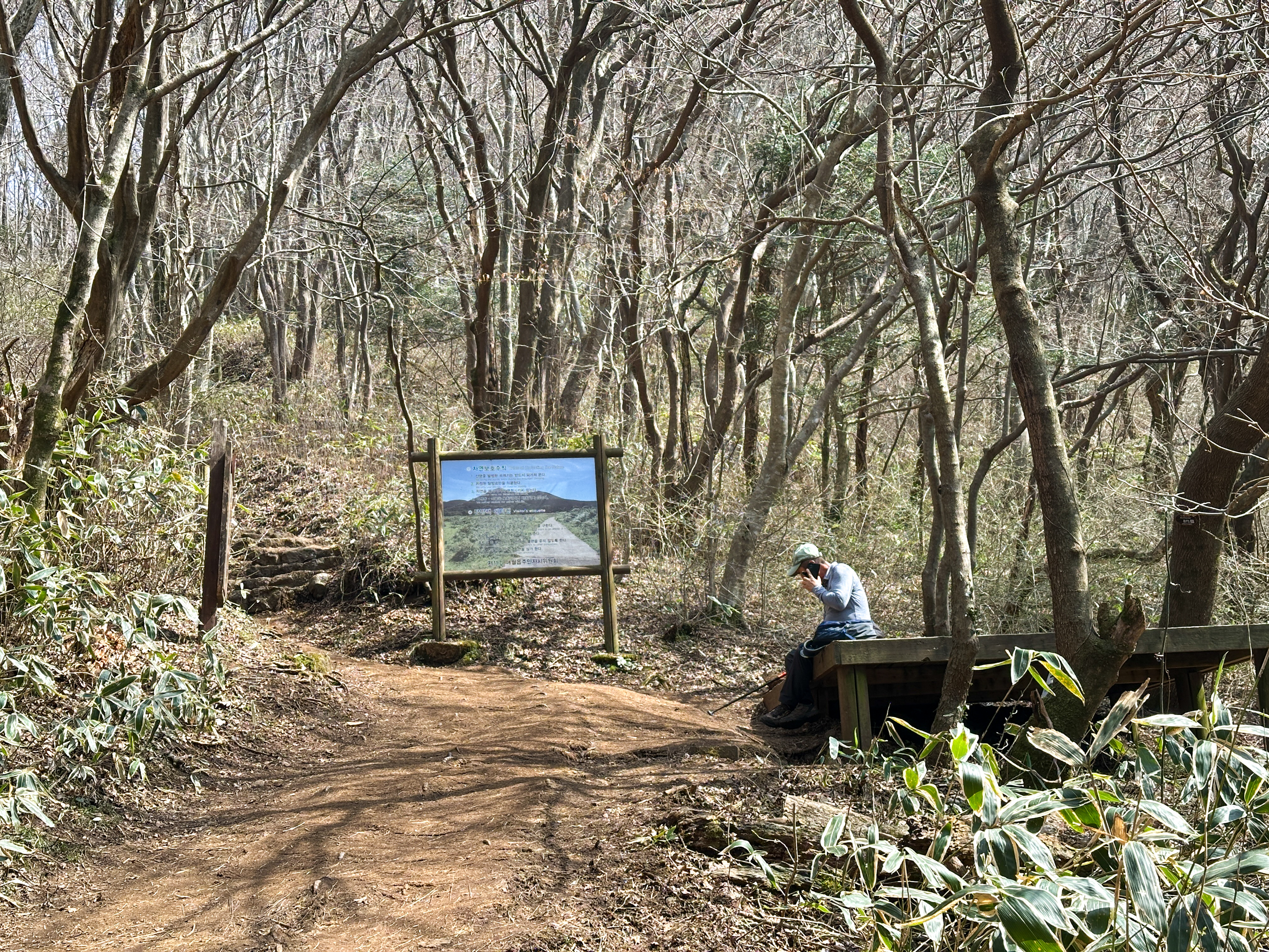 1.67km 지점, 제2쉼터다. 안내표지판 멀리 주봉이 보인다.