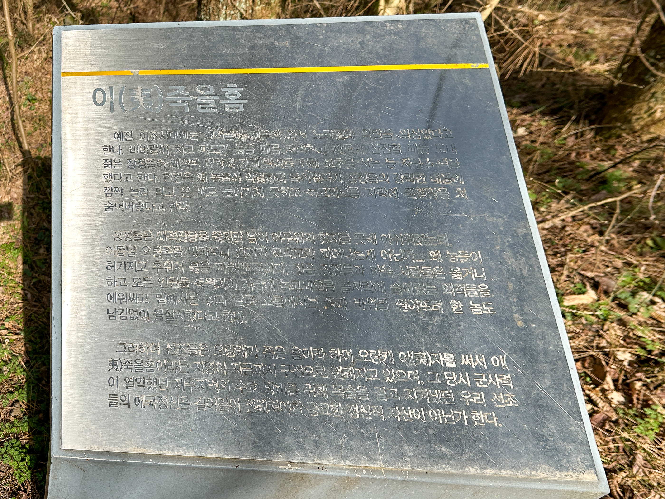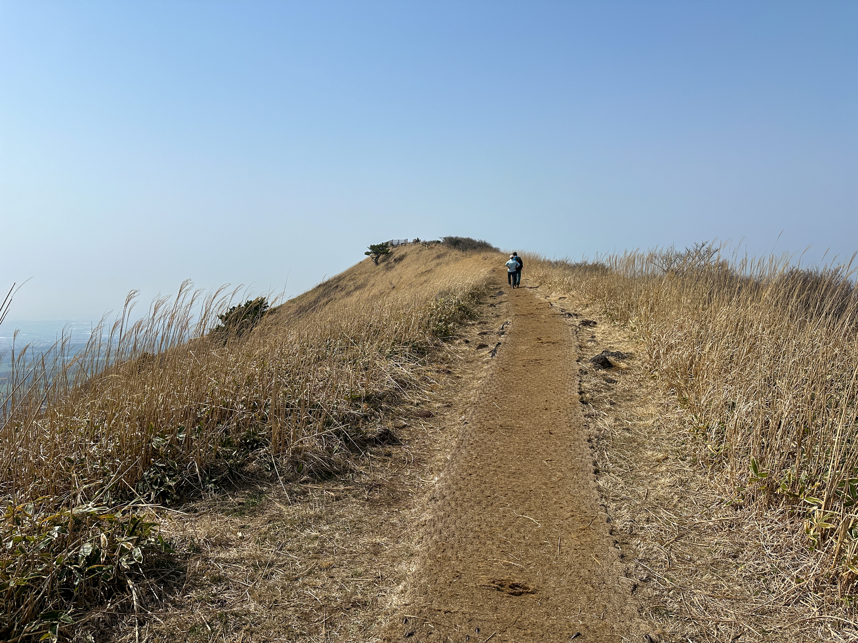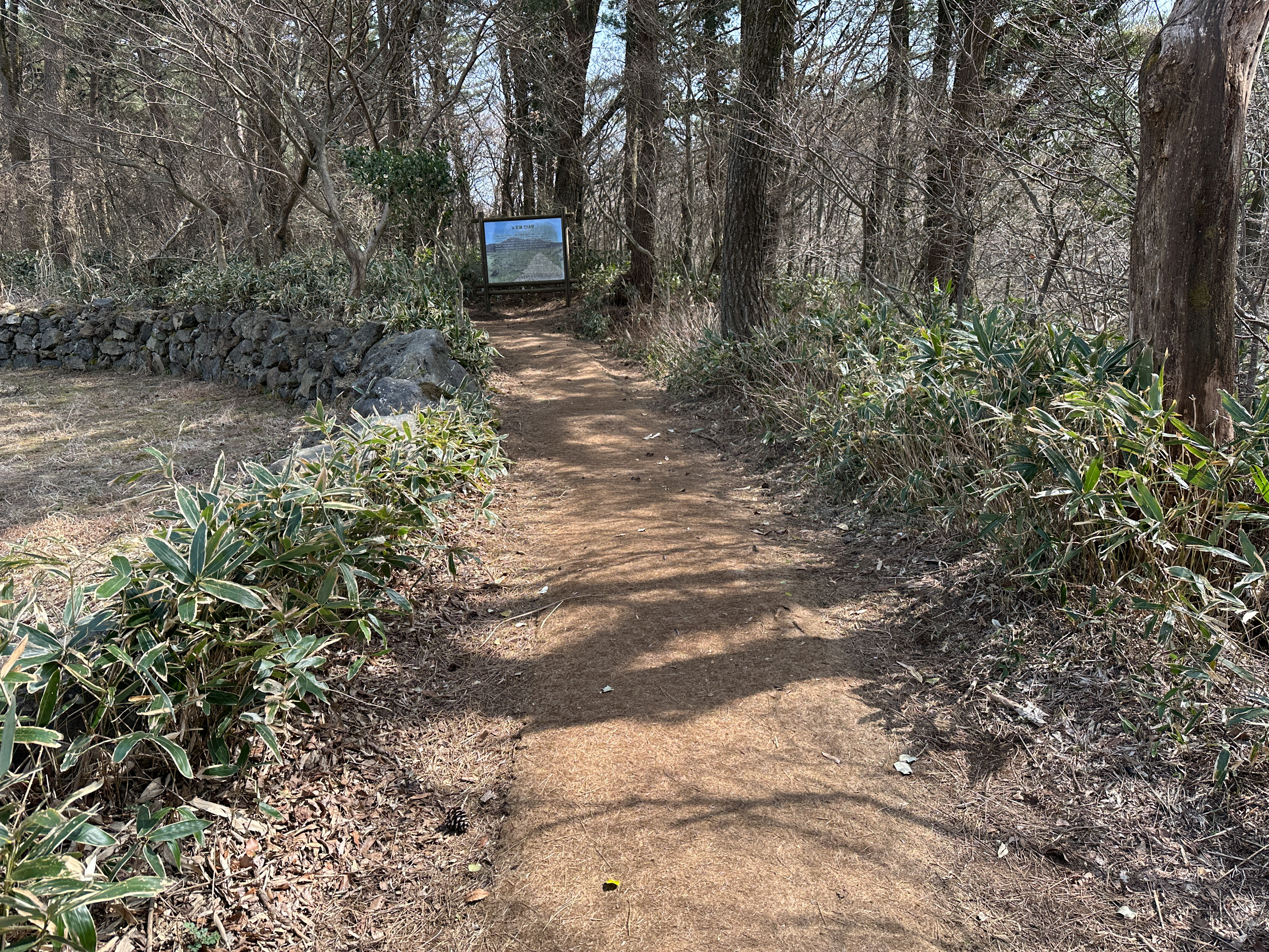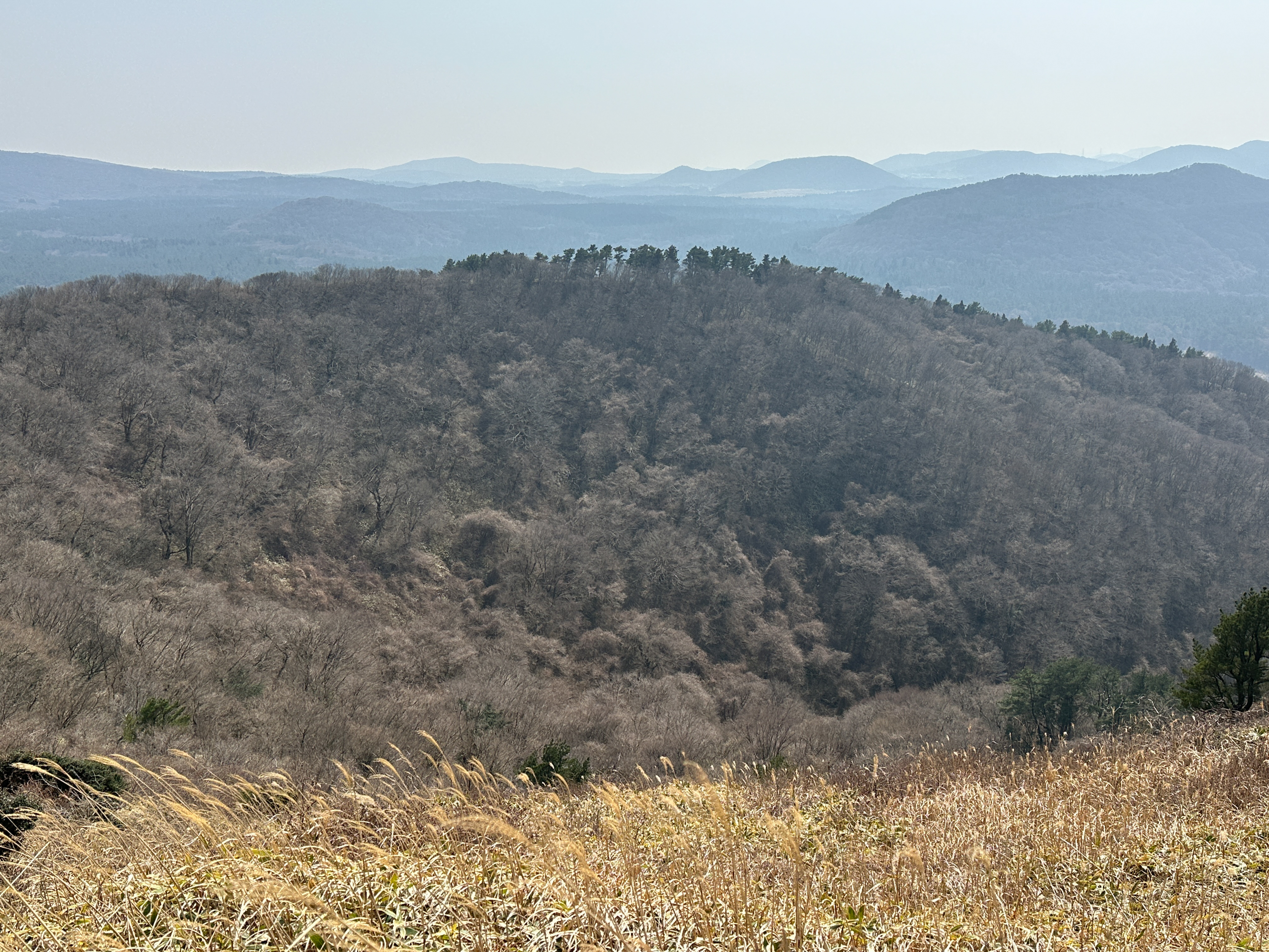 다시 올라 갈 때 장소에 도착했다. 제1쉼터에서 제2쉼터까지 가파른 경사길 10여분정도 외에는 큰 무리 없이 오를 수 있는 오름이다. 가을 처럼 청명한 날씨라면 능선부터 전망대까지 올라가며 볼 수 있는 정경은 환상적일텐데 하는 아쉬움이 든다.