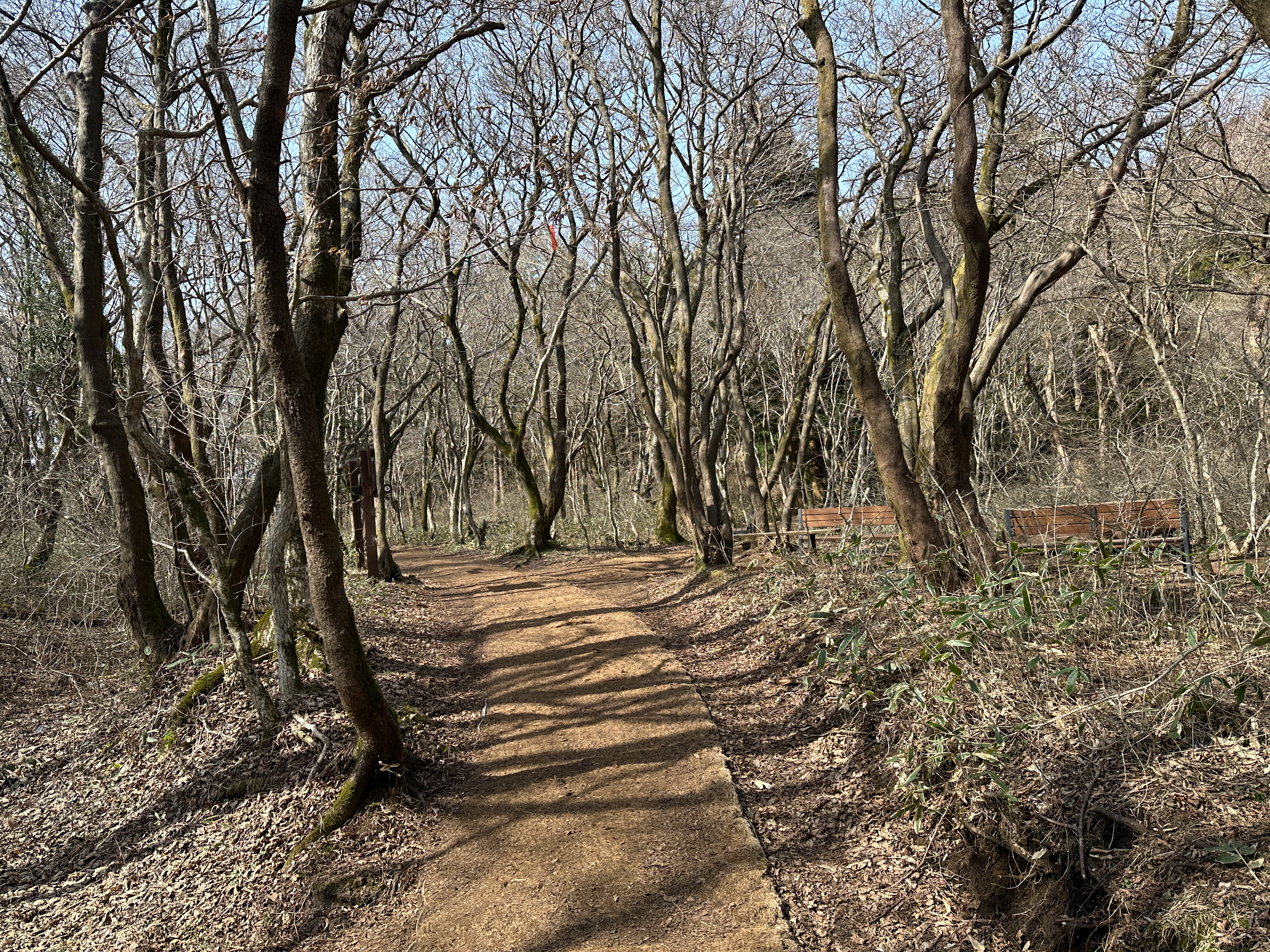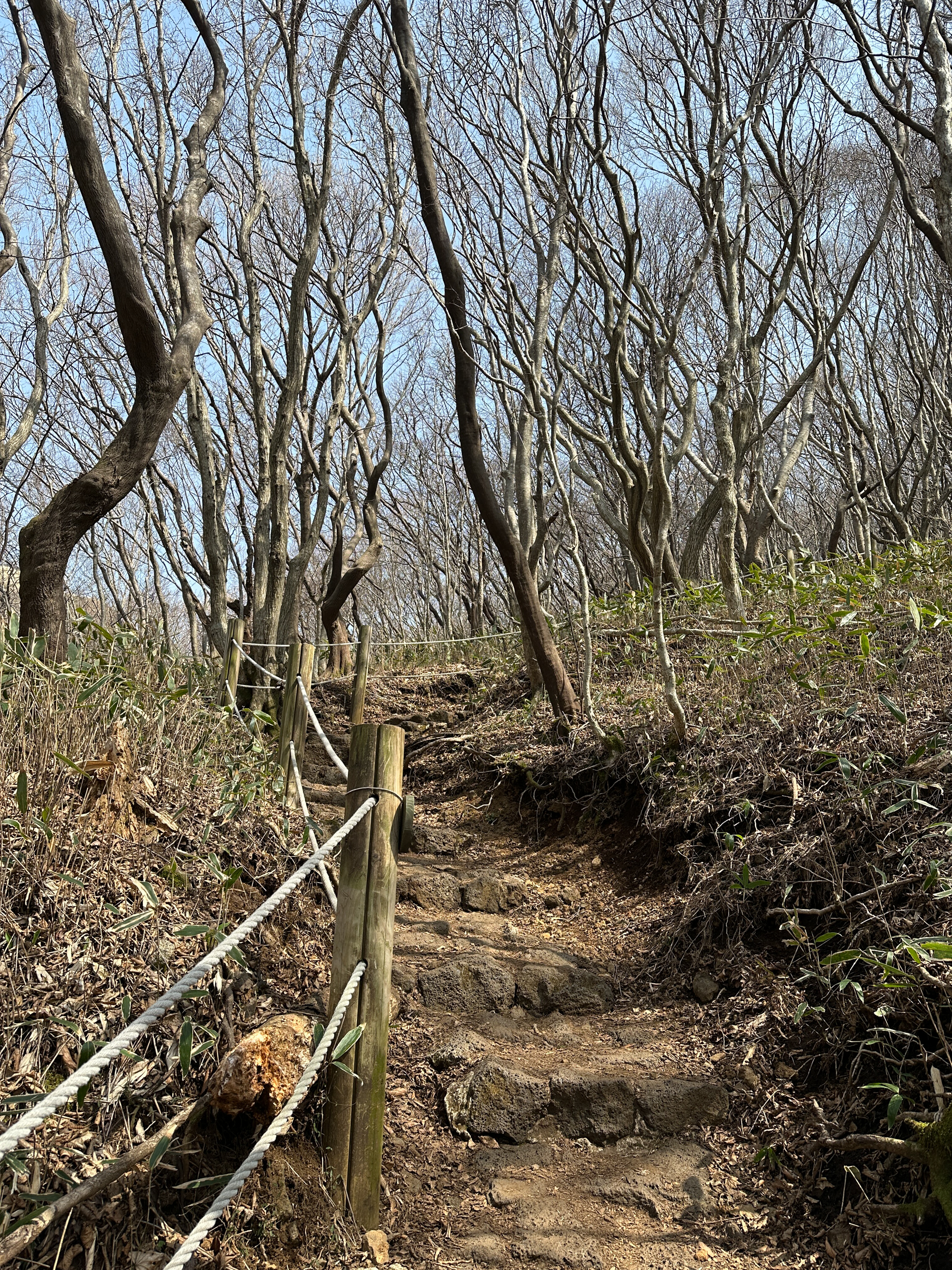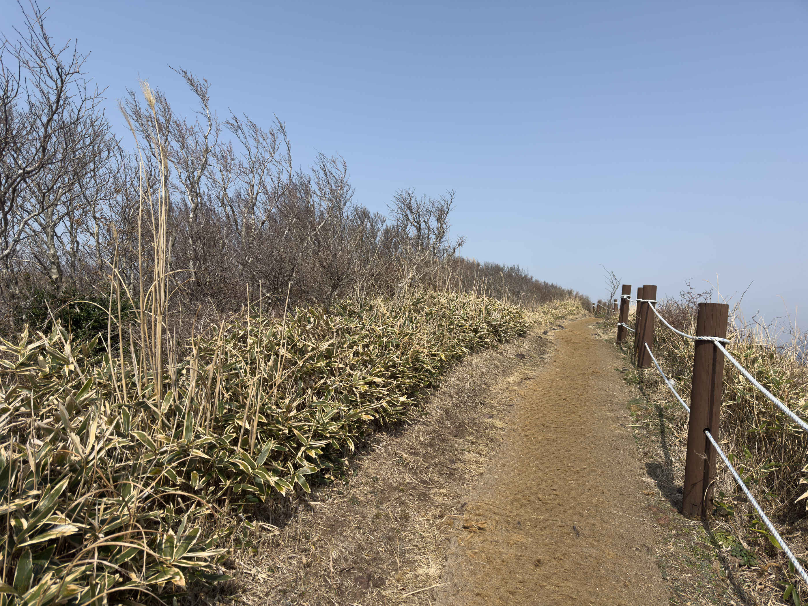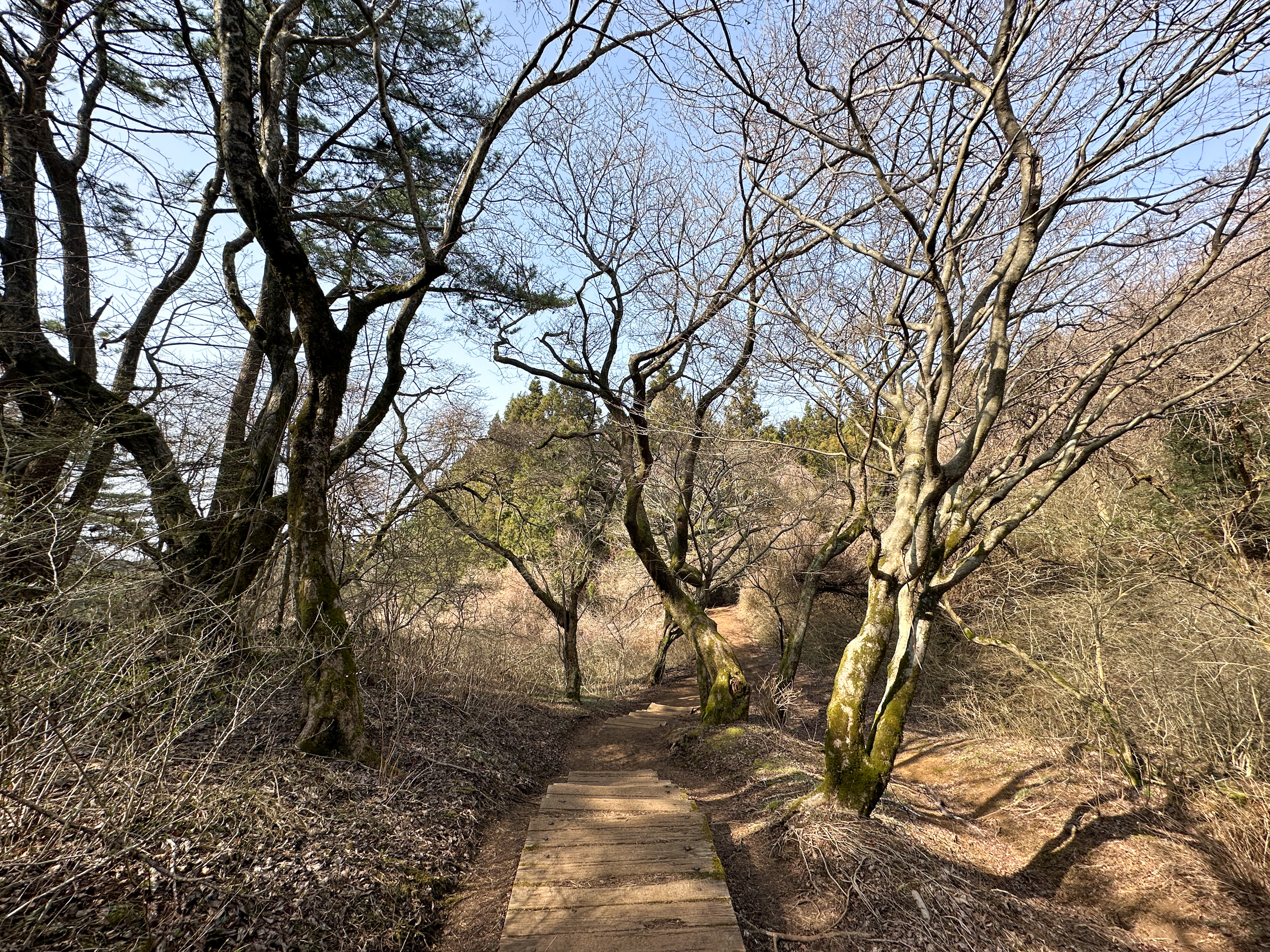 다시 올라 갈 때 장소에 도착했다. 제1쉼터에서 제2쉼터까지 가파른 경사길 10여분정도 외에는 큰 무리 없이 오를 수 있는 오름이다. 가을 처럼 청명한 날씨라면 능선부터 전망대까지 올라가며 볼 수 있는 정경은 환상적일텐데 하는 아쉬움이 든다.