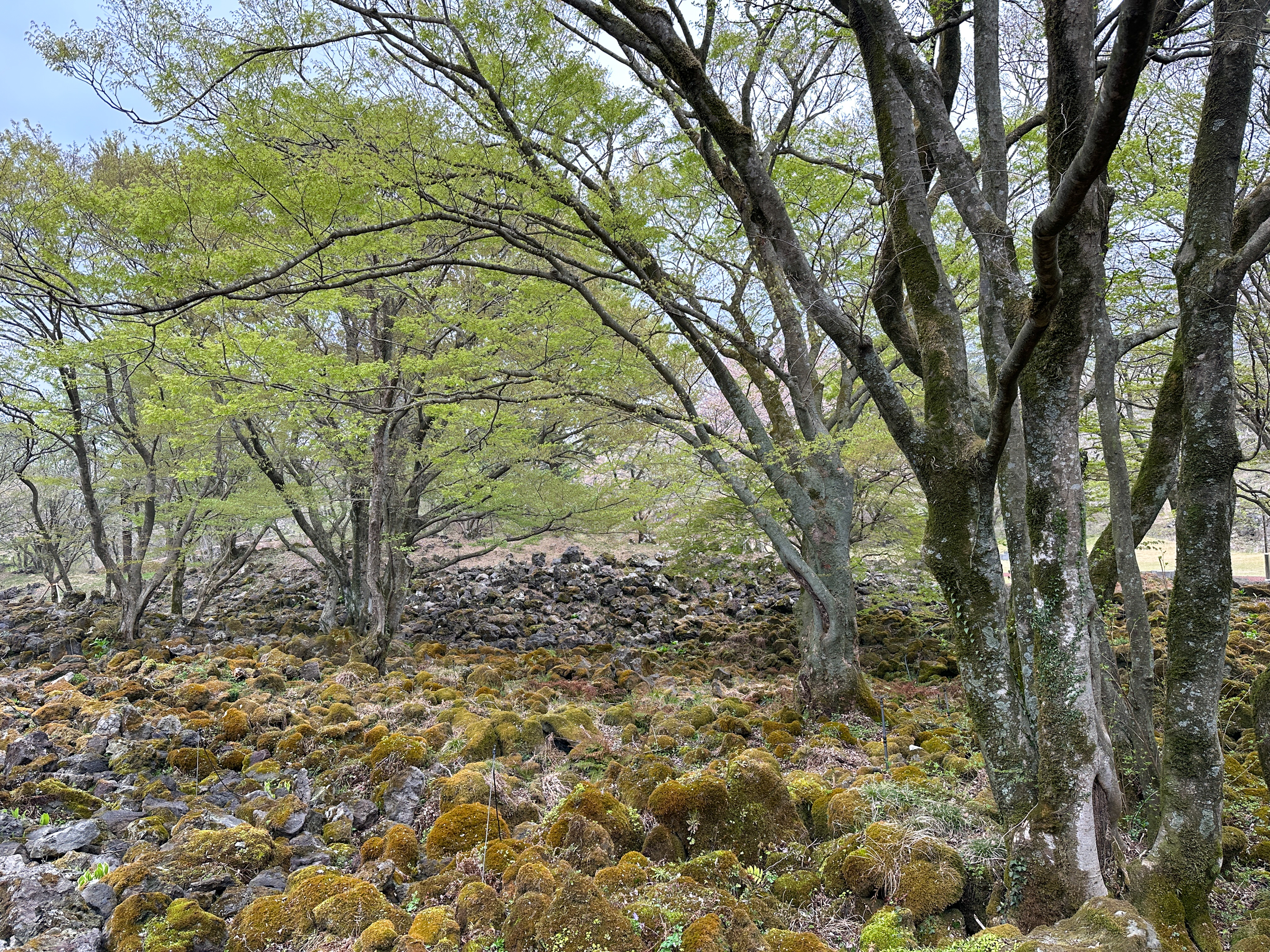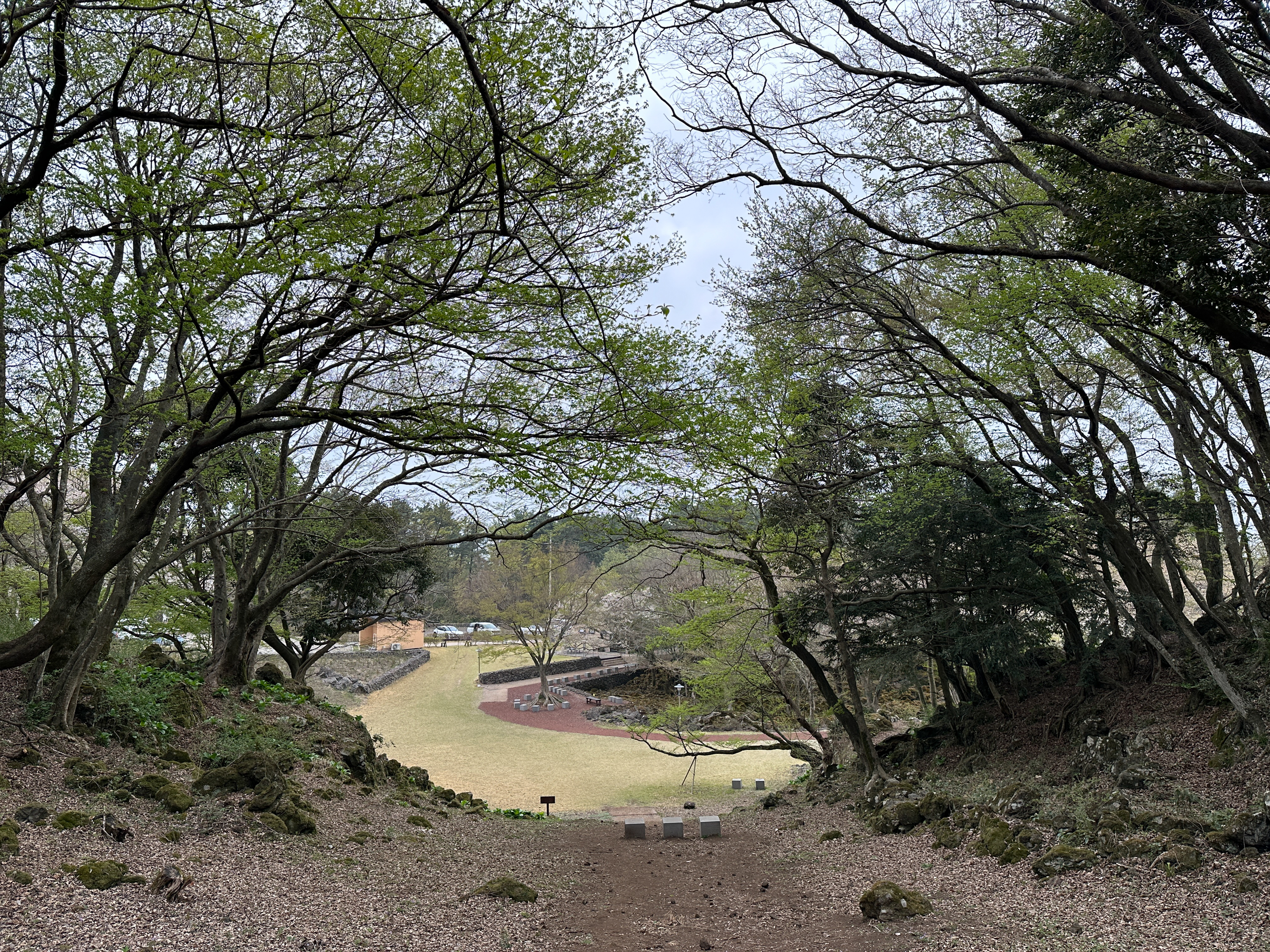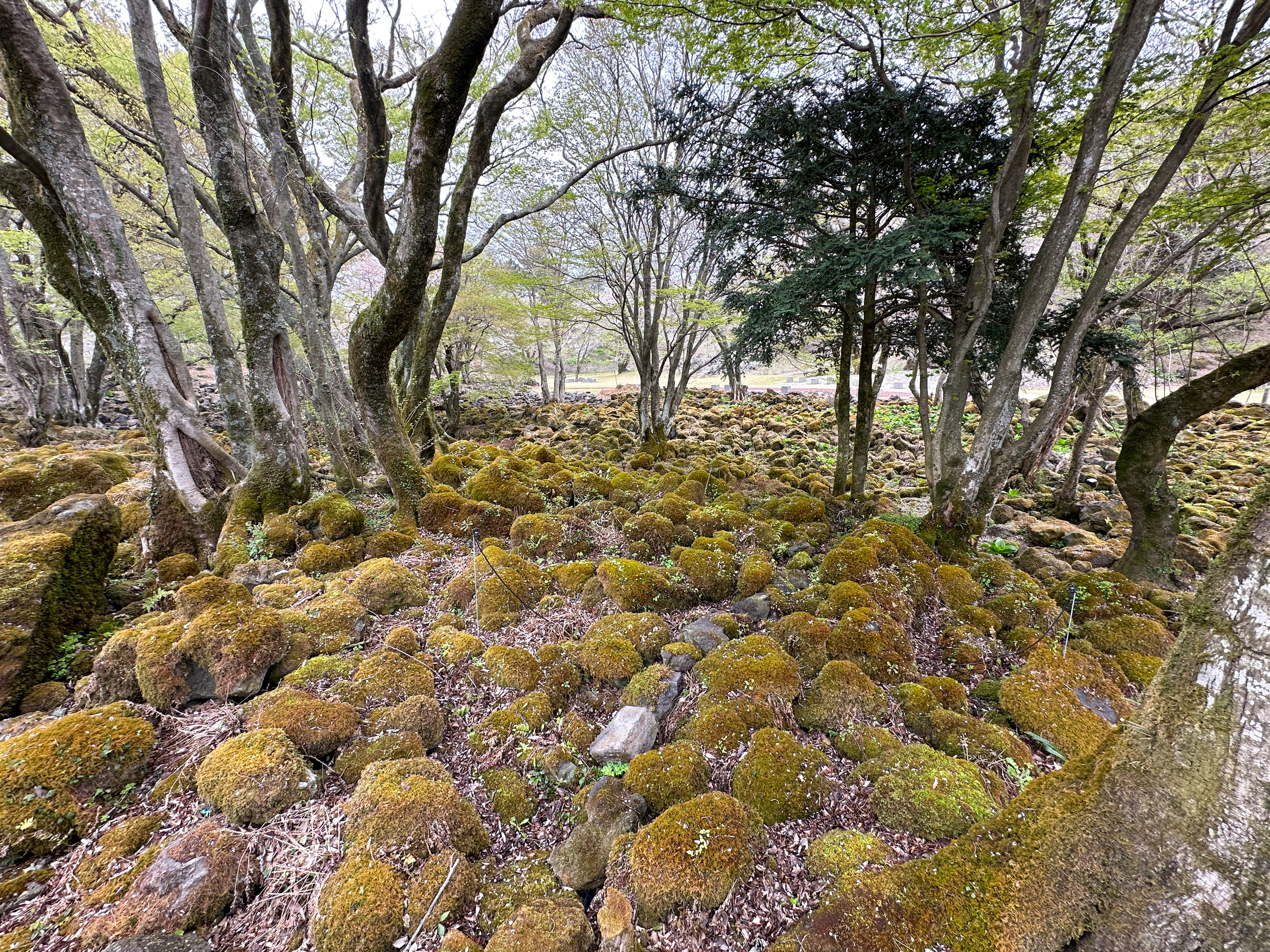 숲길은 카페에서 가깝게 바라 볼 수 있는 곶자왈풍의 이끼 숲 너머 산 길을 따라