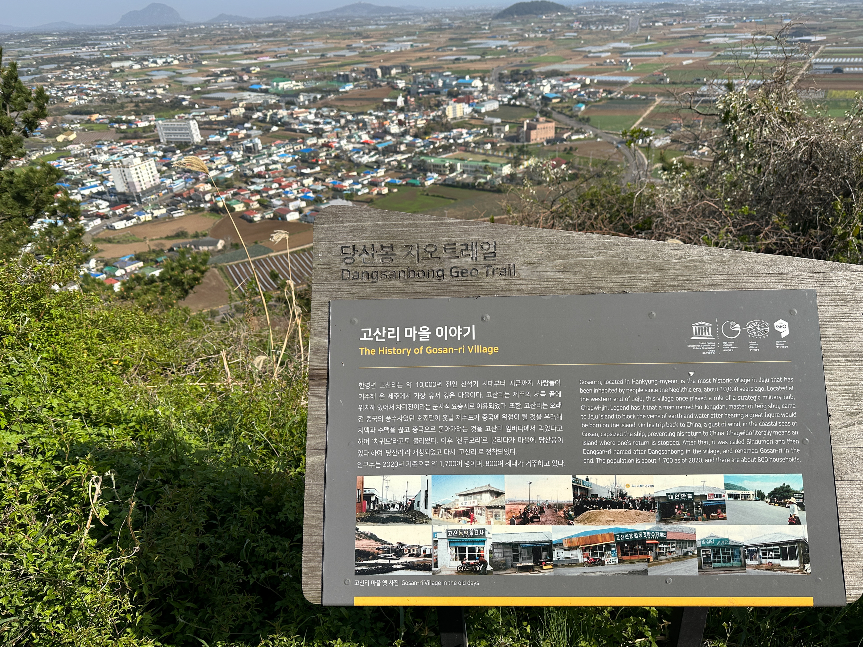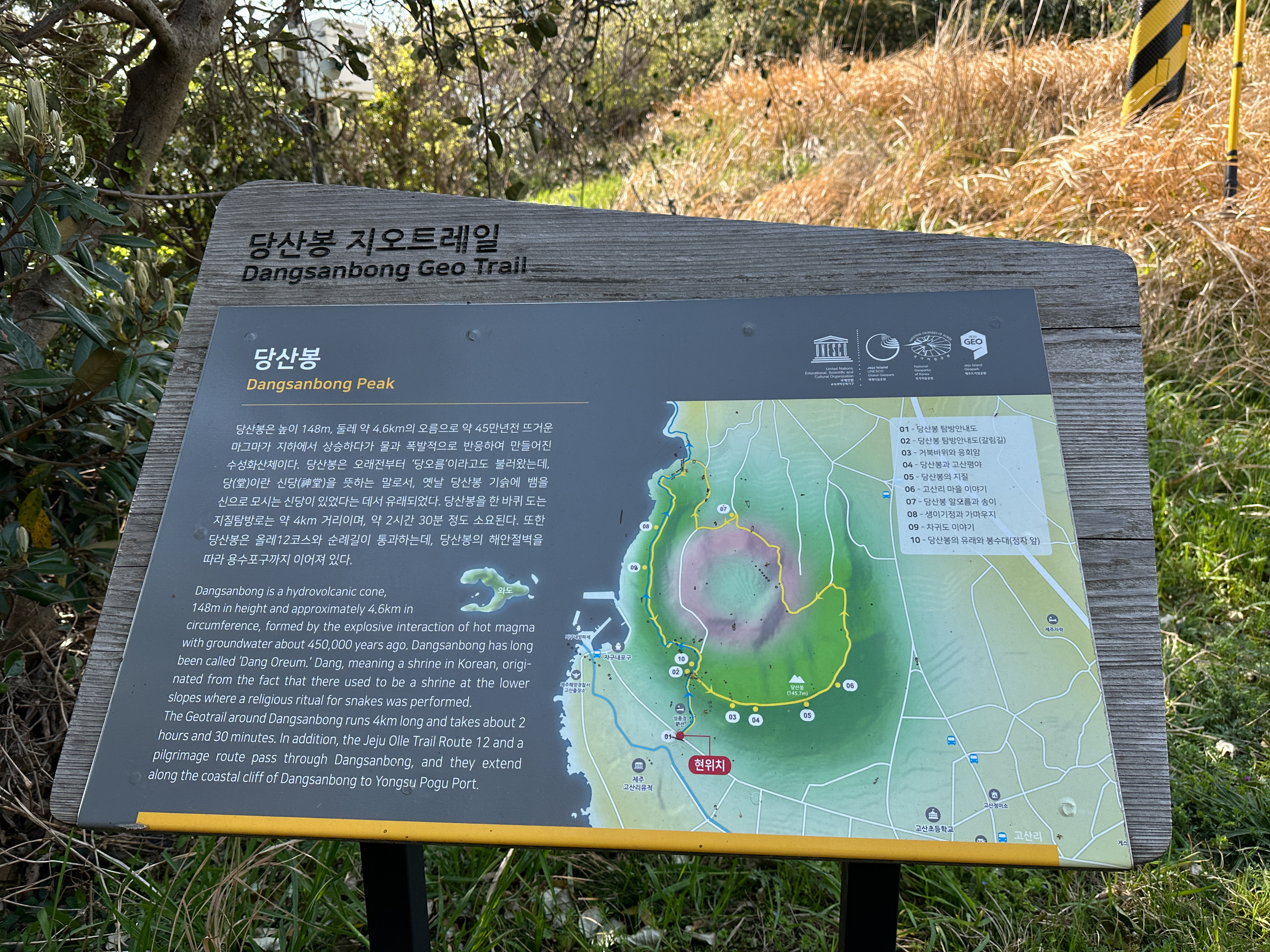 '당산봉'은 높이 148m, 둘레 약 4.6km의 오름으로 마그마가 지하에서 상승하다 물과 폭발적으로 반응하여 만들어진 수성화산체다.