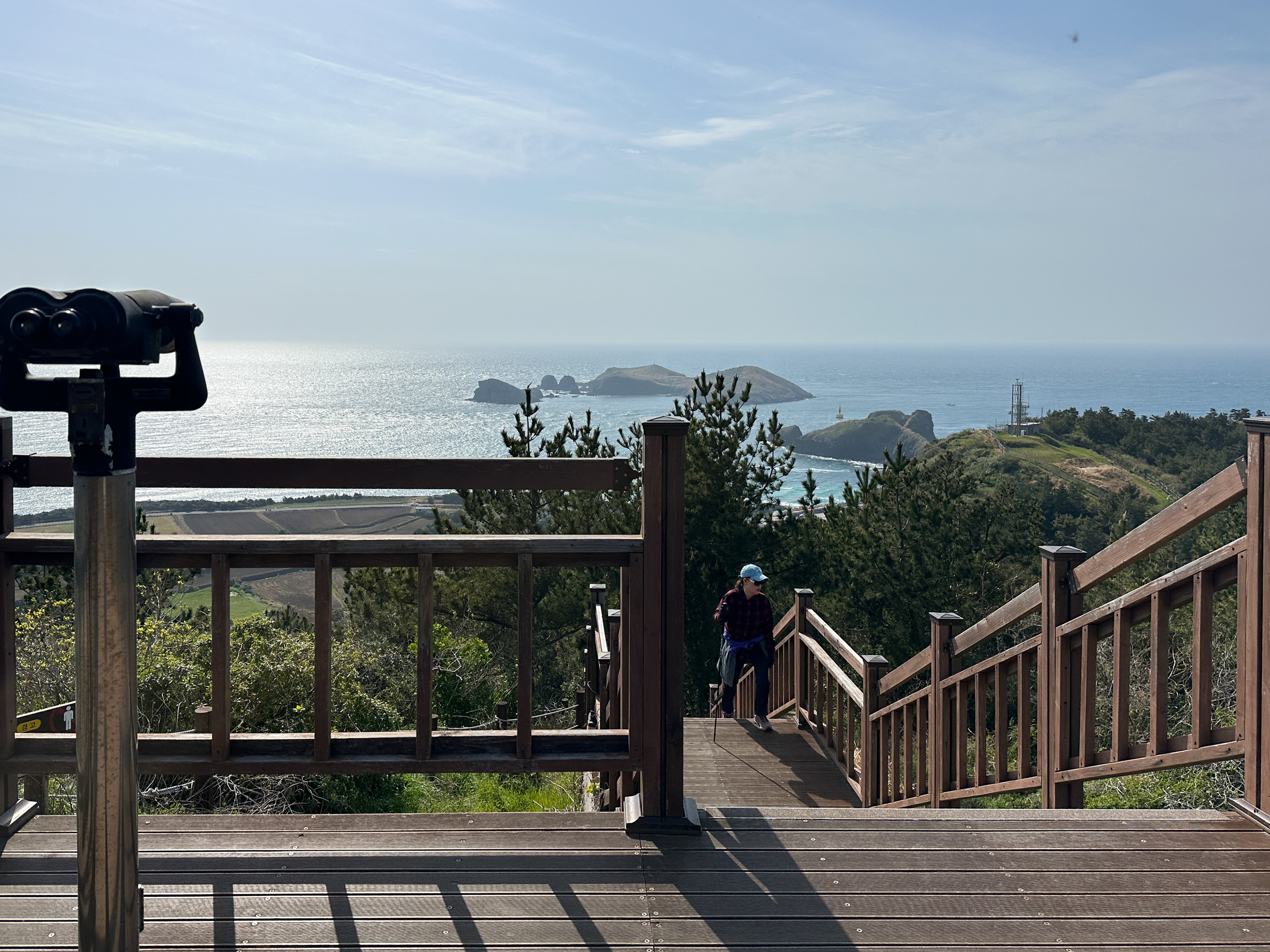 계단을 올라가면 망원경도 비치된 전망대다. 멀리 차귀도가 보인다.