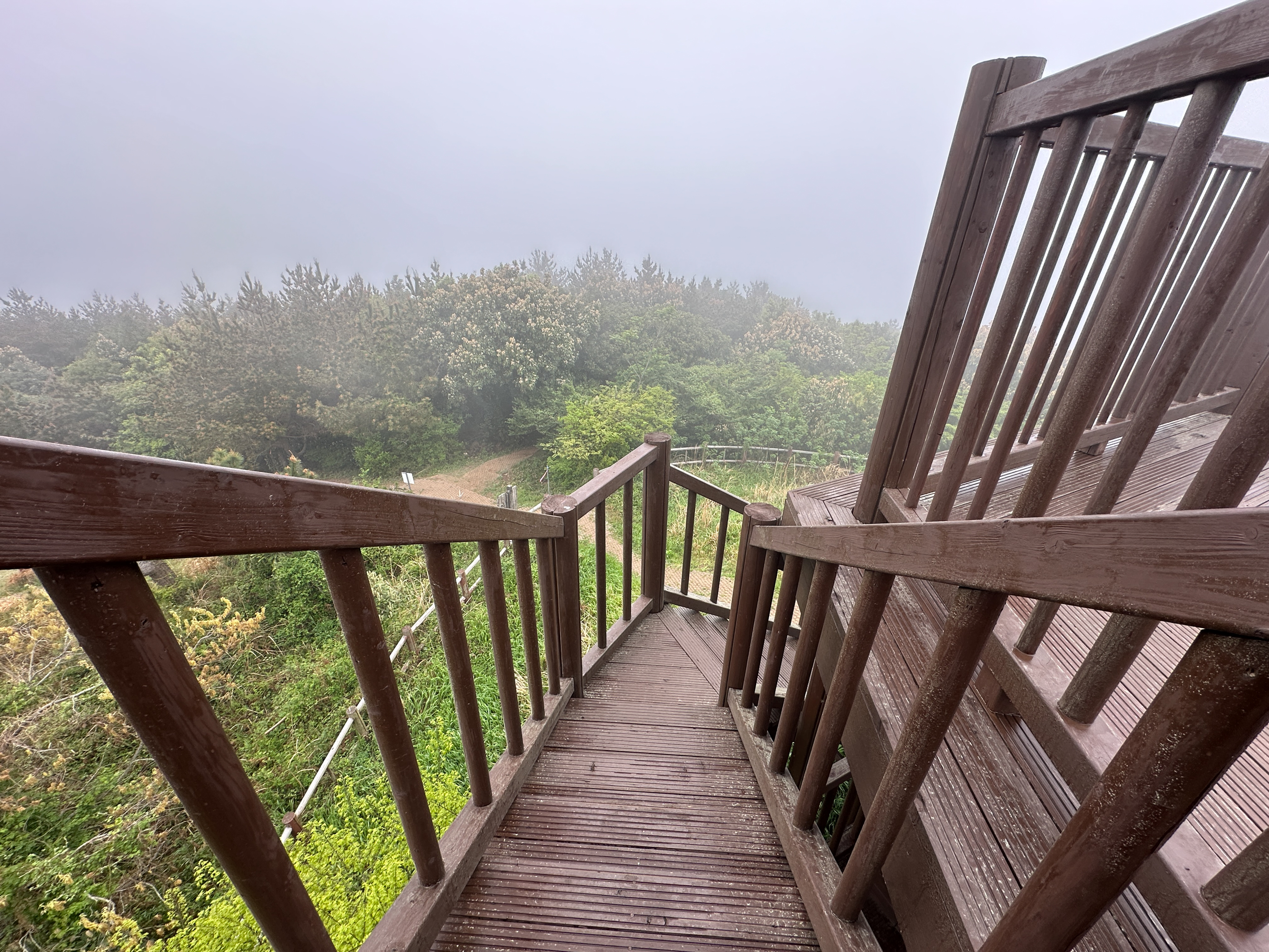 산 정상에 '중간스템프'가 있는 곳은 처음 인 듯 싶다. 9코스도 군산오름 정상 부근에 있긴하지만 정상은 아니였다. 산불초소 위 전망대를 올라갔지만 안개때문에 바로 밑 외에는 멀리 기대했던 전경을 볼 수가 없었다. 정상에서 만난 산불감시원도 멋진 뷰를 볼 수 없는 날이라 아쉬워했다. 대수산봉을 오르는 길은 4개인데 광치기에서 올라오는 길이 제일 힘들다고 알려준다.