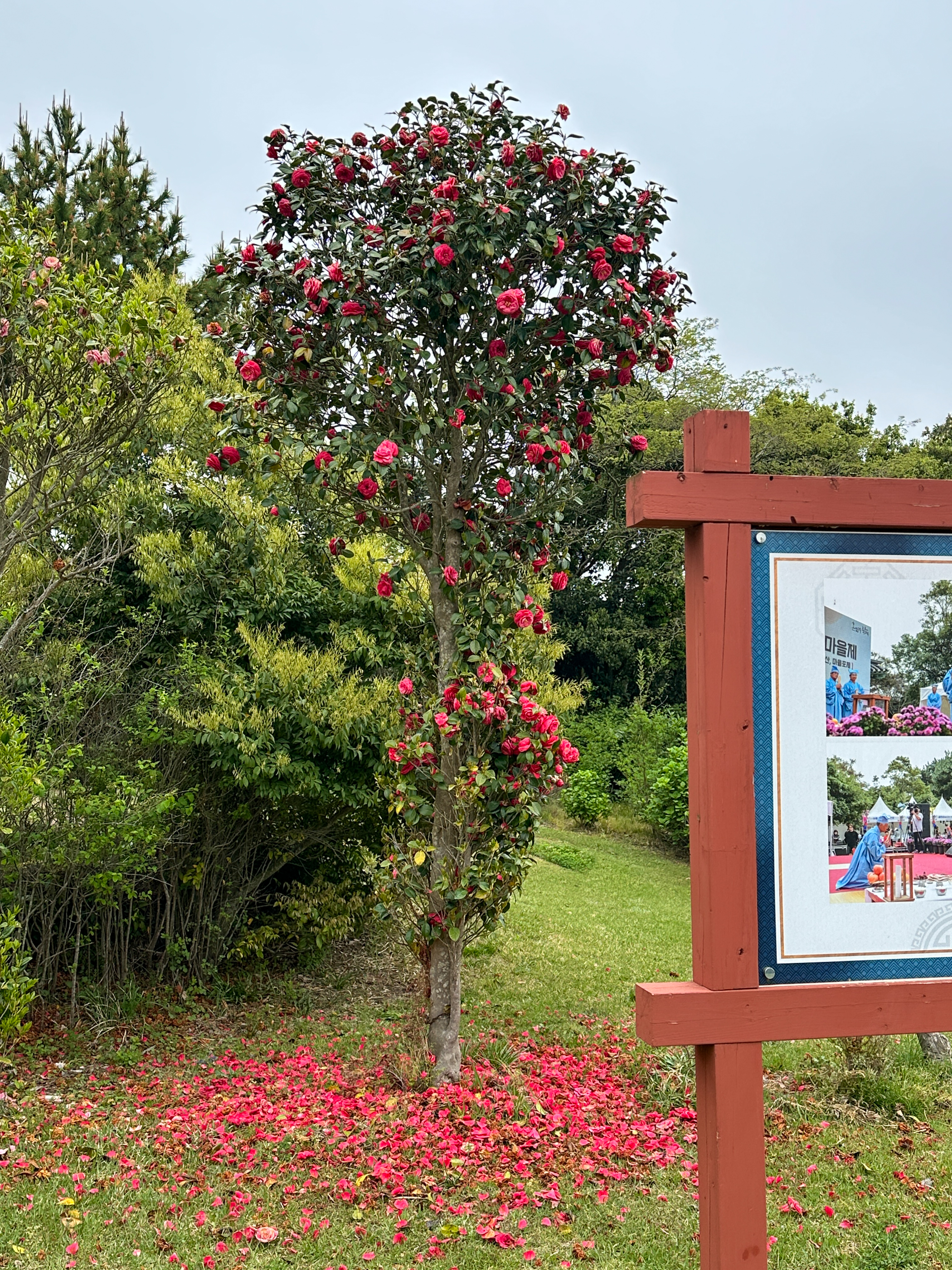 동백꽃 그리고 우산처럼 도로를 가리고 서 있느 나무, 팽나무인가? 팽나무는 제주어로 '폭낭'이라고 한다.