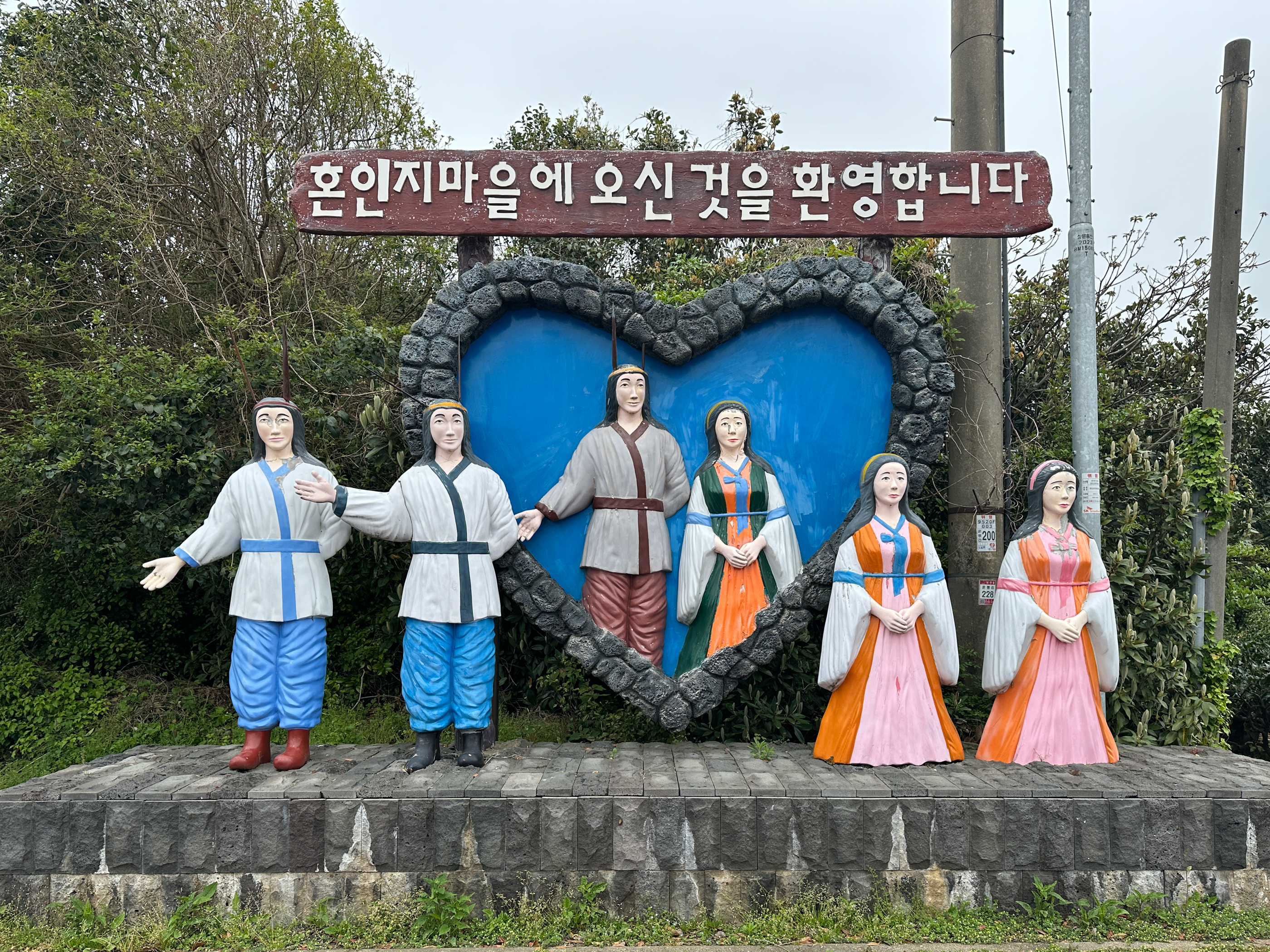 혼인지에서 빠져나와 일주도로로 나오니 혼인지마을 안내 조형물이 있다. 도로를 건너 해안도로로 나간다.