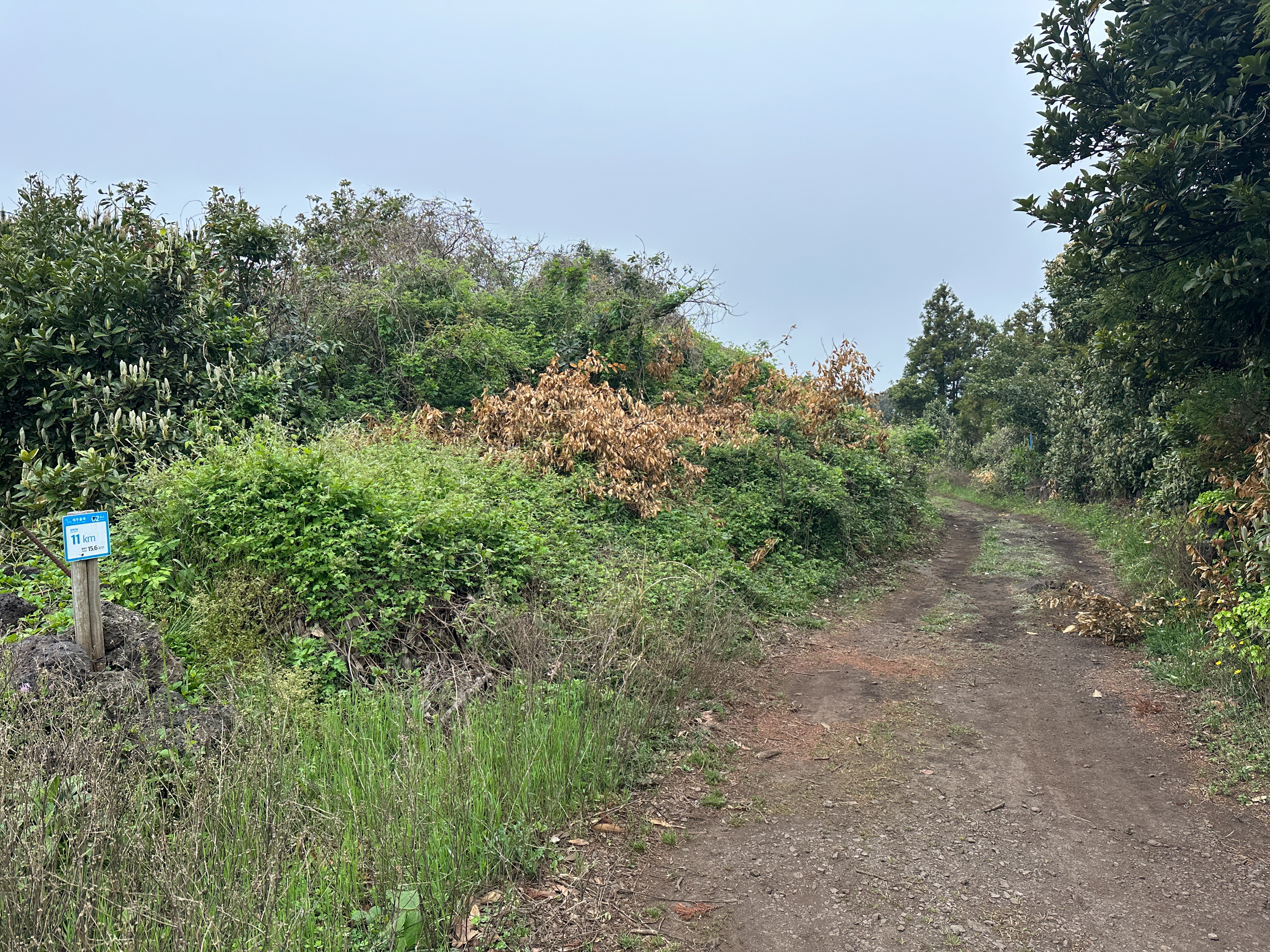 대수산봉에서 내려왔다. 오름입구 양편에 '올레길 지팡이' 보관통이 있는데 지팡이들은 분실되었는지 보이지 않았다.