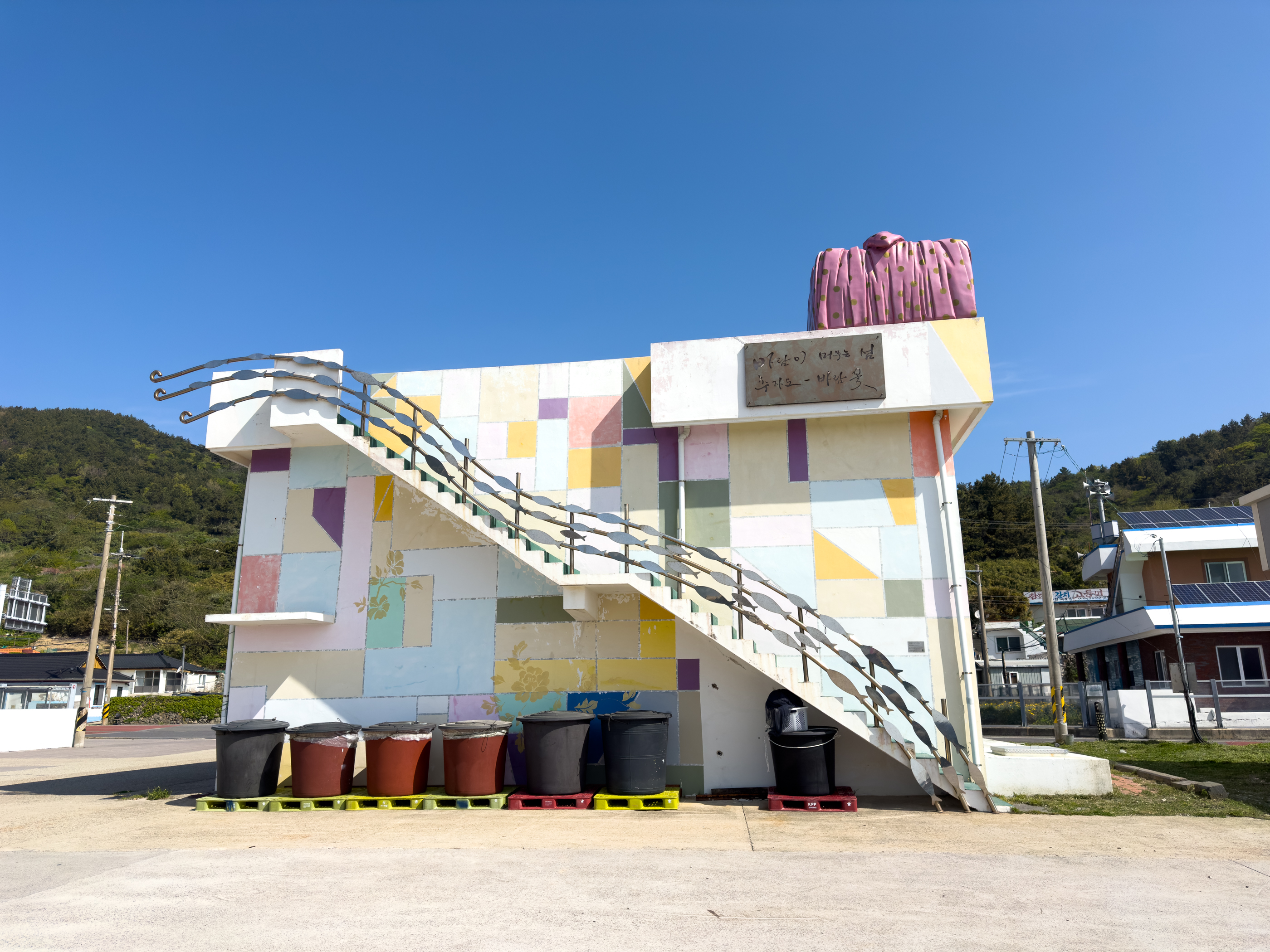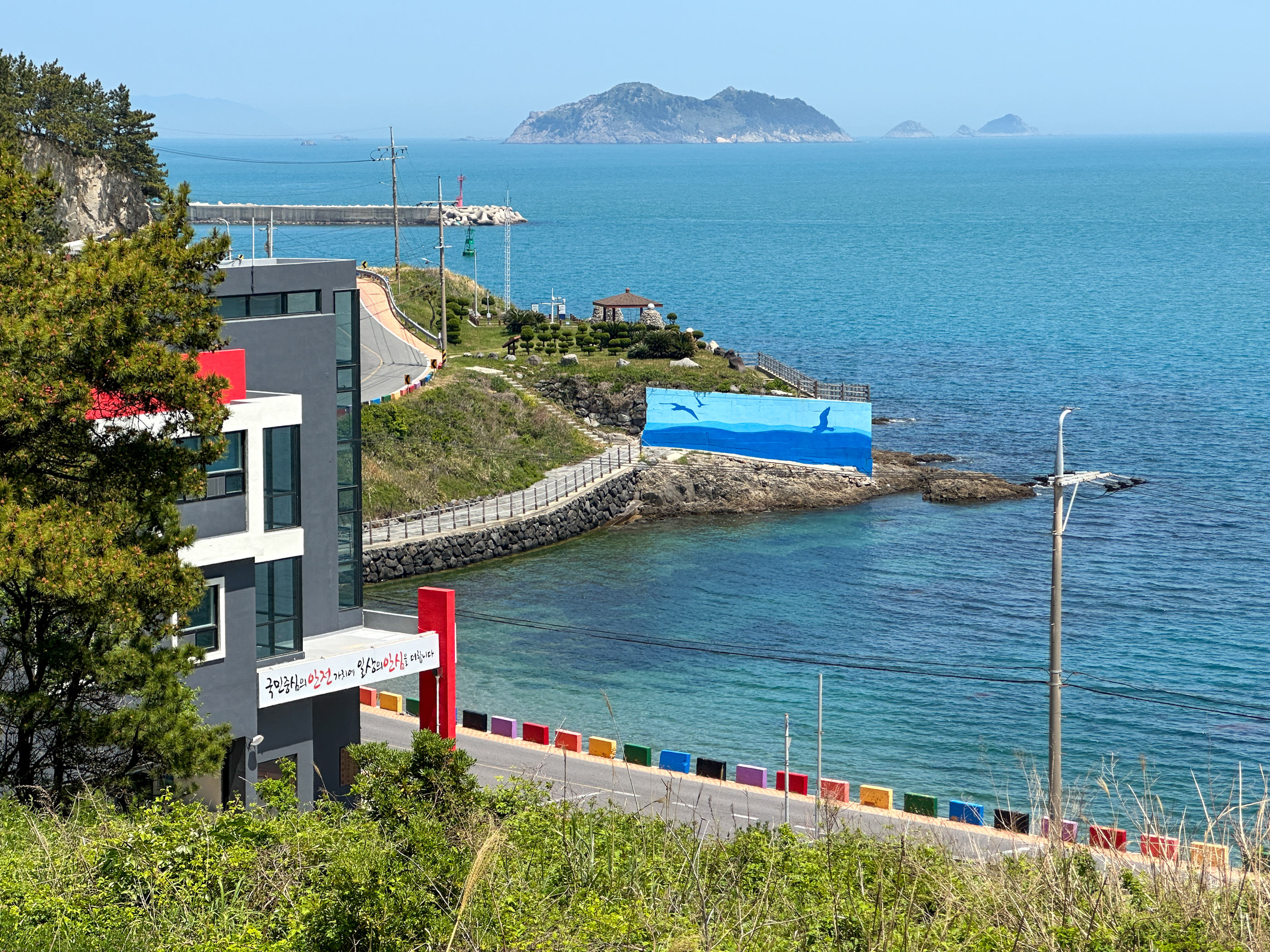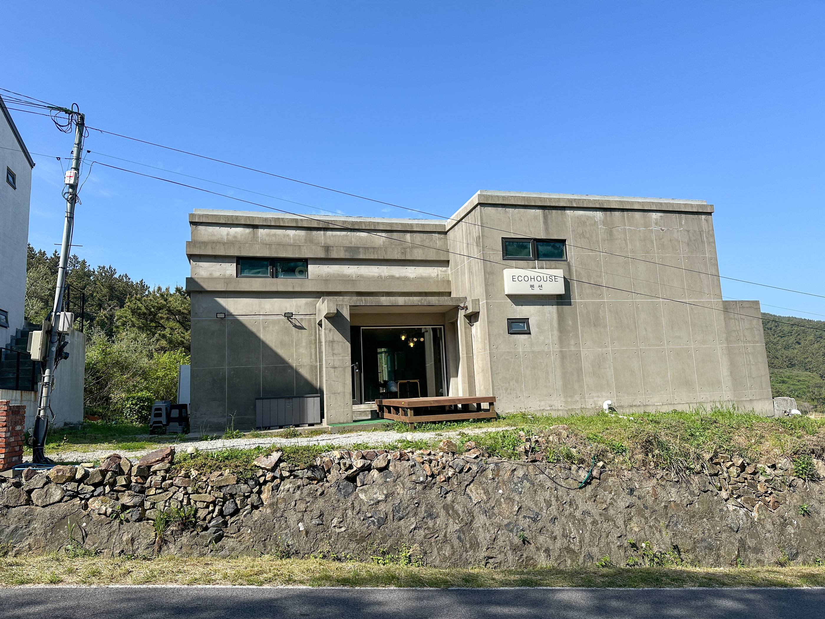 숙소와 버스를 타는 '돈대산입구' , 우리가 묵었던 곳은 발코니 쪽에서 바다가 보이는 '에코롯지1003호였다.