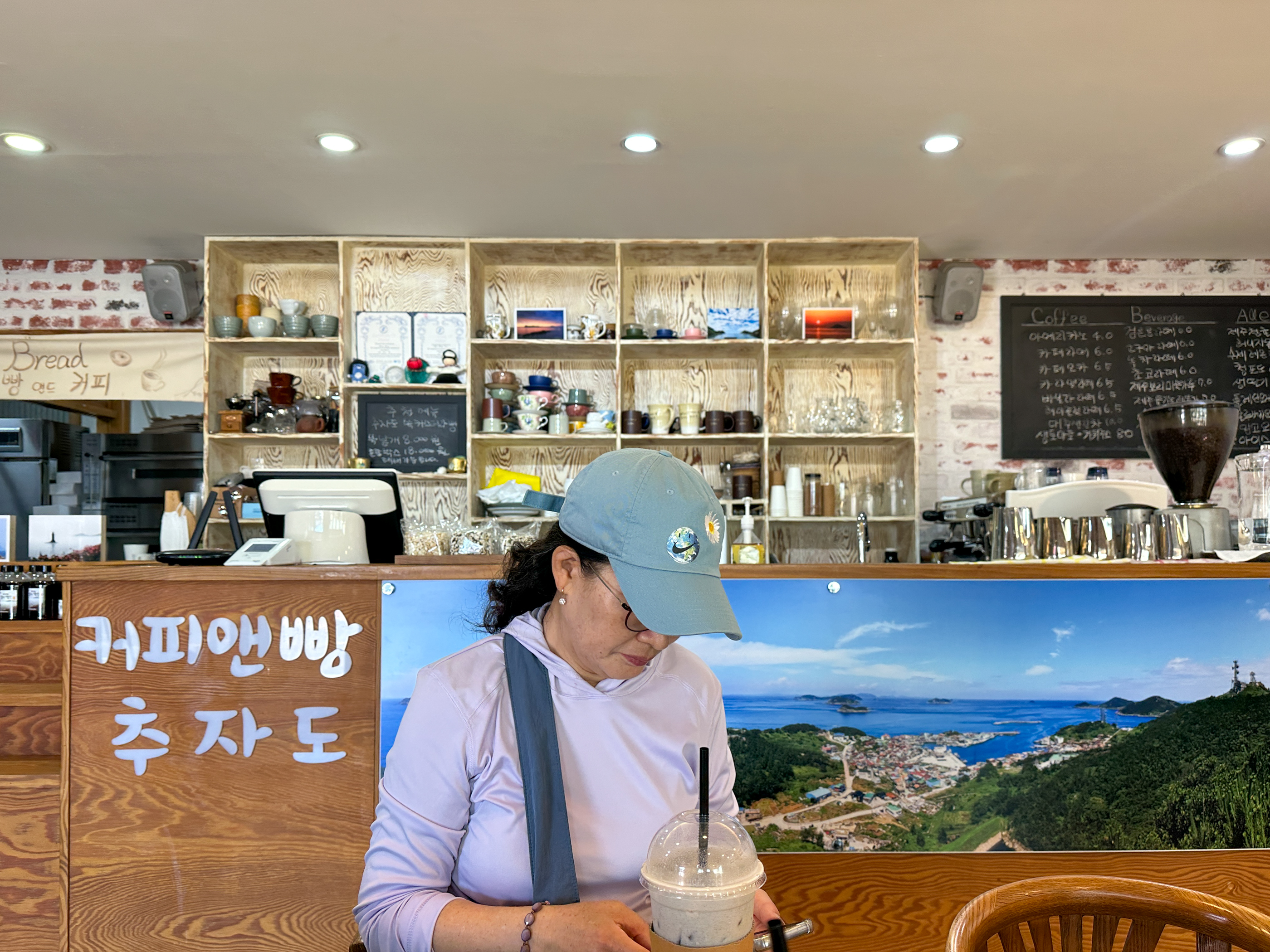 카페 운영은 10년쯤 되었다 하는데 이 지역에서는 제일 빠르다고 했다, 내부에 추자도 사진이 많아 본인 작품이냐고 물어보니까 옆 집에 있는 친구 작품들인데 전시회때 팔리지 않아 많이 사줬다고 했다.