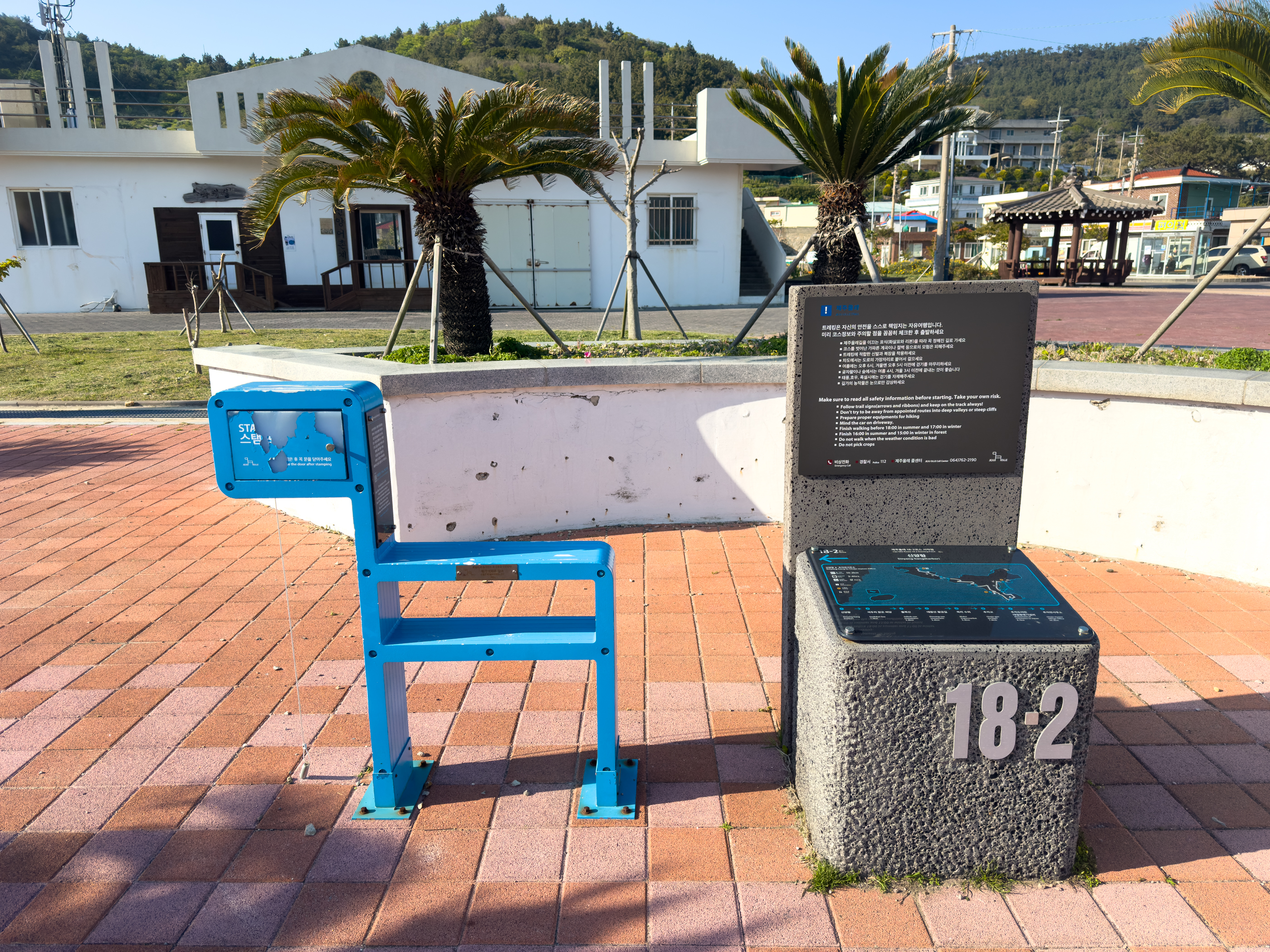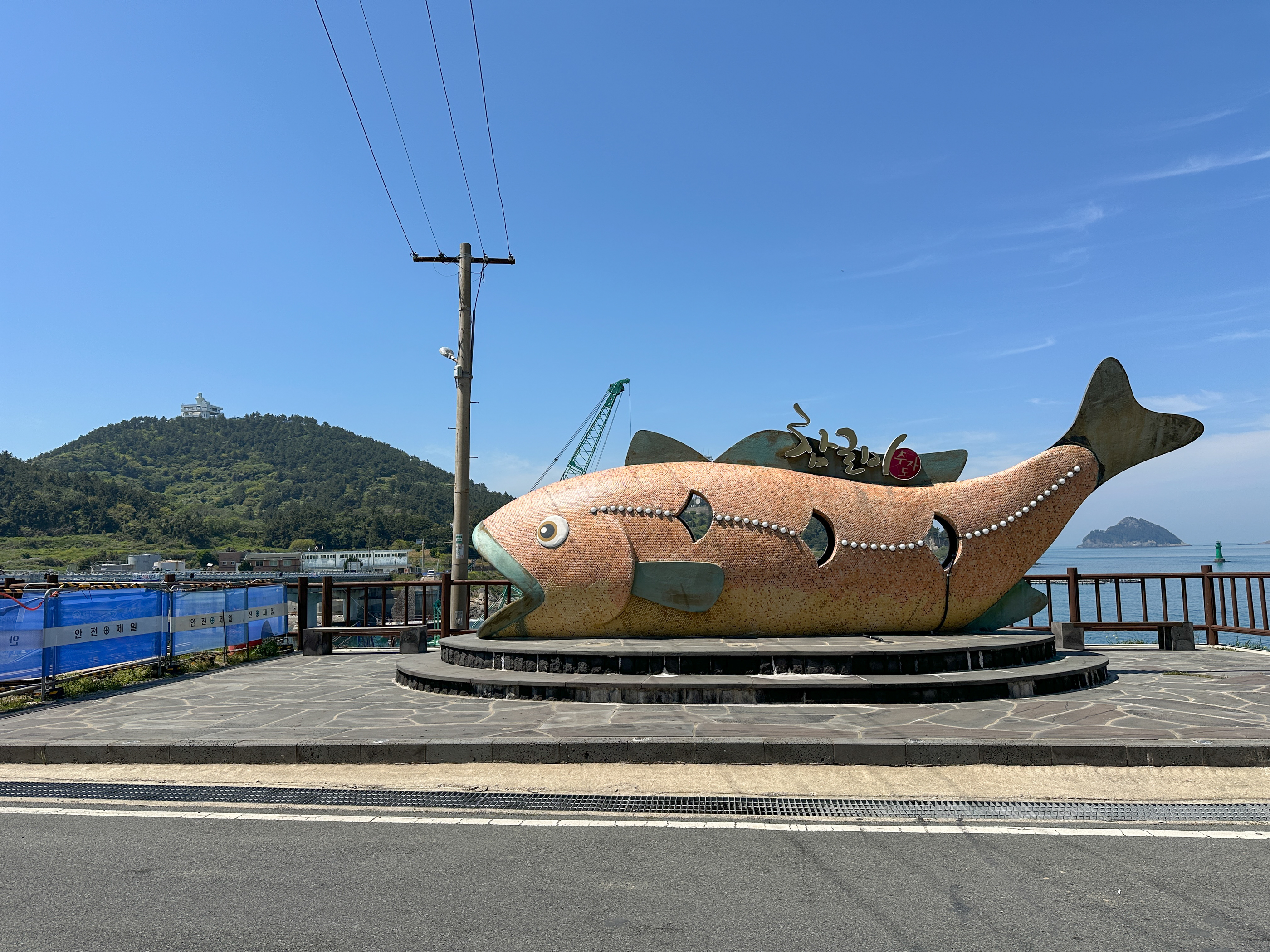 다리를 건너 18-1은 왼쪽 도로로, 18-2는 중앙에 보이는 계딘으로 올라간다. 추자도의 특산품 '참굴비 조형물'
